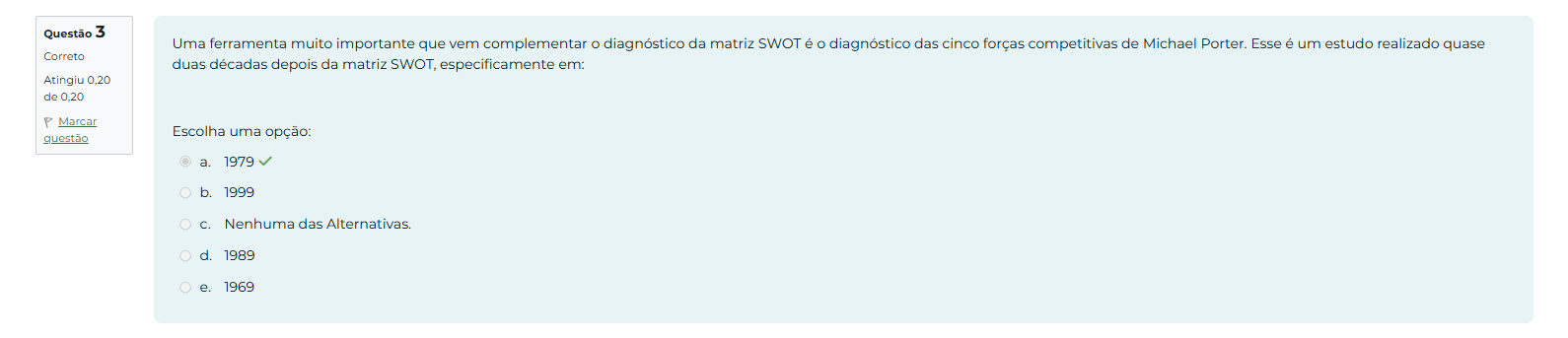 Questão 3 Uma ferramenta muito importante que vem complementar O diagnóstico da matriz SWOT é O diagnóstico das cinco forças competitivas de Michael Porter. Esse é um estudo realizado quase Correto duas décadas depois da matriz SWOT, especificamente em: Atingiu 0,20 de 0,20 P Marcar Escolha uma opção: a. 1979 b. 1999 C. Nenhuma das d. 1989 e. 1969