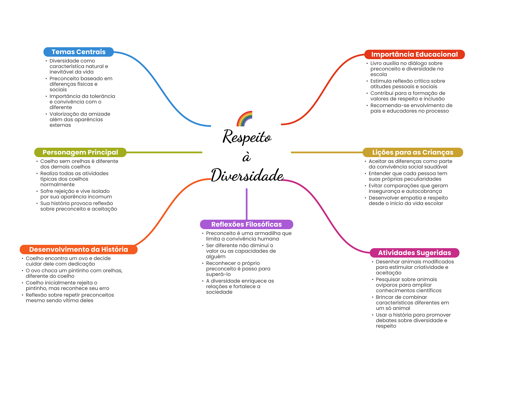 Temas Centrais Importância Educacional Diversidade como característica natural e Livro auxilia no diálogo sobre inevitável da vida preconceito e diversidade na escola Preconceito baseado em Estimula reflexão crítica sobre diferenças físicas e sociais atitudes pessoais e sociais Contribui para a formação de Importância da tolerância e convivência com valores de respeito e inclusão diferente Recomenda-se envolvimento de Valorização da amizade pais e educadores no processo além das aparências externas Respeito Personagem Principal à Lições para as Crianças Coelho sem orelhas é diferente Aceitar as diferenças como parte dos demais coelhos da convivência social saudável Realiza todas as atividades Diversidade Entender que cada pessoa tem típicas dos coelhos suas próprias peculiaridades normalmente Evitar comparações que geram Sofre rejeição e vive isolado insegurança e autocobrança por sua aparência incomum Desenvolver empatia e respeito Sua história provoca reflexão desde O início da vida escolar sobre preconceito e aceitação Reflexões Filosóficas Preconceito é uma armadilha que limita a convivência humana Ser diferente não diminui Desenvolvimento da História valor ou as capacidades de Atividades Sugeridas Coelho encontra um ovo e decide alguém cuidar dele com dedicação Reconhecer próprio Desenhar animais modificados ovo choca um pintinho com orelhas, preconceito é passo para para estimular criatividade e diferente do coelho superá-lo aceitação A diversidade enriquece as Pesquisar sobre animais Coelho inicialmente rejeita relações e fortalece a ovíparos para ampliar pintinho, mas reconhece seu erro sociedade conhecimentos científicos Reflexão sobre repetir preconceitos Brincar de combinar mesmo sendo vítima deles características diferentes em um só animal Usar a história para promover debates sobre diversidade e respeito