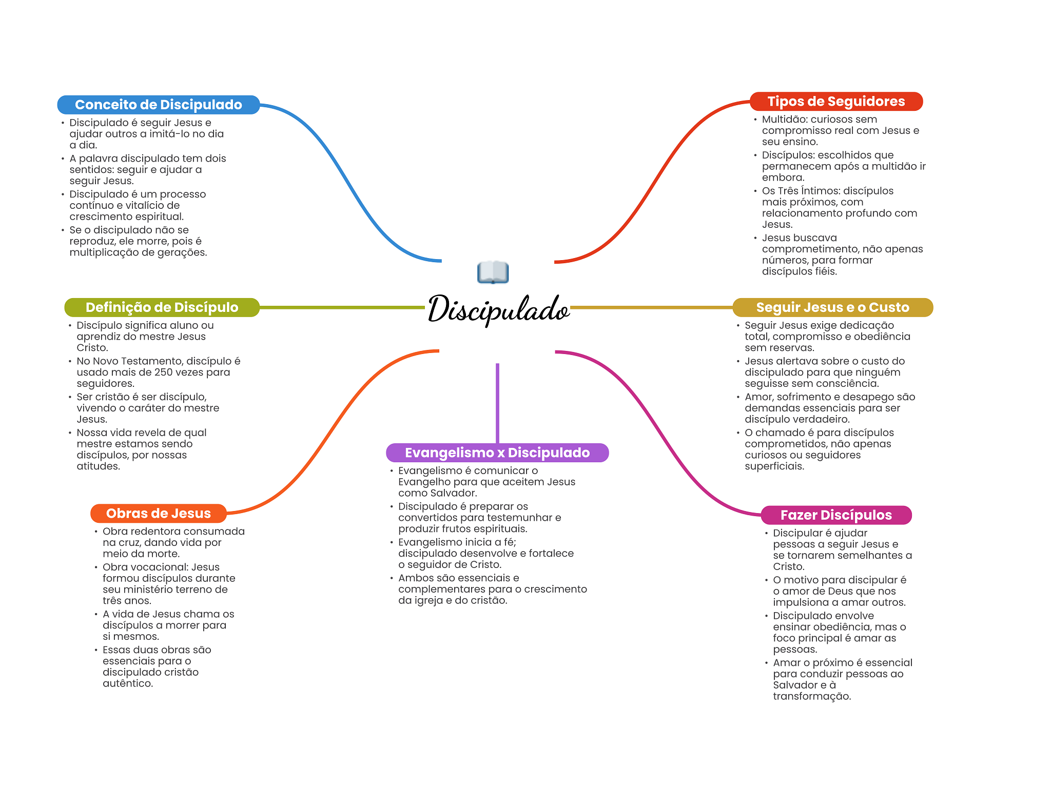 Conceito de Discipulado Tipos de Seguidores Discipulado é seguir Jesus e Multidão: curiosos sem ajudar outros a imitá-lo no dia compromisso real com Jesus e a dia. seu ensino. A palavra discipulado tem dois Discípulos: escolhidos que sentidos: seguir e ajudar a permanecem após a multidão ir seguir Jesus. embora. Discipulado é um processo Os Três Intimos: discípulos contínuo e vitalício de mais próximos, com crescimento espiritual. relacionamento profundo com Jesus. Se discipulado não se reproduz, ele morre, pois é Jesus buscava multiplicação de gerações. comprometimento, não apenas números, para formar discípulos fiéis. Definição de Discípulo Discipulado Seguir Jesus e Custo Discípulo significa aluno ou Seguir Jesus exige dedicação aprendiz do mestre Jesus total, compromisso e obediência Cristo. sem reservas. No Novo Testamento, discípulo é Jesus alertava sobre O custo do usado mais de 250 vezes para discipulado para que ninguém seguidores. seguisse sem consciência. Ser cristão é ser discípulo, Amor, sofrimento e desapego são vivendo caráter do mestre demandas essenciais para ser Jesus. discípulo verdadeiro. Nossa vida revela de qual chamado é para discípulos mestre estamos sendo comprometidos, não apenas discípulos, por nossas Evangelismo Discipulado curiosos ou seguidores atitudes. Evangelismo é comunicar superficiais. Evangelho para que aceitem Jesus como Salvador. Obras de Jesus Discipulado é preparar convertidos para testemunhar e Fazer Discípulos Obra redentora consumada produzir frutos espirituais. Discipular é ajudar na cruz, dando vida por Evangelismo inicia a fé; pessoas a seguir Jesus e meio da morte. discipulado desenvolve e fortalece se tornarem semelhantes a Obra vocacional: Jesus seguidor de Cristo. Cristo. formou discípulos durante Ambos são essenciais e motivo para discipular é seu ministério terreno de complementares para crescimento amor de Deus que nos três anos. da igreja e do cristão. impulsiona a amar outros. A vida de Jesus chama Discipulado envolve discípulos a morrer para ensinar obediência, mas si mesmos. foco principal é amar as Essas duas obras são pessoas. essenciais para Amar próximo é essencial discipulado cristão para conduzir pessoas ao autêntico. Salvador e à transformação.