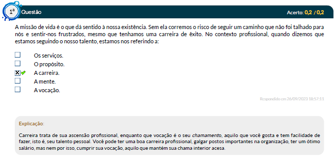 Questão Acerto: A missão de vida 0 que dá sentido à nossa Sem ela corremos 0 risco de seguir um caminho que não foi talhado para nos e sentir-nos frustrados, mesmo que tenhamos uma carreira de No contexto profissional, quando dizemos que estamos seguindo nosso talento, estamos nos referindo a: Os serviços. O propósito. X A carreira. A mente. Respondido cm 26/09/2023 18:57:11 Explicação: Carreira trata de sua ascensão profissional, enquanto que vocação 0 seu chamamento, aquilo que gosta e tem facilidade de fazer, isto seu talento pode ter uma boa carreira profissional, galgar postos importantes na organização, ter um salário, mas nem por isso, cumprir sua vocação, aquilo que mantém sua chama interior acesa
