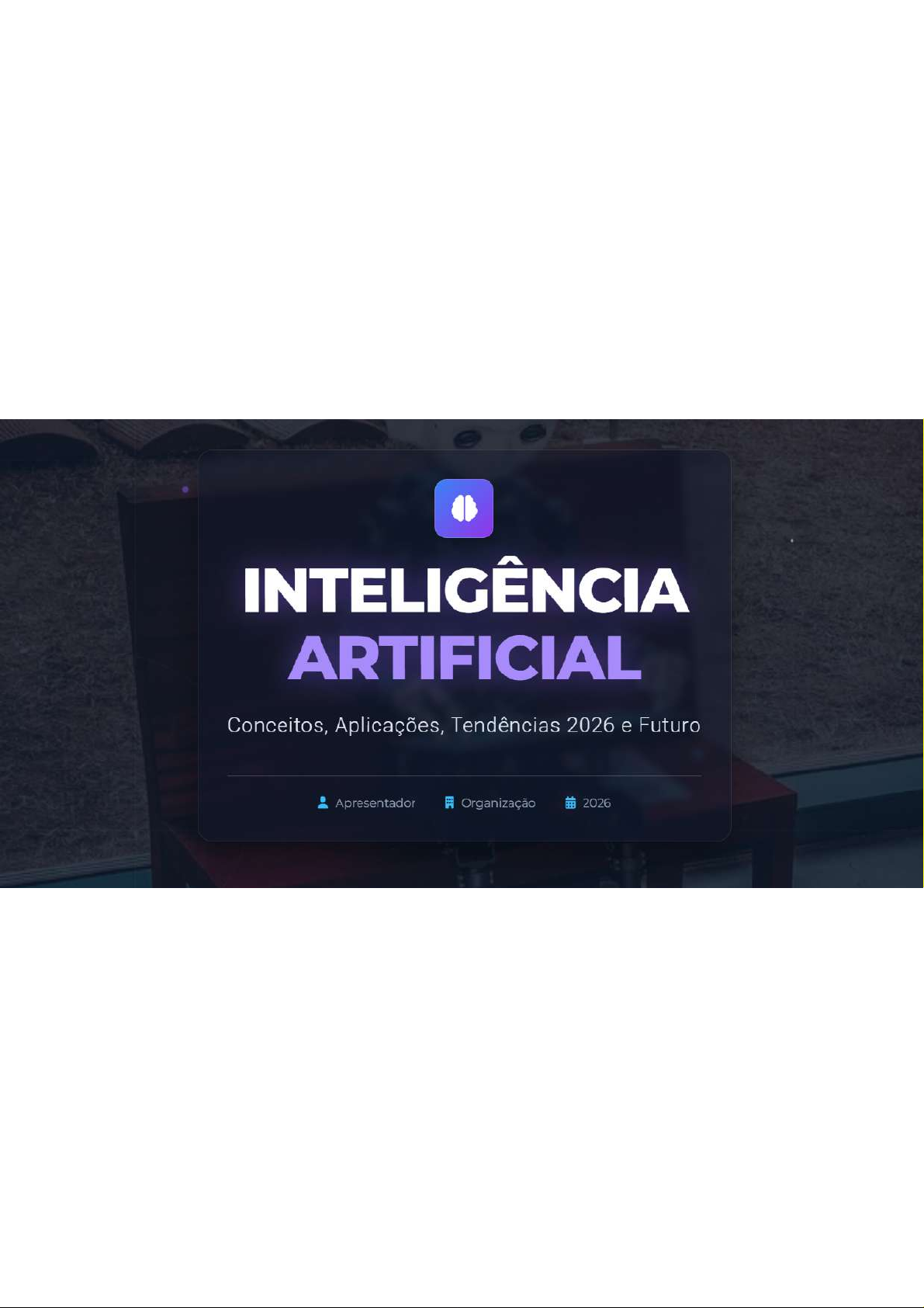 INTELIGÊNCIA ARTIFICIAL Conceitos, Aplicações, Tendências 2026 e Futuro Apresentador Organização 2026que é IA? Conceito & Evolução INTELIGÊNCIA ARTIFICIAL DEFINIÇÃO MACHINE LEARNING Sistemas computacionais capazes de perceber ambiente, raciocinar sobre conhecimento, aprender com dados e agir para atingir objetivos. DEEP LEARNING ABORDAGEM PRINCIPAL AVANÇO RECENTE Machine Learning Generative (LLMs) LINHA DO TEMPO EVOLUTIVA 1956 1990s 2012 2017 2022 2026 Agentic 0 Início Era dos Dados Deep Learning Transformers GenAl Boom Sistemas Conferência de Machine Learning AlexNet revoluciona Arquitetura base ChatGPT populariza autônomos e Dartmouth define estatístico ganha a visão para as IAs IA generativa multimodais termo "IA" força computacional modernas (Google) globalmenteAplicações e Tendências 2026 Visão Geral APLICAÇÕES NO MUNDO REAL TOP TENDÊNCIAS 2026 01 Agentic AI AUTONOMIA & OBJETIVOS Saúde & Diagnóstico Educação 4.0 Indústria Inteligente Suporte a decisão clínica, Tutores personalizados Manutenção preditiva triagem automatizada e adaptativos e avaliação avançada, robótica 02 GenAl Multimodal TEXTO ÁUDIO democratização do acesso a formativa em tempo real para colaborativa e otimização diagnósticos complexos. alunos e professores. autônoma de cadeias de suprimentos. 03 IA + Robótica MUNDO REAL 04 Edge AI Híbrida PROCESSAMENTO LOCAL Finanças & Risco Marketing & Atendimento & 05 Regulação & Ética GOVERNANÇA GLOBAL Detecção de fraudes em Conteúdo Assistentes virtuais resolutivos milissegundos, análise de Geração de campanhas (agentes) que executam ações crédito hiper-segmentada e multimodais em escala e complexas ao invés de apenas 06 Colaboração Humano-IA consultoria automatizada. personalização da jornada do COPILOTOS INTEGRADOS cliente.Impactos na Sociedade Balanço & Perspectivas OPORTUNIDADES DESAFIOS BENEFÍCIOS & AVANÇOS RISCOS & ATENÇÃO Produtividade Exponencial Deslocamento de Trabalho Automação de tarefas repetitivas libera potencial humano para atividades Obsolescência rápida de certas habilidades técnicas, exigindo programas criativas, estratégicas e de alto valor agregado. urgentes e massivos de requalificação profissional. Novas Profissões e Mercados Viés e Privacidade Criação de novas funções como Engenheiros de Prompt, Curadores de Dados vs Riscos de discriminação algorítmica oculta (caixa preta) e uso indevido de e Especialistas em Ética de IA. dados pessoais para manipulação comportamental. * Inclusão e Acesso Regulação e Controle Democratização de serviços essenciais (saúde, educação, direito) através de Dificuldade legislativa em acompanhar a velocidade da inovação, criando consultores virtuais de baixo custo e alta disponibilidade. lacunas de responsabilização em casos de erro da IA.Futuro da IA Roadmap & Visão HORIZONTE TECNOLÓGICO PRÓXIMOS PASSOS 1 Definir Estratégia Identificar casos de uso de alto impacto e baixo risco para priorização inicial. Modelos Multimodais Agentes Autônomos Fusão nativa de texto, código, e vídeo Transição de chatbots passivos para sistemas 2 em um único digital para compreensão "agentic" que planejam, usam ferramentas e Preparar Dados contextual profunda. executam tarefas complexas sozinhos. Organizar infraestrutura, garantir qualidade dos dados e estabelecer governança 3 Pilotos Rápidos Lançar MVPS, medir ROI real e escalar soluções validadas com agilidade. IA Física Computação Quântica Convergência com a robótica (humanoides e drones) Aceleração exponencial treinamento de modelos trazendo avançada para com 0 mundo físico. e resolução de problemas de otimização complexos. Security by Design Requalificação Humana Governança, ética e conformidade desde Foco total em competências complementares à IA: a concepção do modelo, não como um adendo. pensamento empatia e gestão estratégica.