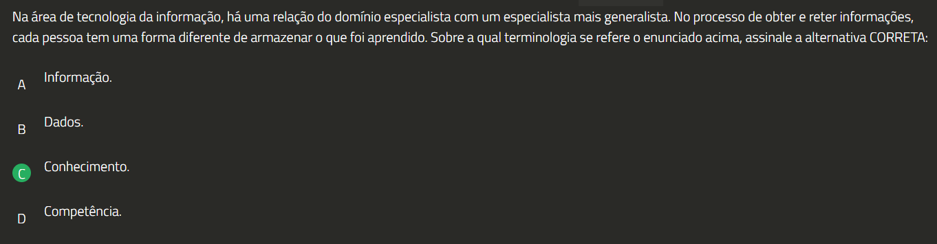 Na área de tecnologia da informação, há uma relação do domínio especialista com um especialista mais generalista. No processo de obter e reter informações, cada pessoa tem uma forma diferente de armazenar 0 que foi aprendido. Sobre a qual terminologia se refere 0 enunciado acima, assinale a alternativa CORRETA: A Informação. Dados. Conhecimento. D Competência.