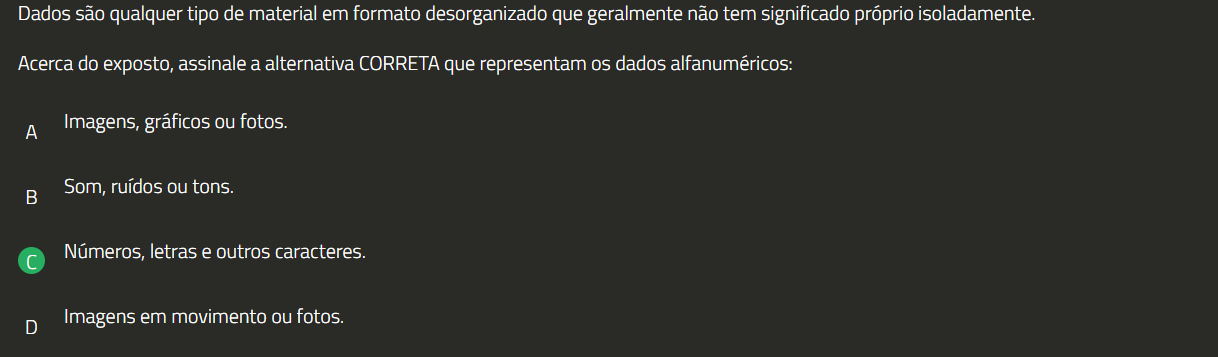 Dados são qualquer tipo de material em formato desorganizado que geralmente não tem significado próprio isoladamente. Acerca do exposto, assinale a alternativa CORRETA que representam OS dados alfanuméricos: A Imagens, gráficos ou fotos. B Som, ruídos ou tons. Números, letras e outros caracteres. D Imagens em movimento ou fotos.