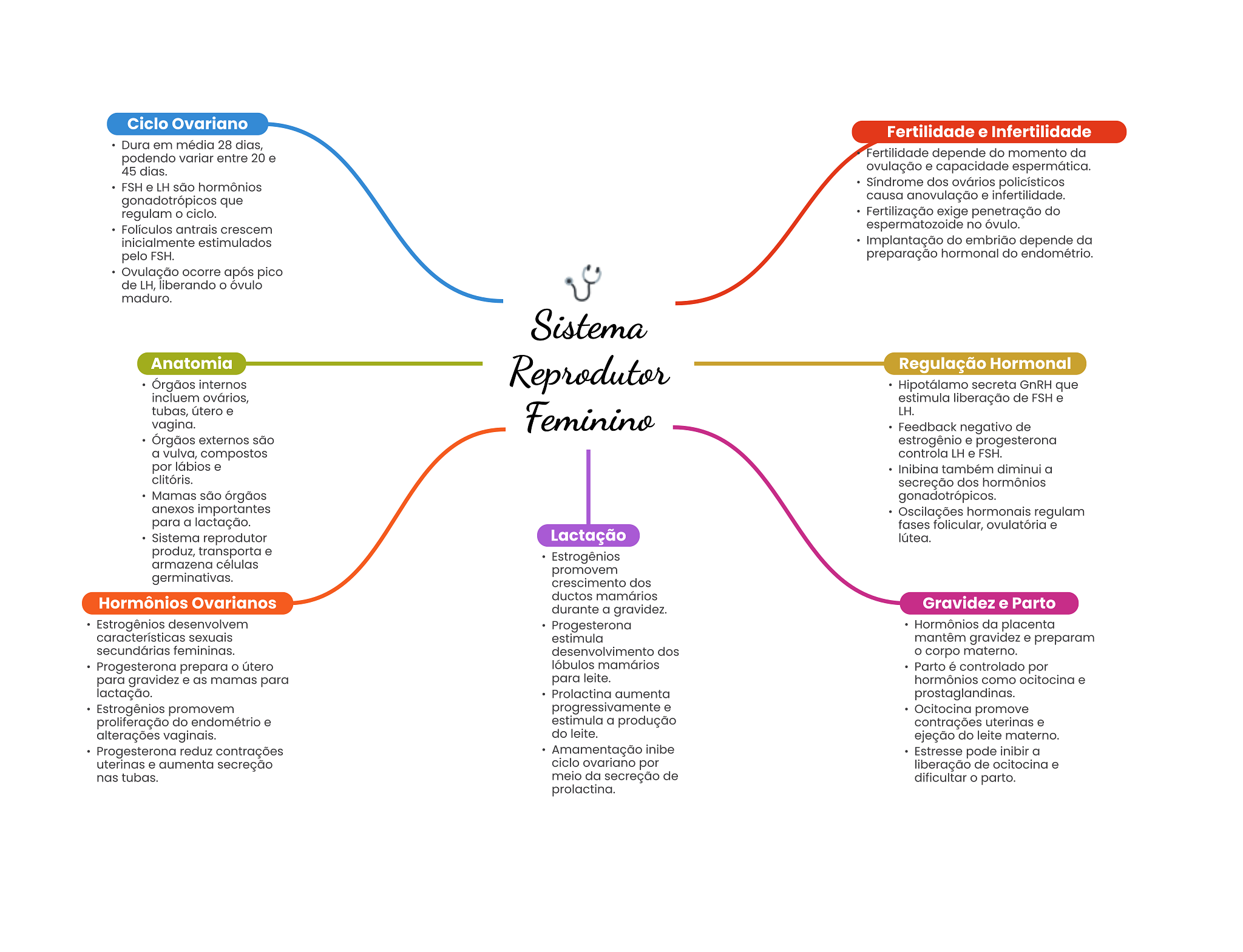 Ciclo Ovariano Fertilidade e Infertilidade Dura em média 28 dias, podendo variar entre 20 e Fertilidade depende do momento da 45 dias. ovulação e capacidade espermática. FSH e LH são hormônios Síndrome dos ovários policísticos gonadotrópicos que causa anovulação e infertilidade. regulam ciclo. Fertilização exige penetração do Folículos antrais crescem espermatozoide no inicialmente estimulados Implantação do embrião depende da pelo FSH. preparação hormonal do endométrio. Ovulação ocorre após pico de LH, liberando óvulo maduro. Sistema Anatomia Reprodutor Regulação Hormonal Órgãos internos Hipotálamo secreta GnRH que incluem ovários, estimula liberação de FSH e tubas, útero e vagina. Feminino LH. Feedback negativo de Órgãos externos são estrogênio e progesterona a vulva, compostos controla LH e FSH. por lábios e Inibina também diminui a clitóris. secreção dos hormônios Mamas são órgãos gonadotrópicos. anexos importantes Oscilações hormonais regulam para a lactação. fases folicular, ovulatória e Sistema reprodutor Lactação lútea. produz, transporta e Estrogênios armazena células promovem germinativas. crescimento dos Hormônios Ovarianos ductos mamários Gravidez e Parto durante a gravidez. Estrogênios desenvolvem Progesterona Hormônios da placenta características sexuais estimula mantêm gravidez e preparam secundárias femininas. desenvolvimento dos O corpo materno. Progesterona prepara útero lóbulos mamários Parto é controlado por para gravidez e as mamas para para leite. hormônios como ocitocina e lactação. Prolactina aumenta prostaglandinas. Estrogênios promovem progressivamente e Ocitocina promove proliferação do endométrio e estimula a produção contrações uterinas e alterações vaginais. do leite. ejeção do leite materno. Progesterona reduz contrações Amamentação inibe Estresse pode inibir a uterinas e aumenta secreção ciclo ovariano por liberação de ocitocina e nas tubas. meio da secreção de dificultar parto. prolactina.