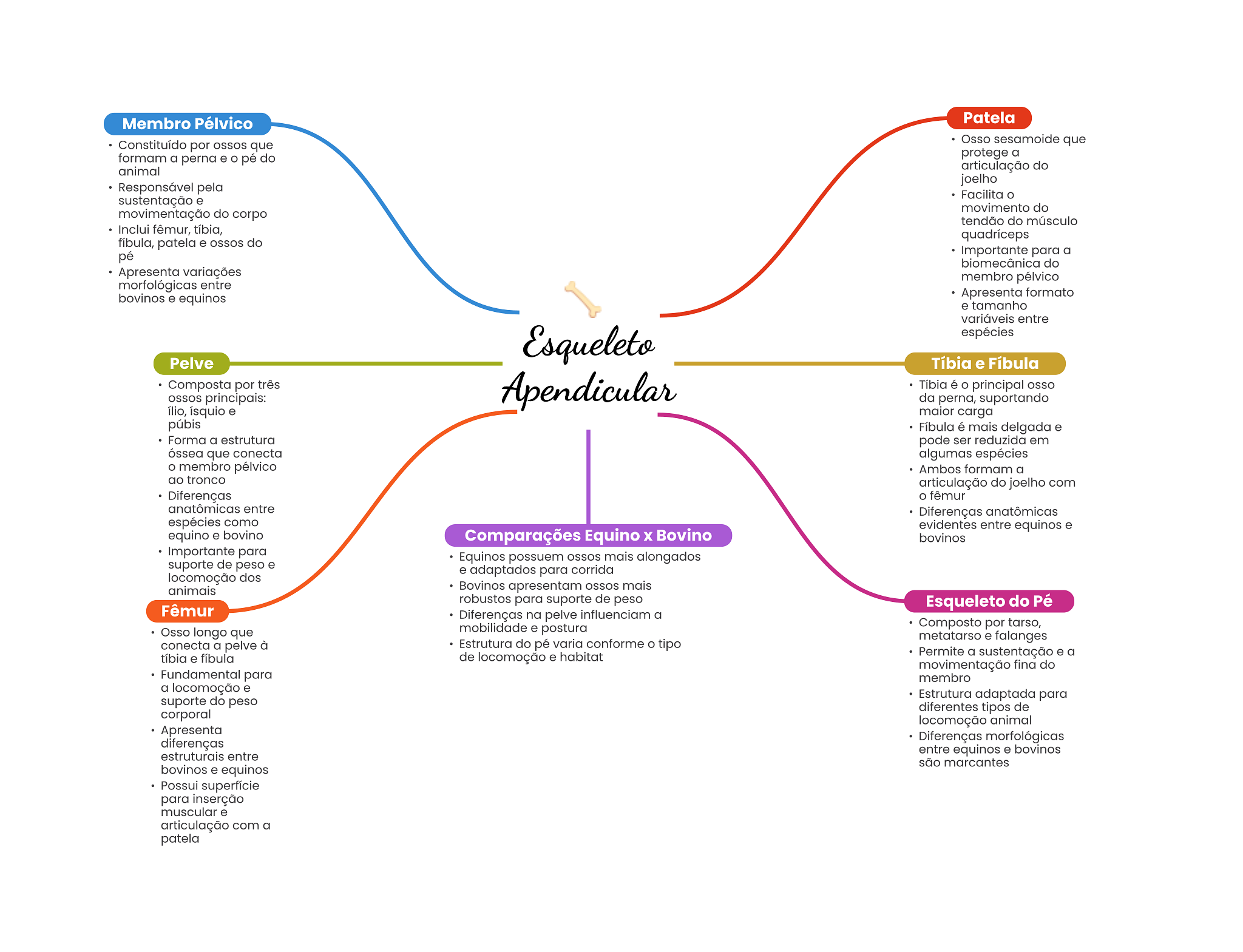 Membro Pélvico Patela Constituído por OSSOS que Osso sesamoide que formam a perna e pé do protege a animal articulação do joelho Responsável pela Facilita sustentação e movimento do movimentação do corpo tendão do músculo Inclui fêmur, tíbia, fíbula, patela e OSSOS do pé Importante para a biomecânica do Apresenta variações membro pélvico morfológicas entre bovinos e equinos Apresenta formato e tamanho variáveis entre Esqueleto espécies Pelve Tíbia e Fíbula Composta por três OSSOS principais: Apendicular Tíbia é principal OSSO da perna, suportando ilio, isquio e maior carga púbis Fíbula é mais delgada e Forma a estrutura pode ser reduzida em óssea que conecta algumas espécies O membro pélvico Ambos formam a ao tronco articulação do joelho com Diferenças O fêmur anatômicas entre Diferenças anatômicas espécies como evidentes entre equinos e equino e bovino Comparações Equino Bovino bovinos Importante para Equinos possuem OSSOS mais alongados suporte de peso e e adaptados para corrida locomoção dos animais Bovinos apresentam OSSOS mais robustos para suporte de peso Fêmur Esqueleto do Pé Diferenças na pelve influenciam a Osso longo que mobilidade e postura Composto por tarso, metatarso e falanges conecta a pelve à Estrutura do pé varia conforme O tipo tíbia e fíbula de locomoção e habitat Permite a sustentação e a movimentação fina do Fundamental para membro a locomoção e Estrutura adaptada para suporte do peso diferentes tipos de corporal locomoção animal Apresenta diferenças Diferenças morfológicas estruturais entre entre equinos e bovinos são marcantes bovinos e equinos Possui para inserção muscular e articulação com a patela