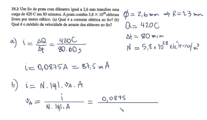 25.2 Um fio de prata com diametro igual a 2,6 mm transfere uma carga de 420 C em 80 minutos. A prata contem 5,8 X 1028 eletrons Φ= 2,6mm R=1,3 mm livres por metro cúbico. (a) Qual é a corrente no fio? (b) Qual é modulo da velocidade de arraste dos elétrons no fio? Q= 420C = 80 min a) i= = = 420C 80.60s N = 1028 eletrons/m3 i= 0,0875A = 87,5 mA b) i= JA = = 0,0875