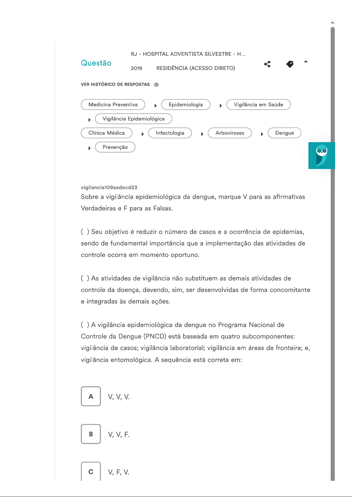 RJ HOSPITAL ADVENTISTA SILVESTRE Questão 2019 RESIDÊNCIA (ACESSO DIRETO) VER HISTÓRICO DE RESPOSTAS Medicina Preventiva Epidemiologia Vigilância em Saúde Vigilância Epidemiológica Clínica Médica Infectologia Arboviroses Dengue Prevenção vigilancia109aadecd23 Sobre a vigilância epidemiológica da dengue, marque V para as afirmativas Verdadeiras e F para as Falsas. Seu objetivo é reduzir número de casos e a ocorrência de epidemias, sendo de fundamental importância que a implementação das atividades de controle ocorra em momento oportuno. As atividades de vigilância não substituem as demais atividades de controle da doença, devendo, sim, ser desenvolvidas de forma concomitante e integradas às demais ações. A vigilância epidemiológica da dengue no Programa Nacional de Controle da Dengue (PNCD) está baseada em quatro subcomponentes: vigilância de casos; vigilância laboratorial; vigilância em áreas de fronteira; e, vigilância entomológica. A sequência está correta em: A V,V,V. V,V,F. c V,F,V.D F,V,V. E V,F,F. Responder Ver solução e comentários