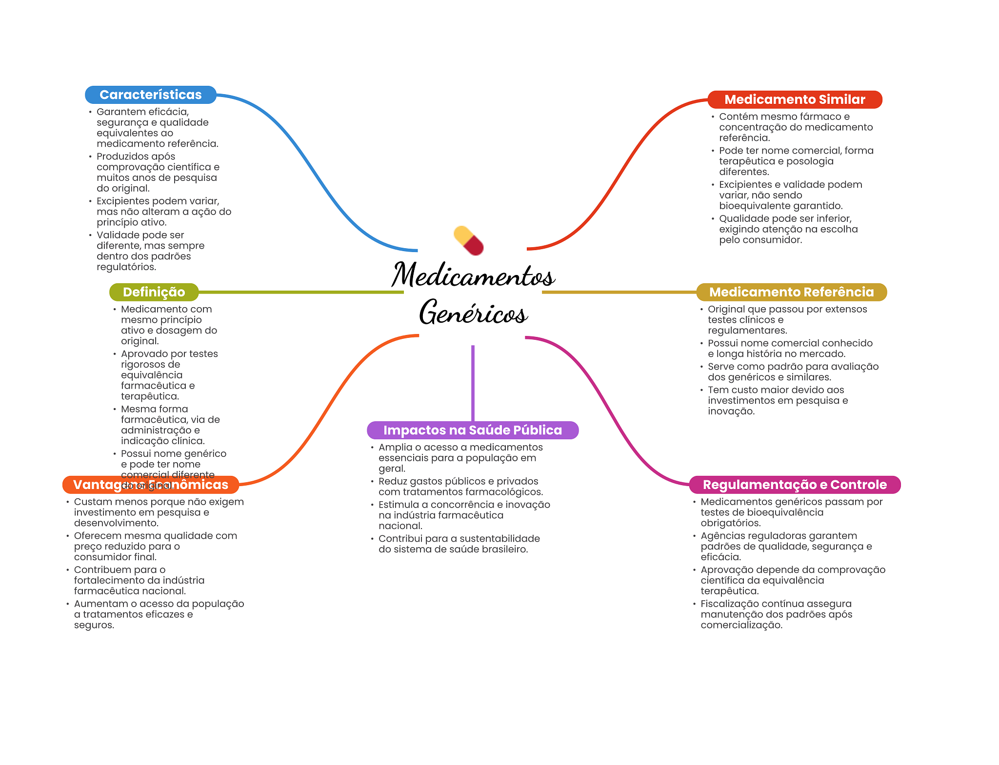 Características Medicamento Similar Garantem eficácia, Contém mesmo fármaco e segurança e qualidade concentração do medicamento equivalentes ao referência. medicamento referência. Pode ter nome comercial, forma Produzidos após comprovação científica e terapêutica e posologia diferentes. muitos anos de pesquisa do original. Excipientes e validade podem variar, não sendo Excipientes podem variar, bioequivalente garantido. mas não alteram a ação do princípio ativo. Qualidade pode ser inferior, Validade pode ser exigindo atenção na escolha diferente, mas sempre pelo consumidor. dentro dos padrões regulatórios. Medicamentos Definição Medicamento Referência Medicamento com Genéricos Original que passou por extensos mesmo princípio testes clínicos e ativo e dosagem do regulamentares. original. Possui nome comercial conhecido Aprovado por testes e longa história no mercado. rigorosos de Serve como padrão para avaliação equivalência dos genéricos e similares. farmacêutica e Tem custo maior devido aos terapêutica. investimentos em pesquisa e Mesma forma inovação. farmacêutica, via de administração e Impactos na Saúde Pública indicação clínica. Amplia acesso a medicamentos Possui nome genérico essenciais para a população em e pode ter nome comercial diferente geral. Reduz gastos públicos e privados Regulamentação e Controle com tratamentos farmacológicos. Custam menos porque não exigem Estimula a concorrência e inovação Medicamentos genéricos passam por investimento em pesquisa e na indústria farmacêutica testes de bioequivalência desenvolvimento. nacional. obrigatórios. Oferecem mesma qualidade com Contribui para a sustentabilidade Agências reguladoras garantem preço reduzido para do sistema de saúde brasileiro. padrões de qualidade, segurança e consumidor final. eficácia. Contribuem para Aprovação depende da comprovação fortalecimento da indústria científica da equivalência farmacêutica nacional. terapêutica. Aumentam acesso da população Fiscalização contínua assegura a tratamentos eficazes e manutenção dos padrões após seguros. comercialização.