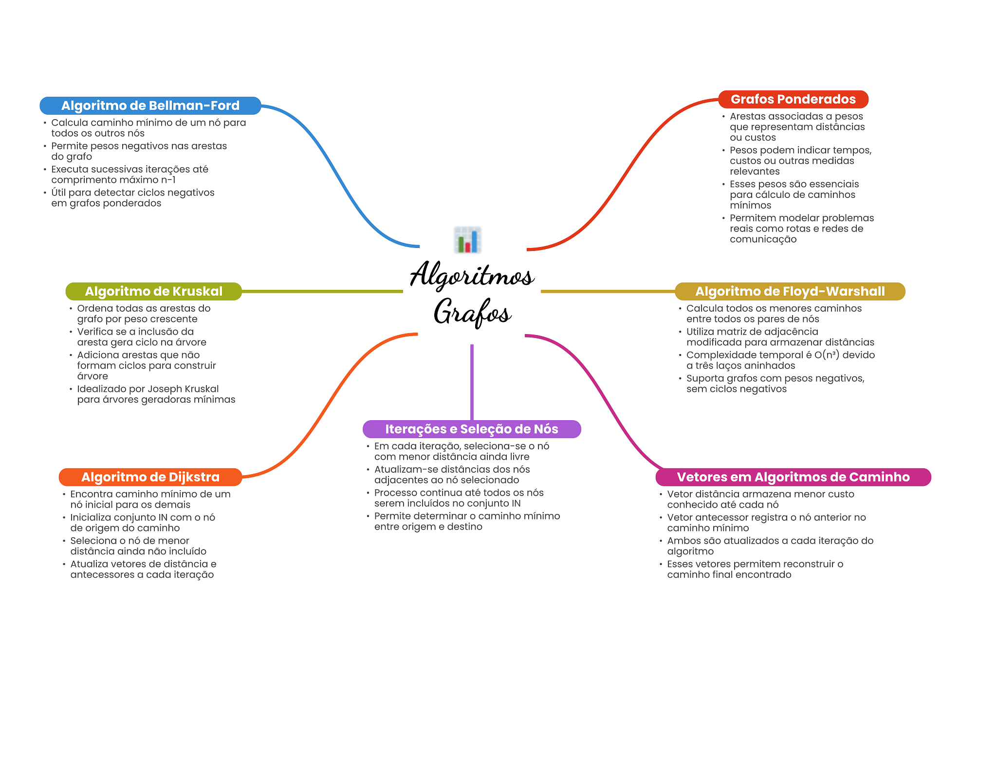 Grafos Ponderados Algoritmo de Bellman-Ford Arestas associadas a pesos Calcula caminho mínimo de um nó para que representam distâncias todos outros nós ou custos Permite pesos negativos nas arestas Pesos podem indicar tempos, do grafo custos ou outras medidas Executa sucessivas iterações até relevantes comprimento máximo n-1 Esses pesos são essenciais Útil para detectar ciclos negativos para cálculo de caminhos em grafos ponderados mínimos Permitem modelar problemas reais como rotas e redes de comunicação Algoritmos Algoritmo de Kruskal Algoritmo de Floyd-Warshall Ordena todas as arestas do grafo por peso crescente Grafos Calcula todos menores caminhos entre todos OS pares de nós Verifica se a inclusão da Utiliza matriz de adjacência aresta gera ciclo na árvore modificada para armazenar distâncias Adiciona arestas que não Complexidade temporal é devido formam ciclos para construir a três laços aninhados árvore Suporta grafos com pesos negativos, Idealizado por Joseph Kruskal sem ciclos negativos para árvores geradoras mínimas Iterações e Seleção de Nós Em cada iteração, seleciona-se nó com menor distância ainda livre Atualizam-se distâncias dos nós Algoritmo de Dijkstra adjacentes ao nó selecionado Vetores em Algoritmos de Caminho Encontra caminho mínimo de um Processo continua até todos OS nós Vetor distância armazena menor custo nó inicial para demais serem incluídos no conjunto IN conhecido até cada nó Inicializa conjunto IN com nó Permite determinar caminho mínimo Vetor antecessor registra nó anterior no de origem do caminho entre origem e destino caminho mínimo Seleciona nó de menor Ambos são atualizados a cada iteração do distância ainda não incluído algoritmo Atualiza vetores de distância e Esses vetores permitem reconstruir antecessores a cada iteração caminho final encontrado