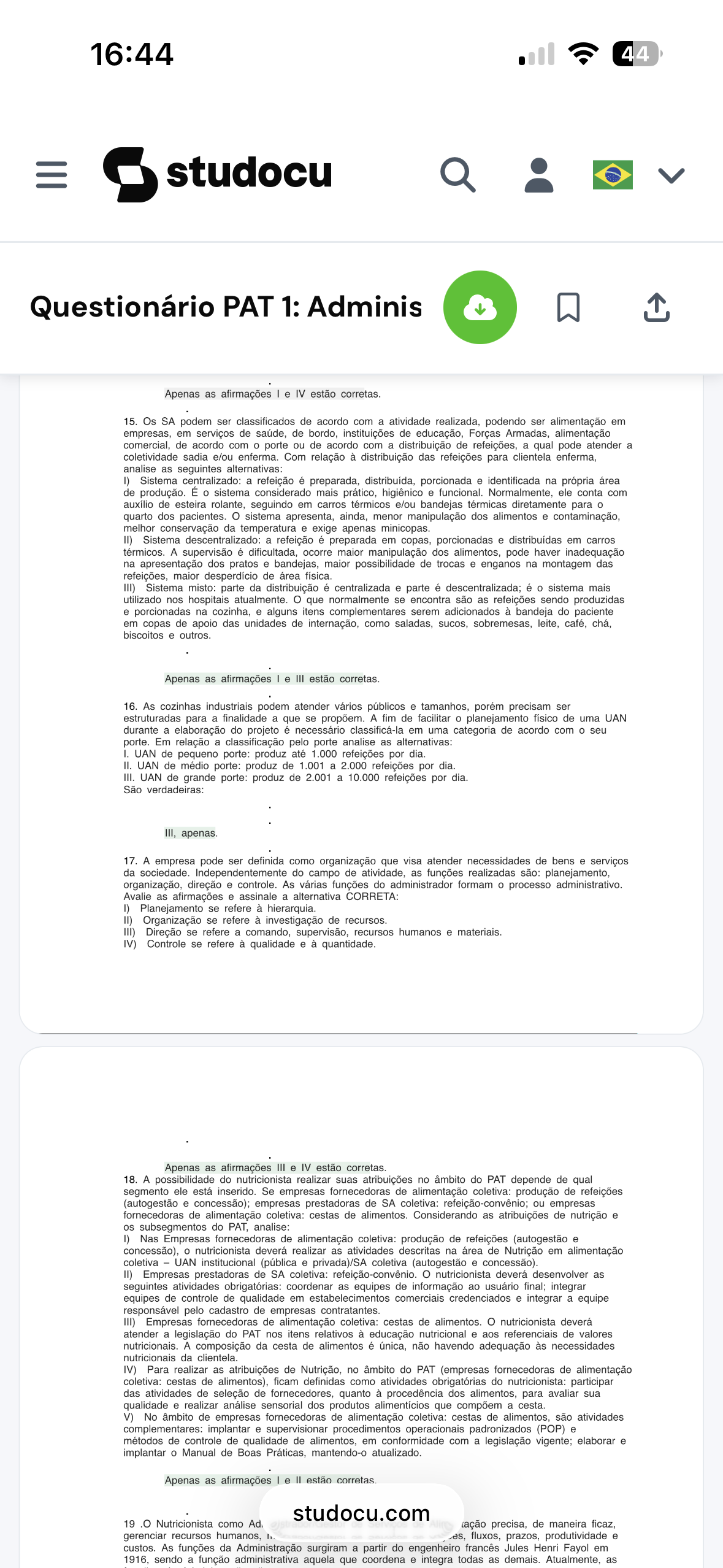 16:44 44 studocu Questionário PAT 1: Adminis Apenas as afirmações e IV estão corretas. 15. Os SA podem ser classificados de acordo com a atividade realizada, podendo ser alimentação em empresas, em serviços de saúde, de bordo, instituições de educação, Forças Armadas, alimentação comercial, de acordo com porte ou de acordo com a distribuição de refeições, a qual pode atender a coletividade sadia e/ou enferma. Com relação à distribuição das refeições para clientela enferma, analise as seguintes alternativas: I) Sistema centralizado: a refeição é preparada, distribuída, porcionada e identificada na própria área de produção. É sistema considerado mais prático, higiênico e funcional. Normalmente, ele conta com auxílio de esteira rolante, seguindo em carros térmicos e/ou bandejas térmicas diretamente para quarto dos pacientes. sistema apresenta, ainda, menor manipulação dos alimentos e contaminação, melhor conservação da temperatura e exige apenas minicopas. II) Sistema descentralizado: a refeição é preparada em copas, porcionadas e distribuídas em carros térmicos. A supervisão é dificultada, ocorre maior manipulação dos alimentos, pode haver inadequação na apresentação dos pratos e bandejas, maior possibilidade de trocas e enganos na montagem das refeições, maior desperdício de área física. III) Sistema misto: parte da distribuição é centralizada e parte é descentralizada; é O sistema mais utilizado nos hospitais atualmente. que normalmente se encontra são as refeições sendo produzidas e porcionadas na cozinha, e alguns itens complementares serem adicionados à bandeja do paciente em copas de apoio das unidades de internação, como saladas, sucos, sobremesas, leite, café, chá, biscoitos e outros. Apenas as afirmações e III estão corretas. 16. As cozinhas industriais podem atender vários públicos e tamanhos, porém precisam ser estruturadas para a finalidade a que se propõem. A fim de facilitar O planejamento físico de uma UAN durante a elaboração do projeto é necessário classificá-la em uma categoria de acordo com O seu porte. Em relação a classificação pelo porte analise as alternativas: I. UAN de pequeno porte: produz até refeições por dia. II. UAN de médio porte: produz de 1.001 a 2.000 refeições por dia. III. UAN de grande porte: produz de 2.001 a 10.000 refeições por dia. São verdadeiras: III, apenas. 17. A empresa pode ser definida como organização que visa atender necessidades de bens e serviços da sociedade. Independentemente do campo de atividade, as funções realizadas são: planejamento, organização, direção e controle. As várias funções do administrador formam O processo administrativo. Avalie as afirmações e assinale a alternativa CORRETA: I) Planejamento se refere à hierarquia. II) Organização se refere à investigação de recursos. III) Direção se refere a comando, supervisão, recursos humanos e materiais. IV) Controle se refere à qualidade e à quantidade. Apenas as afirmações III e IV estão corretas. 18. A possibilidade do nutricionista realizar suas atribuições no âmbito do PAT depende de qual segmento ele está inserido. Se empresas fornecedoras de alimentação coletiva: produção de refeições (autogestão e concessão); empresas prestadoras de SA coletiva: refeição-convênio; ou empresas fornecedoras de alimentação coletiva: cestas de alimentos. Considerando as atribuições de nutrição e os subsegmentos do PAT, analise: I) Nas Empresas fornecedoras de alimentação coletiva: produção de refeições (autogestão e concessão), nutricionista deverá realizar as atividades descritas na área de Nutrição em alimentação coletiva UAN institucional (pública e privada)/SA coletiva (autogestão e concessão). II) Empresas prestadoras de SA coletiva: refeição-convênio. nutricionista deverá desenvolver as seguintes atividades obrigatórias: coordenar as equipes de informação ao usuário final; integrar equipes de controle de qualidade em estabelecimentos comerciais credenciados e integrar a equipe responsável pelo cadastro de empresas contratantes. III) Empresas fornecedoras de alimentação coletiva: cestas de alimentos. o nutricionista deverá atender a legislação do PAT nos itens relativos à educação nutricional e aos referenciais de valores nutricionais. A composição da cesta de alimentos é única, não havendo adequação às necessidades nutricionais da IV) Para realizar as atribuições de Nutrição, no âmbito do PAT (empresas fornecedoras de alimentação coletiva: cestas de alimentos), ficam definidas como atividades obrigatórias do nutricionista: participar das atividades de seleção de fornecedores, quanto à procedência dos alimentos, para avaliar sua qualidade e realizar análise sensorial dos produtos alimentícios que compõem a cesta. V) No âmbito de empresas fornecedoras de alimentação coletiva: cestas de alimentos, são atividades complementares: implantar e supervisionar procedimentos operacionais padronizados (POP) e métodos de controle de qualidade de alimentos, em conformidade com a legislação vigente; elaborar e implantar Manual de Boas Práticas, mantendo-o atualizado. Apenas as afirmações e II estão corretas. studocu.com 19 Nutricionista como Ad. precisa, de maneira ficaz, gerenciar recursos humanos, es, fluxos, prazos, produtividade e custos. As funções da Administração surgiram a partir do engenheiro francês Jules Henri Fayol em 1916, sendo a função administrativa aquela que coordena e integra todas as demais. Atualmente, as