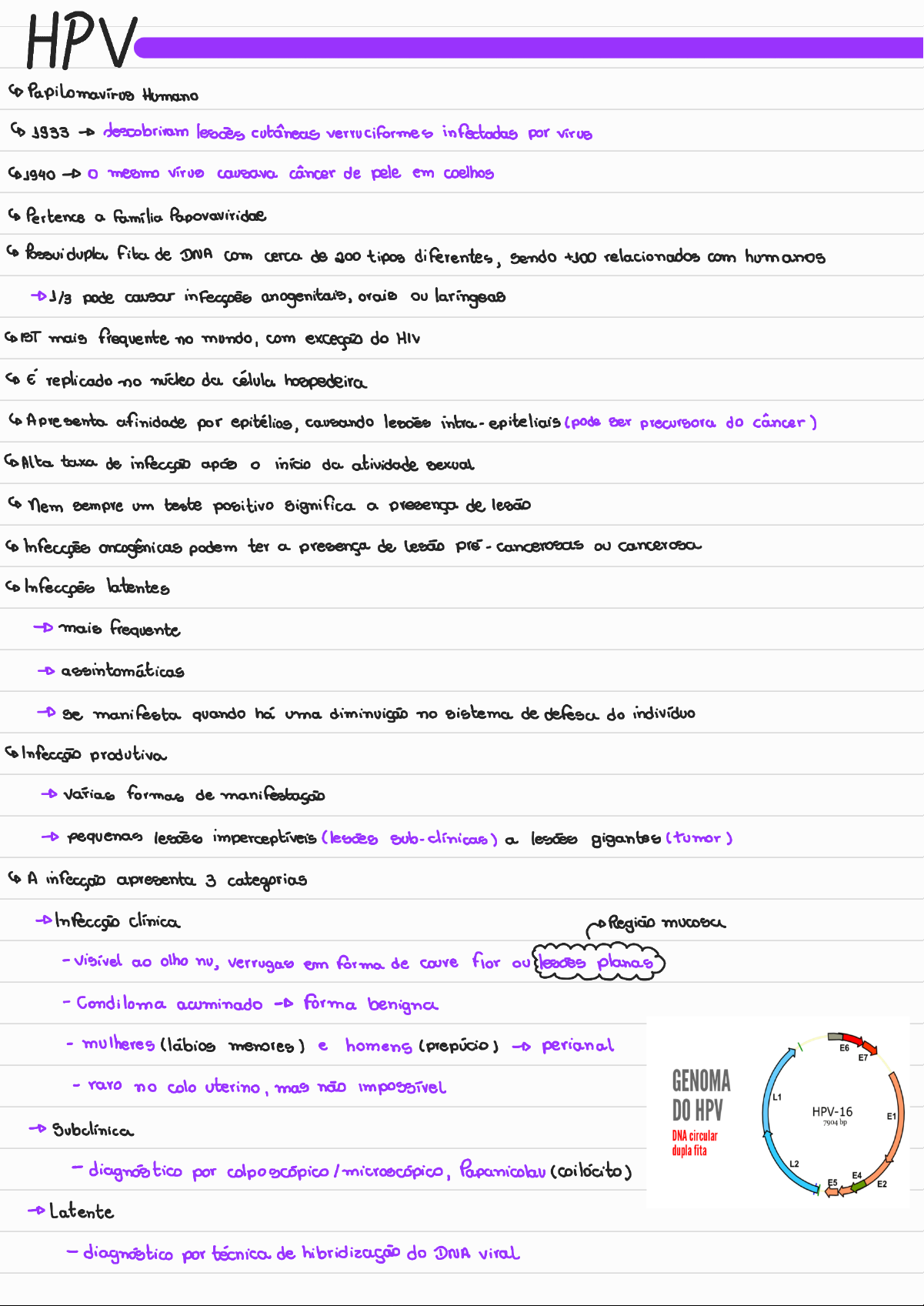 HPV Papilomavirus Humano 1933 lesões cutâneas verruciformes infectadas por virus 1940 mesmo causava câncer de pele em coelhos Pertence a Papovaviridae Fita de DNA com cerca de 200 tipos diferentes, relacionados com humanos 1/3 pode causar anogenitais, orais laringeas IST mais frequente no mundo, com do HIV É replicado no núcleo célula hospedeira Apresenta afinidade por epitélios, causando intra- epiteliais (pode precursora do câncer) Alta taxa de início da atividade sexual Nem sempre um teste positivo significa a presença. de oncogênicas podem ter a presença de lesás pré cancerosas cancerosa latentes mais frequente assintomáticas manifesta quando há uma no sistema de defesa do indivíduo produtiva varias de manifestagão pequenas lesões imperceptiveis (lesões a gigantes (tumor) A 3 categorias clínica Regicio visivel ao olho nu, verrugas em forma de flor ou planas - Condiloma acuminado forma benigna - mulheres (lábios menores) e homens (prepúcio) perianal E6 E7 - raro no colo uterino, mas não impossivel GENOMA L1 DO HPV HPV-16 E1 Subclínica DNA circular dupla fita - por colpogcópico Papanicolau (coilócito) L2 E4 E5 E2 latente - diagnóstico por técnica de hibridização do DNA viral- mais frequente - pequena % das mulheres desenvolve de alto câncer - necessário cofatores para degenvolvimento de uma lesão após o HPV oncogênico Ciclo viral do genoma proliferativa e particulas virais Dividido em Early : genes codificam proteínas reguladoras da atividade celular j E6 e E7 cadificam oncopro- com genes supressores de tumor Persistência do HPV de alto risco oncogênico late (tardia) : gene L codificam as proteínas do capsídeo viral Integração do DNA viral ao DNA da célula Expressão desregulada dos genes CA Producgão de particulas viraig, ocorre amplificação do genoma do HPV, pE6 pE7 que dependente da expressão dos genes E2, Degrada p53 BAX degrada inibe pRB, p27 HPV do hospedeiro dentro das células epiteliais apoptose Proliferação celular Infecção ocorre pelo contato de uma escama com Figura 2. Principal atuação das proteínas virais sobre ciclo celular erogada Ferida da mucosa Health Sci Inst. 2012;30(2):107-11 Parabasais alvos da Replicação ocorre em duas fases : infecção nas células virug fica latente e a atividade celulas filhas que entram em diferenciação do é restrito as camadas superiores do epitelio g superficiais coilócitos e concentram a maioria das particulas virais últimos Novas virais Liberação e feitos do ciclo viral Particulas virais infecciosas perinuclear infecciosas Epissomo DNA virus não integra ao DNA do hospedeiro No núcleo do hospedeiro pode assumir duas de acordo com padrão de infecção Epissomal e produtiva) DNA viral permanece circular no núcleo do hospedeiro - benignas j baixo risco Integrada (transformante) - do DNA as genoma - rompimento da com desregulação do controle transcricional dog genes viraisNovos Vírus HPV - alto risco Montagem de novos vírus - ativação E6 Maturação das células infetadas Replicação do Integração do - imortalização celular ADN do ADN viral Indivíduo infectado Tecido saudável Infeção CIN1 CIN2 CIN3 Cancro eliminação natural em 18 meses por HPV Lesão de baixo grau Lesão de alto grau Algung se multiplica e provoca lesões (verrugas, subclinicas) virus pode permanecer latente por vários alterações na imunidade multiplicação viral e legões ENTENDA A DOENÇA TRANSMISSÃO POR CONTATO DIRETO DA PELE HUMANO (HPV) VERRUGAS NA SUPERFICIE DAPELE INFECÇÃO POR HPV CÉLULAS DO CORPO REPRODUÇÃO FOCO DE CÉLULAS DOS VÍRUS CANCEROSAS & . Co Oncogênico : HPV 16 e 18; câncer de colo uterino Co oncogênico : HPV 6 e verrugas genitais