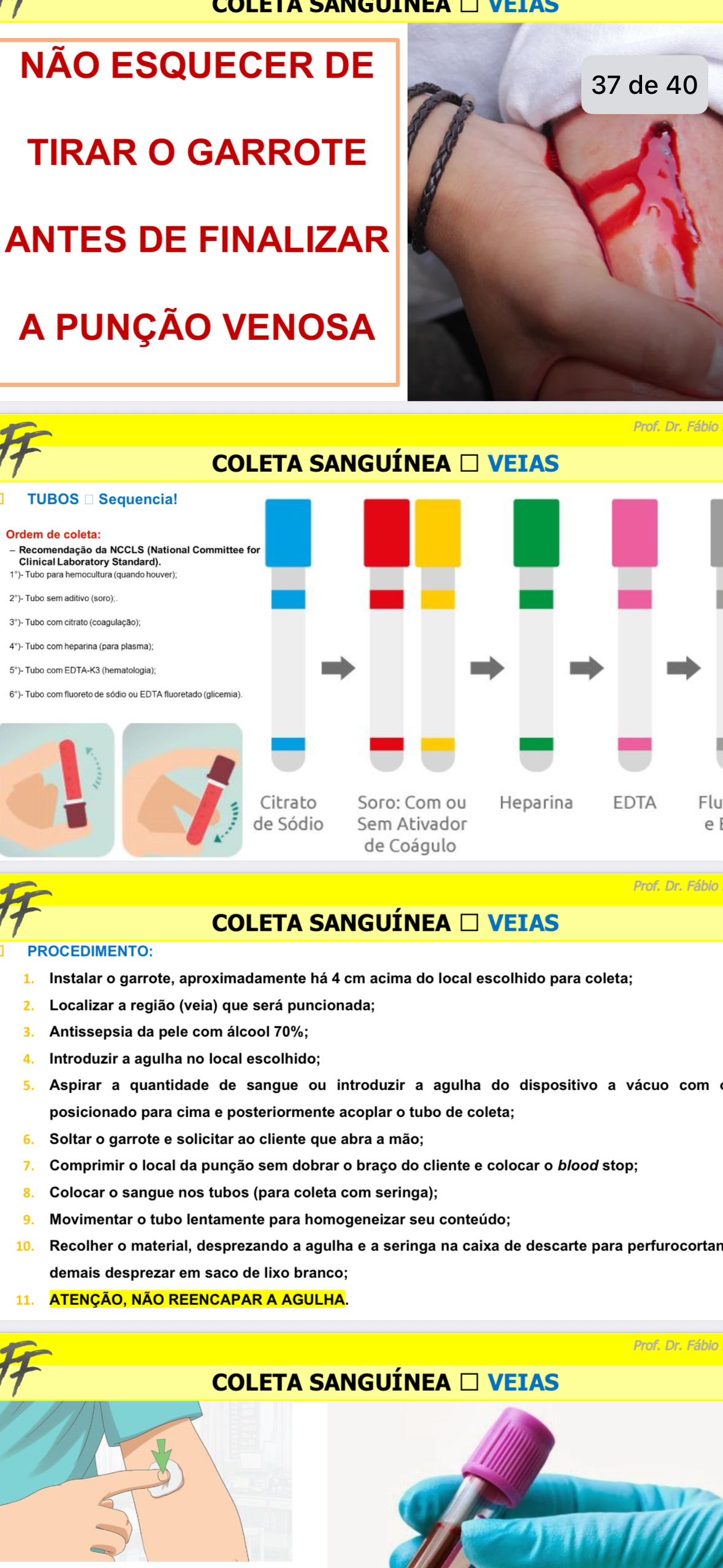 SANGUINEA NÃO ESQUECER DE 37 de 40 TIRAR GARROTE ANTES DE FINALIZAR A PUNÇÃO VENOSA Prof. Dr. Fábio COLETA SANGUÍNEA VEIAS TUBOS Sequencia! Ordem de coleta: Recomendação da NCCLS (National Committee for Clinical Laboratory Standard). 1°)- Tubo para hemocultura (quando 2°)- Tubo sem aditivo (soro): 3°)- Tubo com citrato 4°)- Tubo com heparina (para 5°)- Tubo com EDTA-K3 (hematologia); 6°)- Tubo com fluoreto de sódio ou EDTA fluoretado (glicemia) Citrato Soro: Com ou Heparina EDTA Flu de Sódio Sem Ativador e E de Coágulo Prof. Dr. Fábio COLETA SANGUÍNEA VEIAS PROCEDIMENTO: 1. Instalar o garrote, aproximadamente há 4 cm acima do local escolhido para coleta; 2. Localizar a região (veia) que será puncionada; 3. Antissepsia da pele com álcool 70%; 4. Introduzir a agulha no local escolhido; 5. Aspirar a quantidade de sangue ou introduzir a agulha do dispositivo a vácuo com posicionado para cima e posteriormente acoplar o tubo de coleta; 6. Soltar o garrote e solicitar ao cliente que abra a mão; 7. Comprimir o local da punção sem dobrar o braço do cliente e colocar o blood stop; 8. Colocar o sangue nos tubos (para coleta com seringa); 9. Movimentar o tubo lentamente para homogeneizar seu conteúdo; 10. Recolher o material, desprezando a agulha e a seringa na caixa de descarte para perfurocortan demais desprezar em saco de lixo branco; 11. ATENÇÃO, NÃO REENCAPAR A AGULHA. Prof. Dr. Fábio COLETA SANGUÍNEA VEIAS