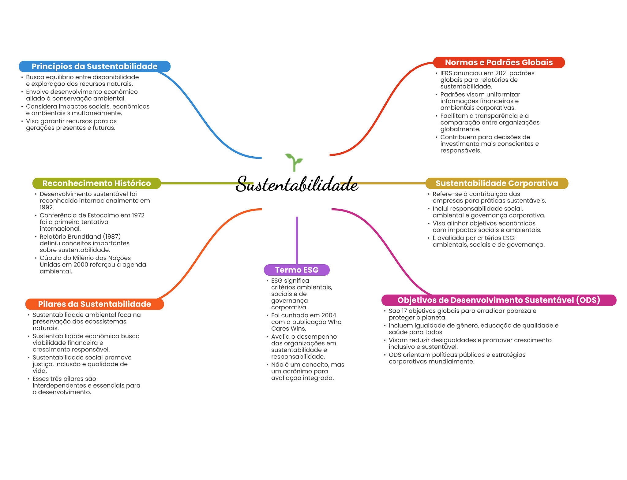 Normas e Padrões Globais Princípios da Sustentabilidade IFRS anunciou em 2021 padrões Busca equilíbrio entre disponibilidade globais para relatórios de e exploração dos recursos naturais. sustentabilidade. Envolve desenvolvimento econômico Padrões visam uniformizar aliado à conservação ambiental. informações financeiras e Considera impactos sociais, econômicos ambientais corporativas. e ambientais simultaneamente. Facilitam a transparência e a Visa garantir recursos para as comparação entre organizações gerações presentes e futuras. globalmente. Contribuem para decisões de investimento mais conscientes e responsáveis. Histórico Sustentabilidade Sustentabilidade Corporativa Desenvolvimento sustentável foi Refere-se à contribuição das reconhecido internacionalmente em empresas para práticas sustentáveis. 1992. Inclui responsabilidade social, Conferência de Estocolmo em 1972 ambiental e governança corporativa. foi a primeira tentativa Visa alinhar objetivos econômicos internacional. com impactos sociais e ambientais. Relatório Brundtland (1987) É avaliada por critérios ESG: definiu conceitos importantes ambientais, sociais e de governança. sobre sustentabilidade. Cúpula do Milênio das Nações Unidas em 2000 reforçou a agenda ambiental. Termo ESG ESG significa critérios ambientais, sociais e de Pilares da Sustentabilidade governança Objetivos de Desenvolvimento Sustentável (ODS) corporativa. Sustentabilidade ambiental foca na São 17 objetivos globais para erradicar pobreza e Foi cunhado em 2004 proteger O planeta. preservação dos ecossistemas com a publicação Who naturais. Cares Wins. Incluem igualdade de gênero, educação de qualidade e saúde para todos. Sustentabilidade econômica busca Avalia desempenho viabilidade financeira e das organizações em Visam reduzir desigualdades e promover crescimento crescimento responsável. inclusivo e sustentável. sustentabilidade e Sustentabilidade social promove responsabilidade. ODS orientam políticas públicas e estratégias justiça, inclusão e qualidade de Não é um conceito, mas corporativas mundialmente. vida. um acrônimo para Esses três pilares são avaliação integrada. interdependentes e essenciais para desenvolvimento.