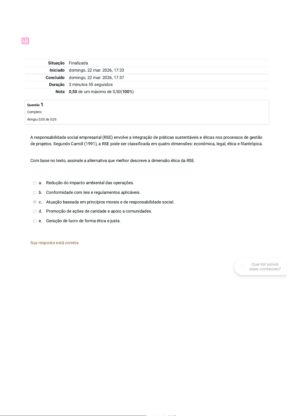 Situação Finalizada Iniciado domingo, 22 mar. 2026, 17:33 Concluído domingo, 22 mar. 2026, 17:37 Duração 3 minutos 55 segundos Nota 0,50 de um máximo de 0,50(100%) Questão 1 Completo Atingiu 0,05 de 0,05 A responsabilidade social empresarial (RSE) envolve a integração de práticas sustentáveis e éticas nos processos de gestão de projetos. Segundo Carroll (1991), a RSE pode ser classificada em quatro dimensões: econômica, legal, ética e filantrópica. Com base no texto, assinale a alternativa que melhor descreve a dimensão ética da RSE. a. Redução do impacto ambiental das operações. b. Conformidade com leis e regulamentos aplicáveis. c. Atuação baseada em princípios morais e de responsabilidade social. d. Promoção de ações de caridade e apoio a comunidades. e. Geração de lucro de forma ética e justa. Sua resposta está correta. Que tal salvar esse conteúdo? Questão 2 Completo Atingiu 0,05 de 0,05 A prototipagem desempenha um papel crucial no desenvolvimento de produtos, permitindo a validação de ideias antes da produção em larga escala. Esse processo envolve diferentes níveis de fidelidade, variando de protótipos simples a modelos avançados. Marque (V) para verdadeiro e (F) para falso nas afirmações abaixo sobre prototipagem: ( ) A prototipagem reduz riscos ao permitir a identificação precoce de falhas. ( ) Protótipos de alta fidelidade são usados apenas para testar funcionalidades técnicas, sem considerar a experiência do usuário. ( ) Prototipagem de baixa fidelidade é útil para explorar conceitos iniciais de design sem grande investimento. ( ) O objetivo da prototipagem é garantir que um produto esteja 100% perfeito antes de ser lançado, sem necessidade de ajustes futuros. ( ) Testar protótipos com usuários ajuda a refinar soluções e melhorar o produto final. Assinale a alternativa correta. a. V, V, V, F, F. b. F, V, F, V, V. c. V, V, F, F, V. d. V, F, V, F, V. e. F, F, V, V, V. Sua resposta está correta. Que tal salvar esse conteúdo? Questão 3 Completo Atingiu 0,05 de 0,05 Questão 4 Completo Atingiu 0,05 de 0,05 A sustentabilidade empresarial tem sido um dos temas mais debatidos na gestão de projetos, dada a necessidade de equilibrar crescimento econômico, responsabilidade ambiental e impacto social positivo. O conceito de Triple Bottom Line (TBL) surgiu como um modelo de gestão que busca avaliar a performance organizacional considerando três dimensões essenciais: lucro, planeta e pessoas. Empresas que adotam essa abordagem tendem a ser mais valorizadas no mercado e a mitigar riscos financeiros e reputacionais. Com base nesse conceito, assinale a alternativa que representa corretamente os três pilares do Triple Bottom Line. a. Infraestrutura, Ambiental e Energético. b. Mercado, Sociedade e Inovação. c. Econômico, Ambiental e Social. d. Financeiro, Político e Tecnológico. e. Produção, Distribuição e Consumo. Sua resposta está correta. O design thinking é uma abordagem poderosa para solucionar problemas complexos e desenvolver produtos inovadores. Dentro dessa metodologia, a fase de imersão é crucial, pois permite entender profundamente as necessidades dos usuários e do mercado antes da geração de ideias. Qual das alternativas abaixo melhor descreve o propósito da fase de imersão no design thinking? Assinale a alternativa correta. a. A fase de imersão busca compreender as necessidades dos usuários e o contexto do problema antes de propor soluções. b. Imersão é a etapa de definição de preços para que o produto tenha melhor aceitação no mercado. c. Essa fase tem como objetivo principal validar hipóteses financeiras antes da concepção do produto. d. A fase de imersão não é relevante, pois o foco do design thinking é a rápida implementação de soluções. e. A fase de imersão consiste em testar protótipos finais antes do lançamento do produto. Sua resposta está correta. Que tal salvar esse conteúdo? Questão 5 Completo Atingiu 0,05 de 0,05 Questão 6 Completo Atingiu 0,05 de 0,05 O design thinking é amplamente utilizado para resolver problemas complexos de forma criativa e centrada no usuário. Em projetos inovadores, no entanto, pode haver desafios na implementação dessa metodologia, como resistência organizacional, falta de alinhamento estratégico e dificuldades na integração com métodos tradicionais de gestão. Diante desses desafios, qual das alternativas apresenta a estratégia mais eficaz para garantir o sucesso da implementação do design thinking em uma organização? Assinale a alternativa correta. a. Implementar o design thinking sem adaptações, independentemente do contexto e da cultura organizacional. b. Utilizar design thinking apenas como uma ferramenta pontual, sem integrá-lo aos processos organizacionais. c. Limitar a aplicação do design thinking apenas a setores criativos, evitando sua implementação em áreas estratégicas da empresa. d. Estabelecer uma cultura organizacional que valorize a experimentação e a colaboração, garantindo o alinhamento entre equipes e stakeholders. e. Priorizar a estrutura hierárquica rígida para garantir que as decisões de design thinking sejam tomadas exclusivamente por líderes da empresa. Sua resposta está correta. A responsabilidade social empresarial (RSE) envolve a integração de práticas sustentáveis e éticas nos processos de gestão de projetos. Segundo Carroll (1991), a RSE pode ser classificada em quatro dimensões: econômica, legal, ética e filantrópica. Assinale a alternativa que melhor descreve a dimensão filantrópica da RSE. a. Implementação de políticas de governança corporativa. b. Redução do impacto ambiental das operações. c. Geração de lucro de forma ética e justa. d. Promoção de ações de caridade e apoio a comunidades. e. Conformidade com leis e regulamentos aplicáveis. Sua resposta está correta. Que tal salvar esse conteúdo? Questão 7 Completo Atingiu 0,05 de 0,05 