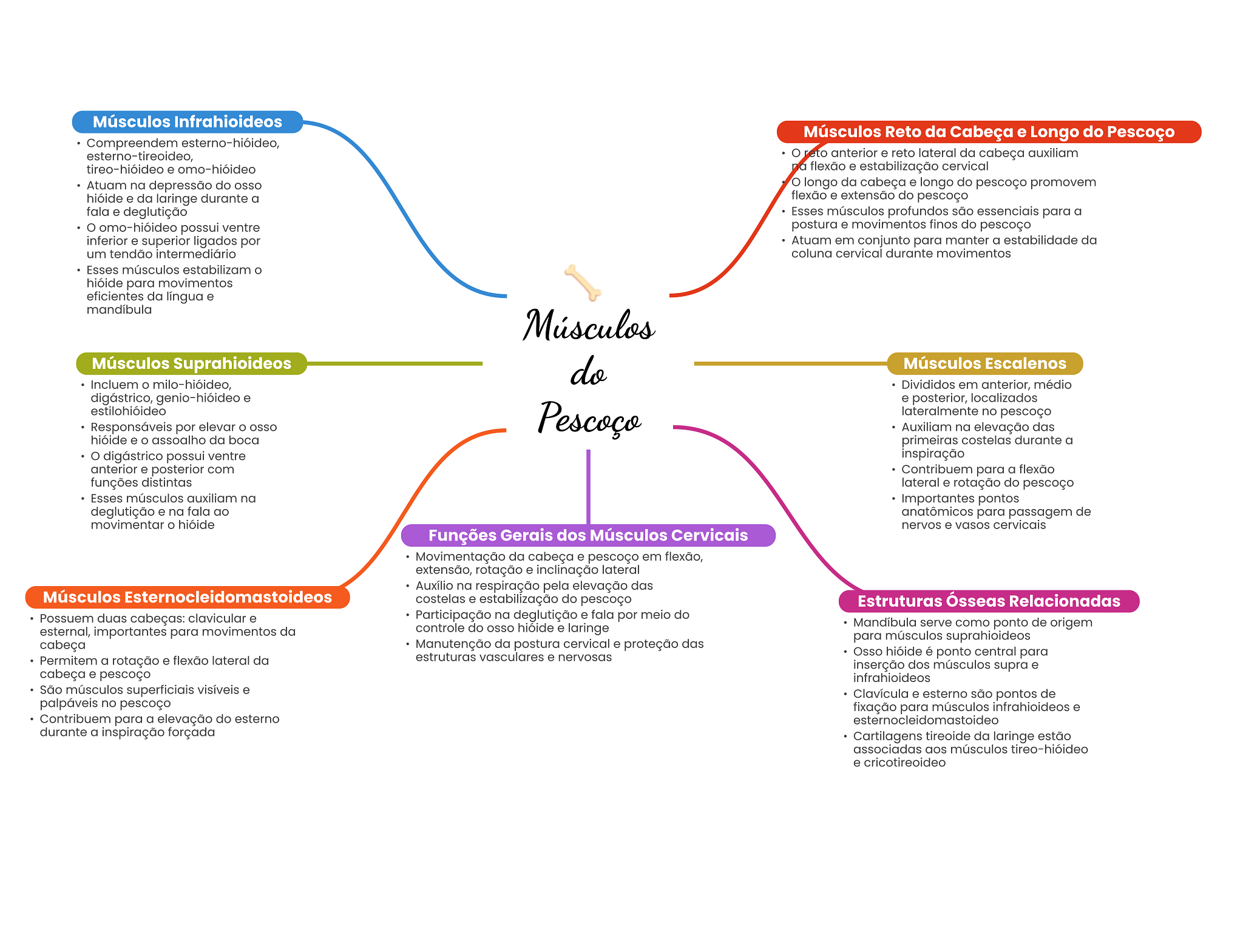 Músculos Infrahioideos Músculos Reto da Cabeça e Longo do Pescoço Compreendem esterno-hióideo, esterno-tireoideo, reto anterior e reto lateral da cabeça auxiliam tireo-hióideo e omo-hióideo na flexão e estabilização cervical Atuam na depressão do longo da cabeça e longo do pescoço promovem hióide e da laringe durante a flexão e extensão do pescoço fala e deglutição Esses músculos profundos são essenciais para a omo-hióideo possui, ventre postura e movimentos finos do pescoço inferior e superior ligados por Atuam em conjunto para manter a estabilidade da um tendão intermediário coluna cervical durante movimentos Esses músculos estabilizam hióide para movimentos eficientes da língua e mandíbula Músculos Músculos Suprahioideos do Músculos Escalenos Incluem milo-hióideo, Divididos em anterior, médio digástrico, genio-hióideo e e posterior, localizados estilohióideo Responsáveis por elevar Pescoço lateralmente no pescoço Auxiliam na elevação das hióide e assoalho da boca primeiras costelas durante a digástrico possui ventre inspiração anterior e posterior com Contribuem para a flexão funções distintas lateral e rotação do pescoço Esses músculos auxiliam na Importantes pontos deglutição e na fala ao anatômicos para passagem de movimentar hióide nervos e vasos cervicais Funções Gerais dos Músculos Cervicais Movimentação da cabeça e pescoço em flexão, extensão, rotação e inclinação lateral Auxílio na respiração pela elevação das Músculos Esternocleidomastoideos costelas e estabilização do pescoço Estruturas Ósseas Relacionadas Possuem duas cabeças: clavicular e Participação na deglutição e fala por meio do esternal, importantes para movimentos da controle do hióide e laringe Mandíbula serve como ponto de origem para músculos suprahioideos cabeça Manutenção da postura cervical e proteção das estruturas vasculares e nervosas Osso hióide é ponto central para Permitem a rotação e flexão lateral da inserção dos músculos supra e cabeça e pescoço infrahioideos São músculos superficiais visíveis e Clavícula e esterno são pontos de palpáveis no pescoço fixação para músculos infrahioideos e Contribuem para a elevação do esterno esternocleidomastoideo durante a inspiração forçada Cartilagens tireoide da laringe estão associadas aos músculos tireo-hióideo e cricotireoideo