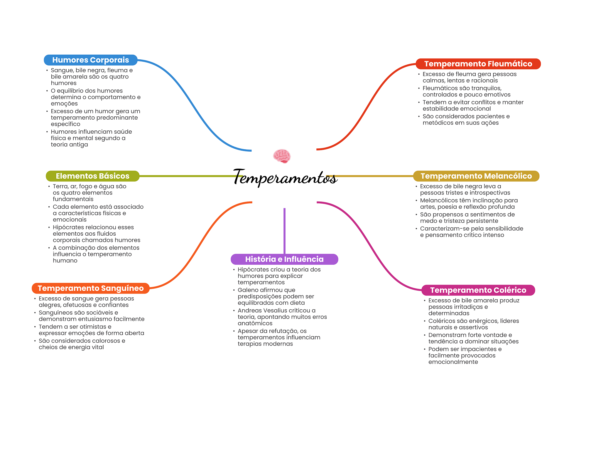Humores Corporais Temperamento Fleumático Sangue, bile negra, fleuma e bile amarela são quatro Excesso de fleuma gera pessoas humores calmas, lentas e racionais equilíbrio dos humores Fleumáticos são tranquilos, determina comportamento e controlados e pouco emotivos emoções Tendem a evitar conflitos e manter estabilidade emocional Excesso de um humor gera um temperamento predominante São considerados pacientes e específico metódicos em suas ações Humores influenciam saúde física e mental segundo a teoria antiga Elementos Básicos Temperamentos Temperamento Melancólico Terra, ar, fogo e água são Excesso de bile negra leva a quatro elementos pessoas tristes e introspectivas fundamentais Melancólicos têm inclinação para Cada elemento está associado artes, poesia e reflexão profunda a características físicas e São propensos a sentimentos de emocionais medo e tristeza persistente Hipócrates relacionou esses Caracterizam-se pela sensibilidade elementos aos fluidos e pensamento crítico intenso corporais chamados humores A combinação dos elementos influencia temperamento humano História e Influência Hipócrates criou a teoria dos humores para explicar temperamentos Temperamento Sanguíneo Galeno afirmou que Temperamento Colérico Excesso de sangue gera pessoas predisposições podem ser alegres, afetuosas e confiantes equilibradas com dieta Excesso de bile amarela produz Sanguíneos são sociáveis e Andreas Vesalius criticou a pessoas irritadiças e determinadas demonstram entusiasmo facilmente teoria, apontando muitos erros anatômicos Coléricos são enérgicos, líderes Tendem a ser otimistas e naturais e assertivos expressar emoções de forma aberta Apesar da refutação, São considerados calorosos e temperamentos influenciam Demonstram forte vontade e cheios de energia vital terapias modernas tendência a dominar situações Podem ser impacientes e facilmente provocados emocionalmente