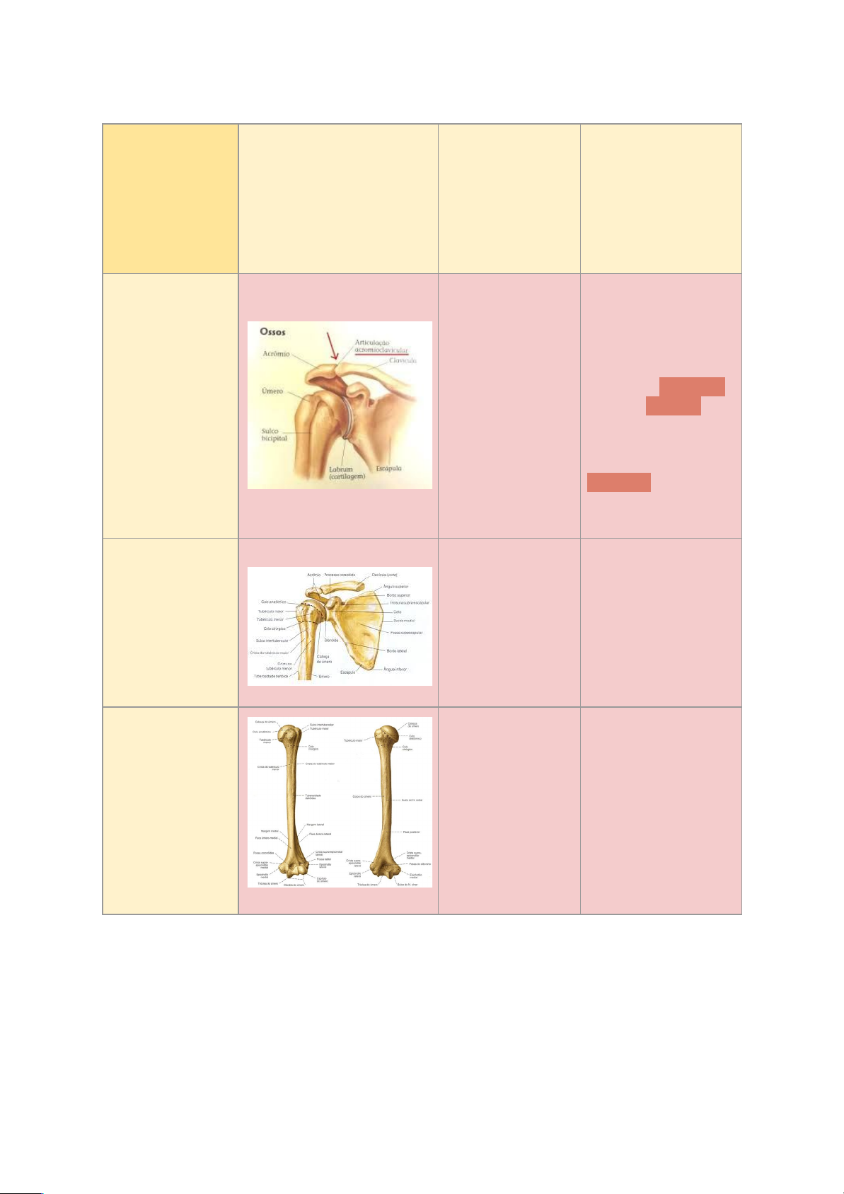 Onde fica? Explicar de forma simples onde fica no corpo( veja no atlas para lembrar) origem e inserção movimentos e músculos/ossos relacionados( relacionar as tuberosidades com os músculos no caso dos músculos) Acrômio Tuberosidades e músculos que se inserem: Tuberosidade deltóidea- deltóide- Músculo Bíceps se insere na parte proximal do tubérculo maior- Trapézio de insere na parte superior do acrômio. 2) Tuberosidade maior úmero Tuberosidades e músculos que se inserem: músculo supraespinal- parte superior do tubérculo maior 3) Tuberosidade menor úmero Tuberosidades e músculos que se inserem: Músculo subescapular - se insere na tuberosidade menor do úmero 4) Fossa Supra-espinal Tuberosidades e músculos que se inserem: Músculo supraespinal -fossa supraespinal Músculo levantador da escápula - parte superior da margem medial da escápula 5) Fossa infra-espinal Tuberosidades e músculos que se inserem: Músculo infraespinal se insere na fossa infra espinhal. 6) Sulco Bicipital Tuberosidades e músculos que se inserem: Por onde passa o tendão da cabeça longa do músculo bíceps do braço. 7) ECOM Origem: Cabeça esternal: manúbrio do esterno Cabeça clavicular: porção média da clavícula Movimentos: Contração unilateral: Flexão lateral da cabeça, rotação da cabeça para o lado oposto Contração bilateral: elevação da cabeça, inserção: Processo mastóide do osso temporal e na linha nucal superior do osso occipital. flexão do pescoço em direção ao tórax Outros: auxiliar na inspiração. 8) Romboide menor Origem: Processo (apófise) espinhoso de C6 e C7 inserção: Bordo medial da escápula (omoplata) Movimentos: Adução, elevação e rotação da escápula (omoplata). Estabilização da escápula (omoplata) 9) Romboide maior Origem:Processo (apófise) espinhoso de T1 a T4 inserção:Bordo medial da escápula (omoplata) Movimentos: Adução, elevação e rotação da escápula (omoplata). Estabilização da escápula (omoplata) 10) Peitoral menor Parte ventral em frente as costelas e está posterior ao peitoral maior Origem: Superfície anterior das 3ª, 4ª e 5ª costelas e fáscia sobrejacente aos espaços intercostais inserção: Apófise coracóide da omoplata Movimentos: Protração da escápula (puxa o processo coracóide anterior e inferiormente) Músculo acessório na respiração 11) Peitoral maior Origem: Parte clavicular: metade medial da clavícula Parte esternocostal: esterno, 2ª a 7ª Movimentos: Adução e anteversão do ombro, rotação medial do braço, retroversão do braço Parte ventral em frente as costelas cartilagens costais Parte abdominal: camada anterior da bainha do reto inserção: Tubérculo maior do úmero 12) Supra-espinhoso Origem: Face superior do tubérculo maior do úmero. inserção: fossa supra-espinhal da escápula. Movimentos: Abdução do Braço 13) Infra-espinhoso Origem:fossa infra espinhal da escápula. margem medial inserção: fossa infra espinhal da escápula. Margem lateral colo da escápula. Movimentos: Rotação Lateral do Braço 14) Redondo menor Origem: Borda lateral da escápula. inserção: Face inferior do tubérculo maior do úmero. Movimentos: Rotação Lateral e Adução do Braço 15) Redondo maior Origem: Superfície dorsal do ângulo inferior; e porção inferior da borda lateral da escápula Inserção: Crista do tubérculo menor do úmero Movimentos: Rotação Medial, Adução e Extensão da Articulação do Ombro retroversão do úmero 16) Deltóide Cobre a parte lateral e superior do ombro Origem: Três porções com origens próprias: terço lateral da clavícula, acrômio e espinha da escápula inserção: Tuberosidade deltóidea (úmero) Movimentos: Na Parte Clavicular flexiona e roda medialmente o braço. Na parte acromial abduz o braço. Na parte espinal estende e roda lateralmente o braço. 17) Bíceps fica na parte anterior do braço. Origem: Cabeça curta: apófise coracóide da escápula Cabeça longa: tubérculo supraglenoidal da escápula inserção: Tuberosidade radial e fáscia profunda do antebraço (aponeurose bicipital) Músculo flexor radial do carpo Movimentos: Segurar a cabeça umeral na articulação do ombro Cotovelo: flexão e supinação 18) Tríceps Fica na parte posterior do braço. origem: Cabeça longa: tubérculo infraglenoidal da escápula Cabeça medial: úmero dorsal distalmente ao sulco radial Cabeça lateral: úmero dorsal proximalmente ao sulco radial inserção: Olécrano da ulna movimentos: Extensão do cotovelo, estabiliza a cabeça do úmero(cabeça longa) quando ta em abdução, extensão e adução do ombro.