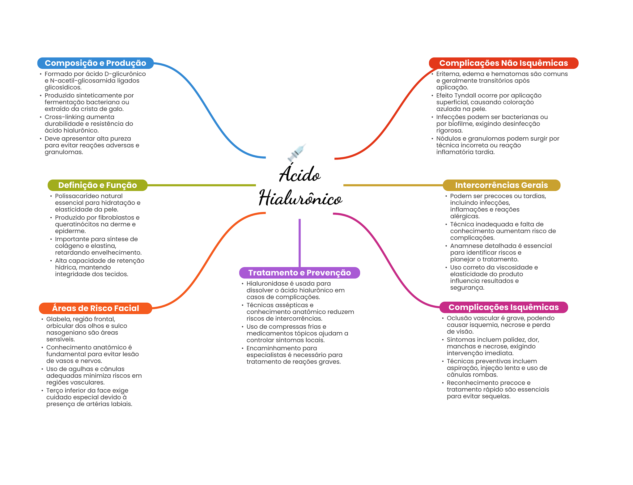 Composição e Produção Complicações Não Isquêmicas Formado por ácido D-glicurônico Eritema, edema e hematomas são comuns e ligados e geralmente transitórios após glicosídicos. aplicação. Produzido sinteticamente por Efeito Tyndall ocorre por aplicação fermentação bacteriana ou superficial, causando coloração extraído da crista de galo. azulada na pele. Cross-linking aumenta Infecções podem ser bacterianas ou durabilidade e resistência do por biofilme, exigindo desinfecção ácido hialurônico. rigorosa. Deve apresentar alta pureza Nódulos e granulomas podem surgir por para evitar reações adversas e técnica incorreta ou reação granulomas. inflamatória tardia. Acido Definição e Função Intercorrências Gerais Polissacarídeo natural Hialurônico Podem ser precoces ou tardias, essencial para hidratação e incluindo infecções, elasticidade da pele. inflamações e reações Produzido por fibroblastos e alérgicas. queratinócitos na derme e Técnica inadequada e falta de epiderme. conhecimento aumentam risco de Importante para síntese de complicações. colágeno e elastina, Anamnese detalhada é essencial retardando envelhecimento. para identificar riscos e Alta capacidade de retenção planejar O tratamento. hídrica, mantendo Uso correto da viscosidade e integridade dos tecidos. Tratamento e Prevenção elasticidade do produto Hialuronidase é usada para influencia resultados e dissolver ácido hialurônico em segurança. casos de complicações. Áreas de Risco Facial Técnicas assépticas e conhecimento anatômico reduzem Complicações Isquêmicas Glabela, região frontal, riscos de intercorrências. Oclusão vascular é grave, podendo orbicular dos olhos e sulco Uso de compressas frias e causar isquemia, necrose e perda nasogeniano são áreas medicamentos tópicos ajudam a de visão. sensíveis. controlar sintomas locais. Sintomas incluem palidez, dor, Conhecimento anatômico é Encaminhamento para manchas e necrose, exigindo fundamental para evitar lesão especialistas é necessário para intervenção imediata. de vasos e nervos. tratamento de reações graves. Técnicas preventivas incluem Uso de agulhas e cânulas aspiração, injeção lenta e uso de adequadas minimiza riscos em cânulas rombas. regiões vasculares. Reconhecimento precoce e Terço inferior da face exige tratamento rápido são essenciais cuidado especial devido à para evitar sequelas. presença de artérias labiais.
