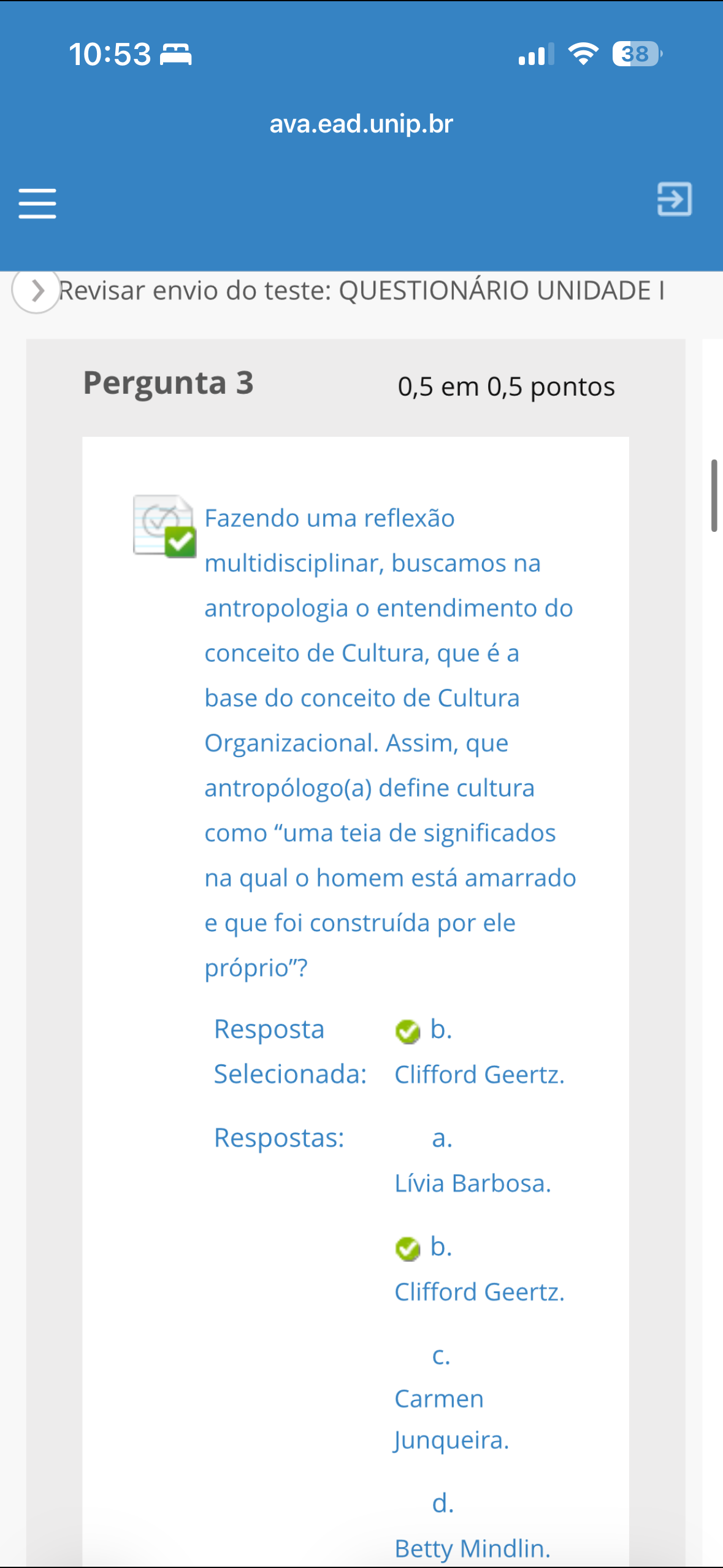 10:53 38 ava.ead.unip.br Revisar envio do teste: QUESTIONÁRIO UNIDADE I Pergunta 3 0,5 em 0,5 pontos Fazendo uma reflexão multidisciplinar, buscamos na antropologia entendimento do conceito de Cultura, que é a base do conceito de Cultura Organizacional. Assim, que antropólogo(a) define cultura como "uma teia de significados na qual homem está amarrado e que foi construída por ele próprio"? Resposta b. Selecionada: Clifford Geertz. Respostas: a. Lívia Barbosa. b. Clifford Geertz. C. Carmen Junqueira. d. Betty Mindlin.