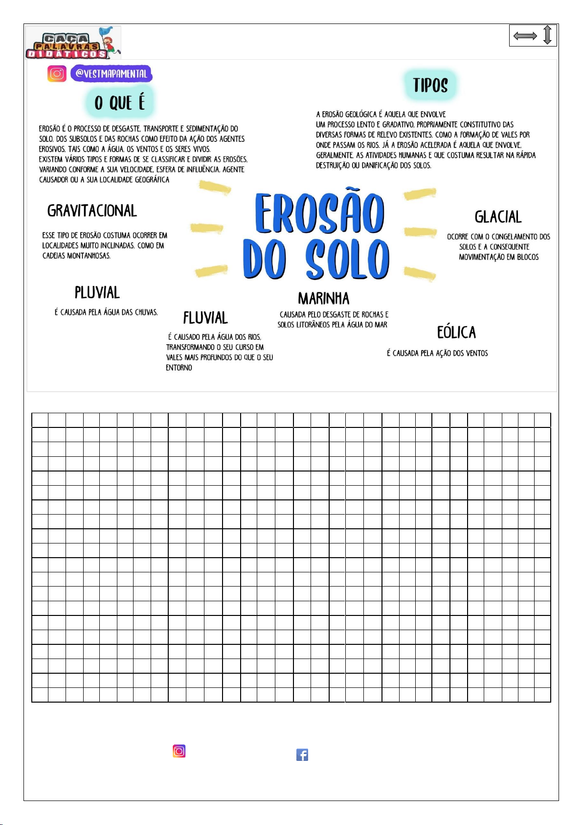 @cacapalavrasdidaticos Caça-palavras didáticos EROSÃO DO SOLO - @Vestmapamental ENCONTRE AS PALAVRAS DO MAPA MENTAL ACIMA: B O A C I U R T S E D A C I F A R G O E G C K F R A U N K I O Y C H L J S A S O H N A T N O M Q P E L D Q O O X D R T Q C I V S G H Q F O W Z U U U G B I K S U P A U A Q U T B G U D J S E L A V J G K C M C W A M E B W M L C G S U Y W Z S A A O E E L A I V U L F W D I Z O D V Y D L I T O R A N E O S L Q D D E S G A S T E R H N W L M E M I J L T R K R Q G V Z J Y I N M Y R J F M W S O L O P I Q Y B U O U E R U G E I I B K M X Q O K G A S P A H I W X T C E G U E R Q B B T O V G B H E L B X J C Q E M F X M D H K Q S A C F I Y U P A L S R C O N G E L A M E N T O S A S I A A U D T N O Q M A R O E A V D T V S A N A M U H T R A N S P O R T E Y S J G H M G R V J M A E K C X O T Z S H Y V C U C V R J K O T W B G V I E I F Q C L S D N O F J U J A W I F T V T X I P O A E L C C S T T Q A O O Y Z J S G B K A H N I R A M D R U Q G U A H A Z A C D O C T C A P N F S R C B L E W F Z G M U H E Y C E G Y C H I I I N Q Q K J L O Q U O S L A I V U L P O N X I X S T I U I Z D E L M T R E L E V O C H S Y W M D Q A T A A D J K O V D P A V O N Q T L O S A H C O R H O R C F G E D L A L V N A N E D A H K H G J S X A I T D J F P W E G Z S P E A U G A S U Y E C J Y G Y K G Z Z W C T F S K G O Y Z F P H U V H L EROSÃO, SOLO, DESGASTE, TRANSPORTE, SEDIMENTAÇÃO, SUBSOLOS, ROCHAS, AGENTES, ÁGUA, VENTOS, SERES VIVOS, VELOCIDADE, GEOGRÁFICA, GRAVITACIONAL, MONTANHOSAS, PLUVIAL, CHUVAS, GEOLÓGICA, RELEVO, HUMANAS, DESTRUIÇÃO, FLUVIAL, RIOS, VALES, MARINHA, LITORÂNEOS, MAR, EÓLICA, GLACIAL, CONGELAMENTOS.