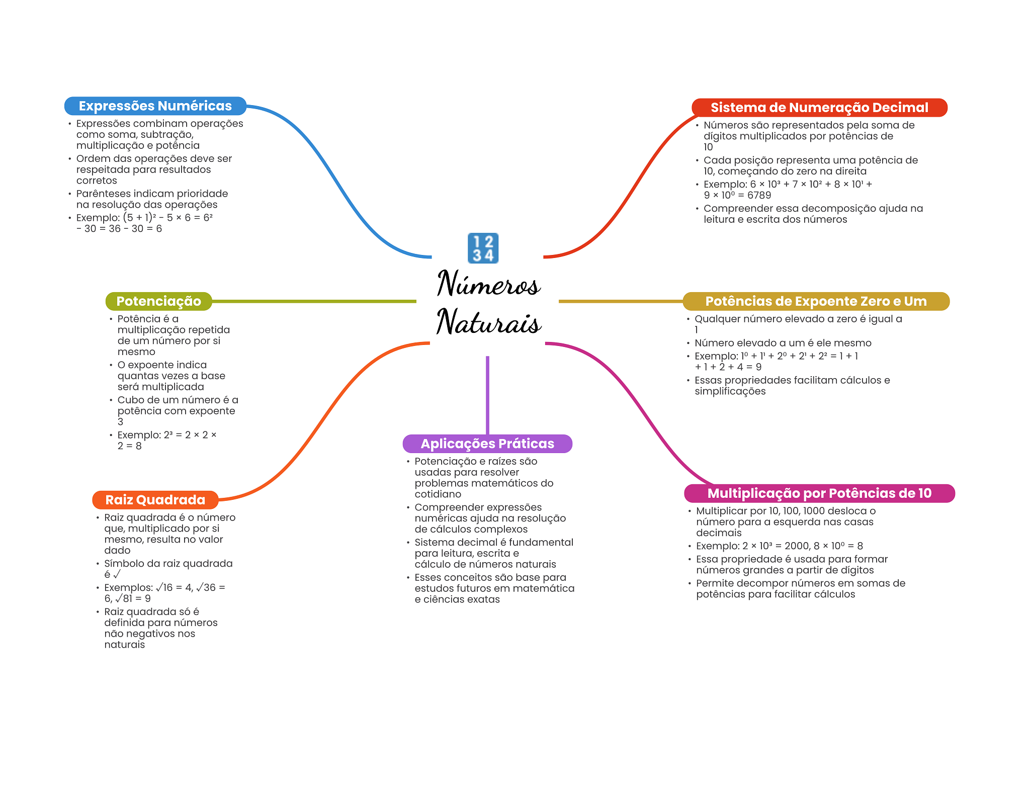 Expressões Numéricas Sistema de Numeração Decimal Expressões combinam operações Números são representados pela soma de como soma, subtração, dígitos multiplicados por potências de multiplicação e potência 10 Ordem das operações deve ser Cada posição representa uma potência de respeitada para resultados 10, começando do zero na direita corretos Exemplo: Parênteses indicam prioridade 9 10° = 6789 na resolução das operações Compreender essa decomposição ajuda na Exemplo: (5 6 leitura e escrita dos números 12 34 Números Potenciação Potências de Expoente Zero e Um Potência é a Naturais Qualquer número elevado a zero é igual a multiplicação repetida 1 de um número por si Número elevado a um é ele mesmo mesmo O expoente indica +1+2+4=9 quantas vezes a base Essas propriedades facilitam cálculos e será multiplicada simplificações Cubo de um número é a potência com expoente 3 Exemplo: Aplicações Práticas Potenciação e raízes são usadas para resolver problemas matemáticos do cotidiano Raiz Quadrada Multiplicação por Potências de 10 Compreender expressões Multiplicar por 10, 100, 1000 desloca O Raiz quadrada é número numéricas ajuda na resolução número para a esquerda nas casas que, multiplicado por si de cálculos complexos decimais mesmo, resulta no valor Sistema decimal é fundamental dado Exemplo: 2 = 2000, 8 X 10° 8 para leitura, escrita e Símbolo da raiz quadrada cálculo de números naturais Essa propriedade é usada para formar números grandes a partir de dígitos Esses conceitos são base para Exemplos: = 4, = estudos futuros em matemática Permite decompor números em somas de e ciências exatas potências para facilitar cálculos Raiz quadrada só é definida para números não negativos nos naturais