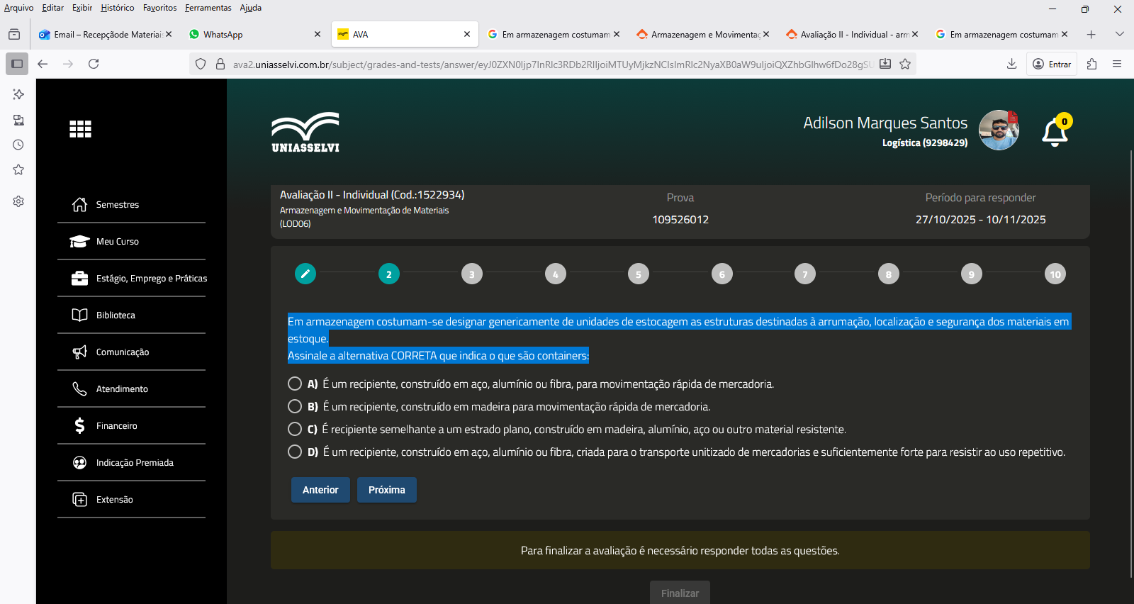 Arquivo Editar Exibir Histórico Fayoritos Ferramentas Ajuda X Email Recepçãode Materiais X WhatsApp X AVA Em armazenagem costumam Armazenagem e Movimenta X Avaliação II - Individual arm X Em armazenagem costumam X + Entrar III Adilson Marques Santos UNIASSELVI Logística (9298429) Avaliação II Individual (Cod.:1522934) Prova Período para responder Semestres Armazenagem e Movimentação de Materiais (LOD06) 109526012 27/10/2025 10/11/2025 Meu Curso Emprego e Práticas 2 5 6 7 8 10 Biblioteca Em armazenagem costumam-se designar genericamente de unidades de estocagem as estruturas destinadas à arrumação, localização e segurança dos materiais em estoque. Comunicação Assinale a alternativa CORRETA que indica que são containers: Atendimento A) É um recipiente, construído em aço, alumínio ou fibra, para movimentação rápida de mercadoria. B) É um recipiente, construído em madeira para movimentação rápida de mercadoria. $ Financeiro C) É recipiente semelhante a um estrado plano, construído em madeira, alumínio, aço ou outro material resistente. D) É um recipiente, construído em aço, ou fibra, criada para 0 transporte unitizado de mercadorias e suficientemente forte para resistir ao uso repetitivo. Indicação Premiada Anterior Próxima + Extensão Para finalizar a avaliação é necessário responder todas as questões. Finalizar