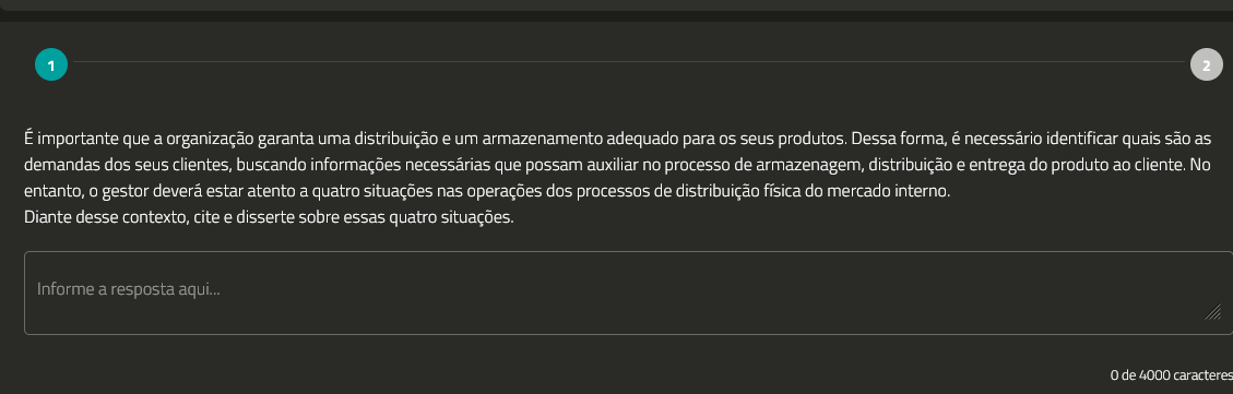 1 É importante que a organização garanta uma distribuição e um armazenamento adequado para seus produtos. Dessa forma, é necessário identificar quais são as demandas dos seus clientes, buscando informações necessárias que possam auxiliar no processo de armazenagem, distribuição e entrega do produto ao cliente. No entanto, 0 gestor deverá estar atento a quatro situações nas operações dos processos de distribuição física do mercado interno. Diante desse contexto, cite e disserte sobre essas quatro situações. Informe a resposta aqui... 0 de 4000 caracteres