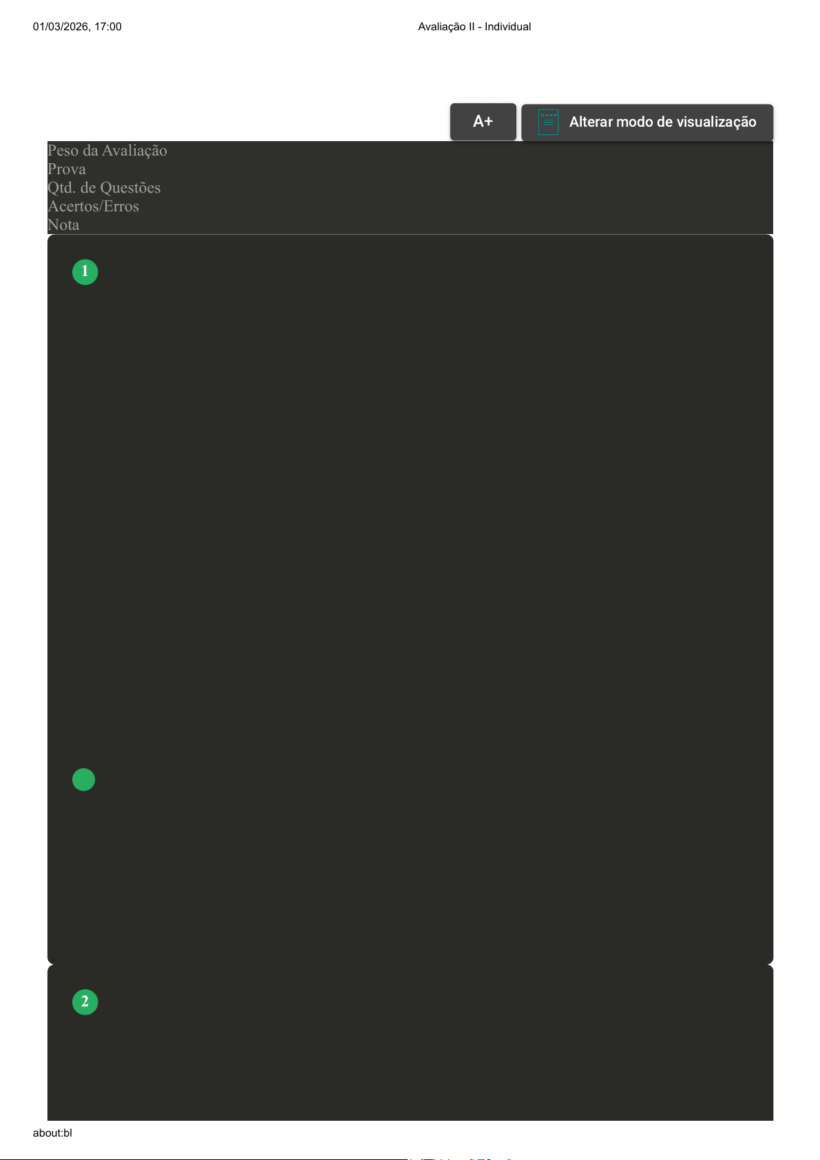 Prova Impressa GABARITO | Avaliação II - Individual (Cod.:1600990) Peso da Avaliação 1,50 Prova 114717587 Qtd. de Questões 10 Acertos/Erros 10/0 Nota 10,00 O túnel do carpo é uma região osteofibrosa em que se localizam quatro tendões do músculo flexor superficial dos dedos (FSD), quatro tendões do músculo flexor profundo dos dedos (FPD), um tendão do músculo flexor longo do polegar (FLP) e o nervo mediano, que possui origem no plexo braquial. Comumente, o túnel do carpo é alvo de inflamação por neuropatias compressivas, favorecidas pela localização delicada do nervo mediano. Fonte: BAPTISTA, A. D.; SOARES, M. A.; MONTEIRO, M. R. Síndrome do túnel do carpo: do diagnóstico ao tratamento: uma revisão da literatura. Revista Científica da Faculdade de Medicina de Campos, Campos dos Goytacazes, v. 19, n. 2, p. 37–43, 2024. Disponível em: https://revista.fmc.br/ojs/index.php/RCFMC/article/view/1059. Acesso em: 31 jan. 2026. Com base nas informações apresentadas, avalie as asserções a seguir e a relação proposta entre elas: I. A síndrome do túnel do carpo (STC) é causada por uma lesão direta no nervo mediano, sendo comum em pessoas com menos de 20 anos. PORQUE II. Os sintomas da STC se manifestam principalmente nos dedos mínimo e anelar, já que esses são os mais usados nas atividades manuais. A respeito dessas asserções, assinale a opção correta: A A asserção I é uma proposição verdadeira e a II é uma proposição falsa. B As asserções I e II são verdadeiras, e a II é uma justificativa correta da I. C As asserções I e II são falsas. D As asserções I e II são verdadeiras, mas a II não é uma justificativa correta da I. E A asserção I é uma proposição falsa e a II é uma proposição verdadeira. A Síndrome de Burnout (SB) teve suas primeiras citações por Herbert Freudenberg, em 1974, nos Estados Unidos da América (EUA) sobre estudos da perda de motivação e comprometimento, tendo como outros sintomas psíquicos e físicos perda de energia quando manifestada por voluntários em tratamento de uma instituição de drogados. Na mesma época, Christina Maslach VOLTAR A+Aumentar, FonteAlterar modo de visualização 1 2 01/03/2026, 17:00 Avaliação II - Individual about:blank 1/8 mencionou em seus estudos a expressão Burnout como sendo a carga emocional do trabalho no comportamento de profissionais da saúde. Fonte: MENEZES, P. C. M. et al. Síndrome de Burnout: uma análise reflexiva. Revista de Enfermagem UFPE on-line, Recife, p. 5092–5101, 2017. Disponível em: https://periodicos.ufpe.br/revistas/revistaenfermagem/article/view/25086/25352. Acesso em: 22 jan. 2026. Considerando o texto e as informações sobre a Síndrome de Burnout, analise as afirmativas a seguir: I. A sobrecarga profissional é apontada como a principal causa do Burnout. II. A exaustão, o estresse elevado e a fadiga extrema são características desse transtorno. III. A Síndrome de Burnout está relacionada ao ambiente de trabalho e não a fatores exclusivamente pessoais. IV. O Burnout pode ocorrer em profissões com alta exigência, competitividade ou grandes responsabilidades. É correto o que se afirma em: A I, II, III e IV. B III e IV, apenas. C I, II e III, apenas. D II e IV, apenas. E I, apenas. A exposição a agentes nocivos no trabalho pode desencadear sérios problemas à saúde dos pulmões. Entre os principais riscos enfrentados pelas empresas, estão as doenças respiratórias ocupacionais. O tratamento das doenças ocupacionais varia conforme a patologia e a gravidade dos sintomas. Fonte: NUNES, D; S. et al. Poluição do ar no local de trabalho: impactos e prevenção em doenças respiratórias ocupacionais. Brazilian Journal of Implantology and Health Sciences, v. 6, n. 5, p. 1776-1785, 2024. Com base nas informações apresentadas, avalie as asserções a seguir e a relação proposta entre elas: I. O tratamento das pneumoconioses pode incluir o uso de medicamentos broncodilatadores e anti- inflamatórios. PORQUE II. A principal medida terapêutica para muitas doenças ocupacionais é a remoção da exposição ao agente causador da doença. A respeito dessas asserções, assinale a opção correta: A A asserção I é uma proposição falsa e a II é uma proposição verdadeira. 3 01/03/2026, 17:00 Avaliação II - Individual about:blank 2/8 B As asserções I e II são verdadeiras, mas a II não é uma justificativa correta da I. C As asserções I e II são falsas. D A asserção I é uma proposição verdadeira e a II é uma proposição falsa. E As asserções I e II são verdadeiras, e a II é uma justificativa correta da I. Atuar na reabilitação de pacientes com limitações exige um alto esforço emocional, que se intensifica se o terapeuta nutre expectativas irreais. Esse quadro de esgotamento é potencializado por fatores externos, como a dificuldade em conciliar trabalho e família, e por fatores internos, como características de neuroticismo. Fonte: REVOREDO, J. A.; OLIVEIRA, A. J. de; FERRO, L. R. M. Exaustão emocional: impacto nos profissionais de saúde. Psicologia e Saúde em Debate, v. 11, n. 1, p. 292–309, 2025. Disponível em: https://psicodebate.dpgpsifpm.com.br/index.php/periodico/article/view/1265. Acesso em: 22 jan. 2026. Com base nas informações apresentadas, avalie as asserções a seguir e a relação proposta entre elas: I. A implementação de políticas e medidas organizacionais é essencial para combater o esgotamento dos profissionais da Terapia Ocupacional. PORQUE II. Essas ações contribuem para a criação de um ambiente de trabalho saudável e produtivo, promovendo o bem-estar dos profissionais. A respeito dessas asserções, assinale a opção correta: A As asserções I e II são verdadeiras, mas a II não é uma justificativa correta da I. B As asserções I e II são falsas. C A asserção I é uma proposição falsa e a II é uma proposição verdadeira. D As asserções I e II são verdadei
