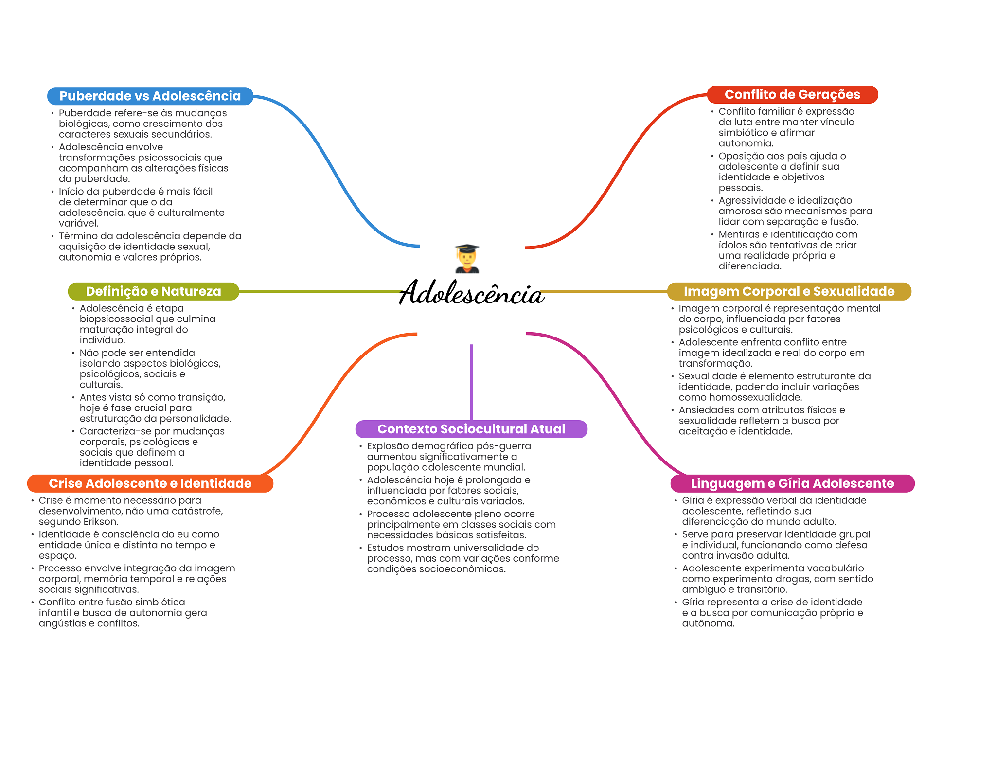 Puberdade vs Adolescência Conflito de Gerações Puberdade refere-se às mudanças Conflito familiar é expressão biológicas, como crescimento dos da luta entre manter vínculo caracteres sexuais secundários. simbiótico e afirmar Adolescência envolve autonomia. transformações psicossociais que Oposição aos pais ajuda acompanham as alterações físicas adolescente a definir sua da puberdade. identidade e objetivos Início da puberdade é mais fácil pessoais. de determinar que da Agressividade e idealização adolescência, que é culturalmente amorosa são mecanismos para variável. lidar com separação e fusão. Término da adolescência depende da Mentiras e identificação com aquisição de identidade sexual, ídolos são tentativas de criar autonomia e valores próprios. uma realidade própria e diferenciada. Definição e Natureza Adolescência Imagem Corporal e Sexualidade Adolescência é etapa Imagem corporal é representação mental biopsicossocial que culmina do corpo, influenciada por fatores maturação integral do psicológicos e culturais. indivíduo. Adolescente enfrenta conflito entre Não pode ser entendida imagem idealizada e real do corpo em isolando aspectos biológicos, transformação. psicológicos, sociais e Sexualidade é elemento estruturante da culturais. identidade, podendo incluir variações Antes vista só como transição, como homossexualidade. hoje é fase crucial para Ansiedades com atributos físicos e estruturação da personalidade. sexualidade refletem a busca por Caracteriza-se por mudanças Contexto Sociocultural Atual aceitação e identidade. corporais, psicológicas e Explosão demográfica pós-guerra sociais que definem a aumentou significativamente a identidade pessoal. população adolescente mundial. Crise Adolescente e Identidade Adolescência hoje é prolongada e Linguagem e Gíria Adolescente influenciada por fatores sociais, Crise é momento necessário para econômicos e culturais variados. Gíria é expressão verbal da identidade desenvolvimento, não uma catástrofe, Processo adolescente pleno ocorre adolescente, refletindo sua segundo Erikson. principalmente em classes sociais com diferenciação do mundo adulto. Identidade é consciência do eu como necessidades básicas satisfeitas. Serve para preservar identidade grupal entidade única e distinta no tempo e Estudos mostram universalidade do e individual, funcionando como defesa espaço. processo, mas com variações conforme contra invasão adulta. Processo envolve integração da imagem condições socioeconômicas. Adolescente experimenta vocabulário corporal, memória temporal e relações como experimenta drogas, com sentido sociais significativas. ambíguo e transitório. Conflito entre fusão simbiótica Gíria representa a crise de identidade infantil e busca de autonomia gera e a busca por comunicação própria e angústias e conflitos. autônoma.