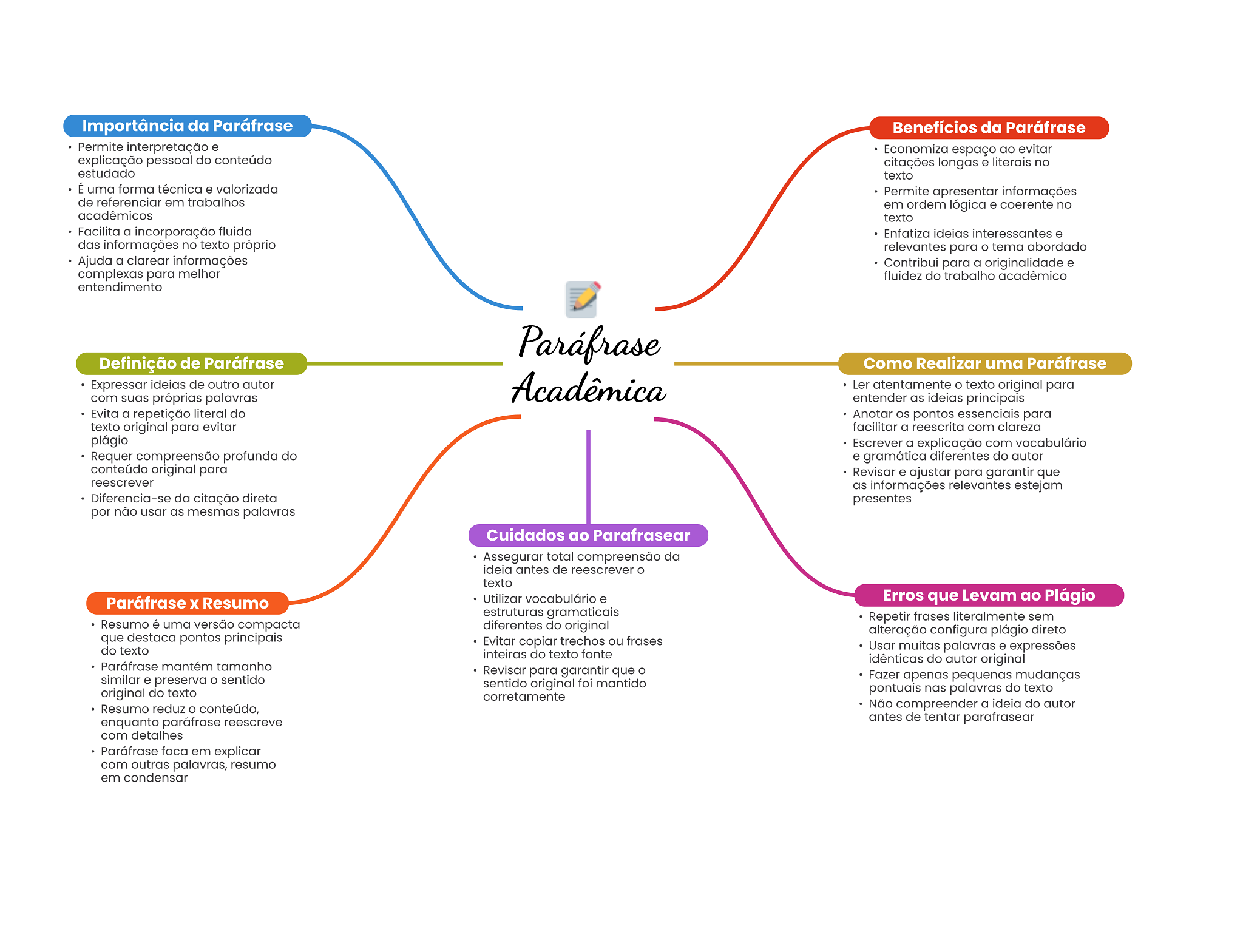 Importância da Paráfrase Benefícios da Paráfrase Permite interpretação e Economiza espaço ao evitar explicação pessoal do conteúdo citações longas e literais no estudado texto É uma forma técnica e valorizada Permite apresentar informações de referenciar em trabalhos em ordem lógica e coerente no acadêmicos texto Facilita a incorporação fluida Enfatiza ideias interessantes e das informações no texto próprio relevantes para tema abordado Ajuda a clarear informações Contribui para a originalidade e complexas para melhor fluidez do trabalho acadêmico entendimento Paráfrase Definição de Paráfrase Como Realizar uma Paráfrase Expressar ideias de outro autor com suas próprias palavras Acadêmica Ler atentamente texto original para entender as ideias principais Evita a repetição literal do Anotar pontos essenciais para texto original para evitar facilitar a reescrita com clareza plágio Escrever a explicação com vocabulário Requer compreensão profunda do e gramática diferentes do autor conteúdo original para Revisar e ajustar para garantir que reescrever as informações relevantes estejam Diferencia-se da citação direta presentes por não usar as mesmas palavras Cuidados ao Parafrasear Assegurar total compreensão da ideia antes de reescrever texto Paráfrase Resumo Utilizar vocabulário e Erros que Levam ao Plágio estruturas gramaticais Repetir frases literalmente sem Resumo é uma versão compacta diferentes do original alteração configura plágio direto que destaca pontos principais Evitar copiar trechos ou frases do texto Usar muitas palavras e expressões inteiras do texto fonte idênticas do autor original Paráfrase mantém tamanho Revisar para garantir que O similar e preserva sentido Fazer apenas pequenas mudanças sentido original foi mantido original do texto pontuais nas palavras do texto corretamente Resumo reduz conteúdo, Não compreender a ideia do autor enquanto paráfrase reescreve antes de tentar parafrasear com detalhes Paráfrase foca em explicar com outras palavras, resumo em condensar