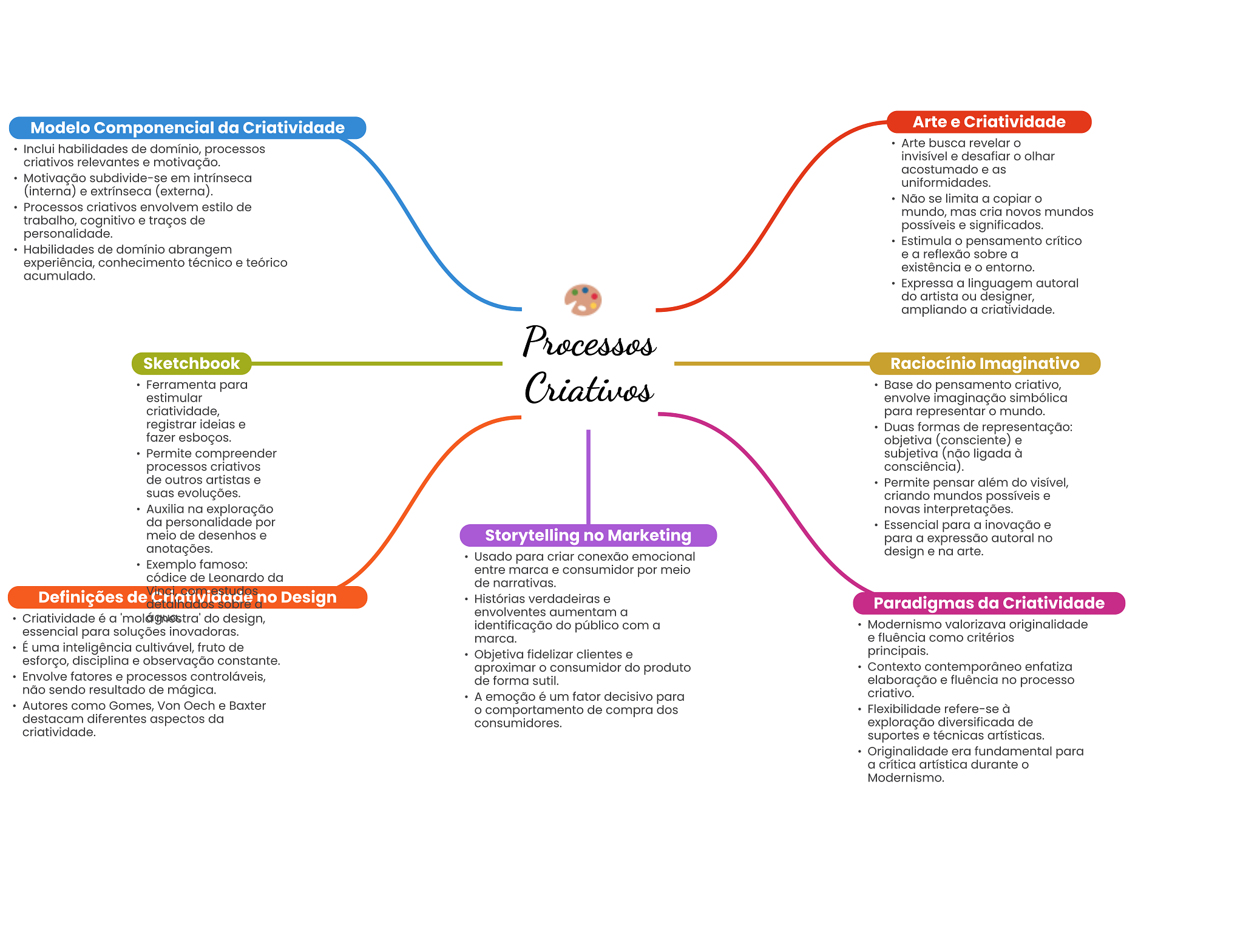Modelo Componencial da Criatividade Arte e Criatividade Arte busca revelar o Inclui habilidades de domínio, processos invisível e desafiar olhar criativos relevantes e motivação. acostumado e as Motivação subdivide-se em intrínseca uniformidades. (interna) e extrínseca (externa). Não se limita a copiar Processos criativos envolvem estilo de mundo, mas cria novos mundos trabalho, cognitivo e traços de possíveis e significados. personalidade. Estimula pensamento crítico Habilidades de domínio abrangem experiência, conhecimento técnico e teórico existência e O entorno. acumulado. Expressa a linguagem autoral do artista ou designer, ampliando a criatividade. Processos Sketchbook Raciocínio Imaginativo Ferramenta para Criativos Base do pensamento criativo, estimular envolve imaginação simbólica criatividade, para representar mundo. registrar ideias e Duas formas de representação: fazer esboços. objetiva (consciente) e Permite compreender subjetiva (não ligada à processos criativos consciência). de outros artistas e Permite pensar além do visível, suas evoluções. criando mundos possíveis e Auxilia na exploração novas interpretações. da personalidade por Essencial para a inovação e meio de desenhos e Storytelling no Marketing para a expressão autoral no anotações. Usado para criar conexão emocional design e na arte. Exemplo famoso: entre marca e consumidor por meio códice de Leonardo da de narrativas. Definições de Criatividade no Design Histórias verdadeiras e Paradigmas da Criatividade envolventes aumentam a Criatividade é a do design, essencial para soluções inovadoras. identificação do público com a Modernismo valorizava originalidade marca. e fluência como critérios É uma inteligência cultivável, fruto de Objetiva fidelizar clientes e principais. esforço, disciplina e observação constante. aproximar O consumidor do produto Contexto contemporâneo enfatiza Envolve fatores e processos controláveis, de forma sutil. elaboração e fluência no processo não sendo resultado de mágica. A emoção é um fator decisivo para criativo. Autores como Gomes, Von Oech e Baxter comportamento de compra dos Flexibilidade refere-se à destacam diferentes aspectos da consumidores. exploração diversificada de criatividade. suportes e técnicas artísticas. Originalidade era fundamental para a crítica artística durante Modernismo.
