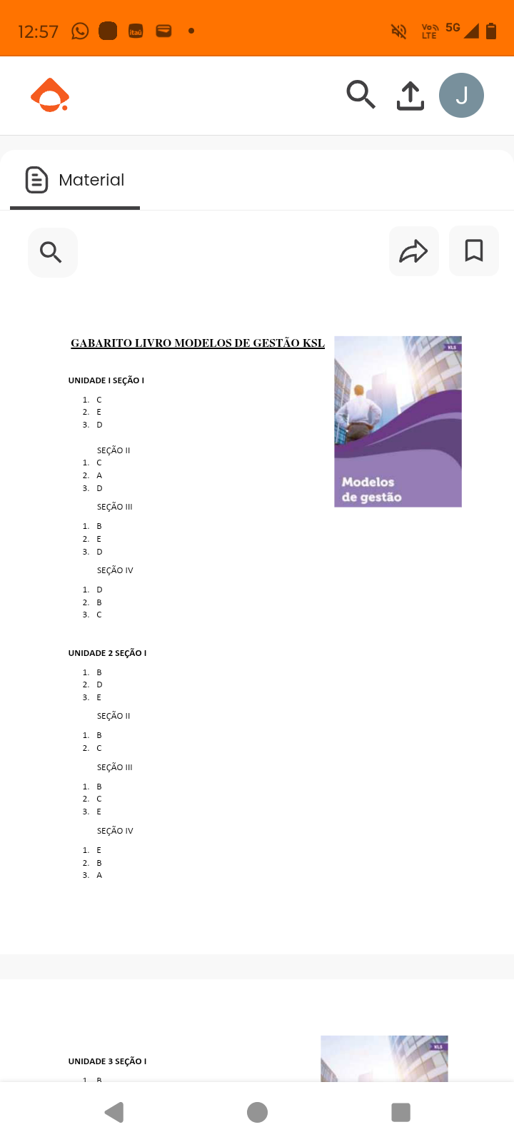 12:57 5G LTE J Material GABARITO LIVRO MODELOS DE GESTÃO KSL UNIDADE SEÇÃO 1. C 2. E 3. D SEÇÃO II 1. C 2. A Modelos de gestão SEÇÃO III 1. B 2. E 3. D SEÇÃO IV 2. B 3. UNIDADE 2 SEÇÃO I 1. B 2. D 3. E SEÇÃO II 1. B 2. C SEÇÃO III 2. C 3. E SEÇÃO IV 1. E 2. B 3. A UNIDADE 3 SEÇÃO I 1 R