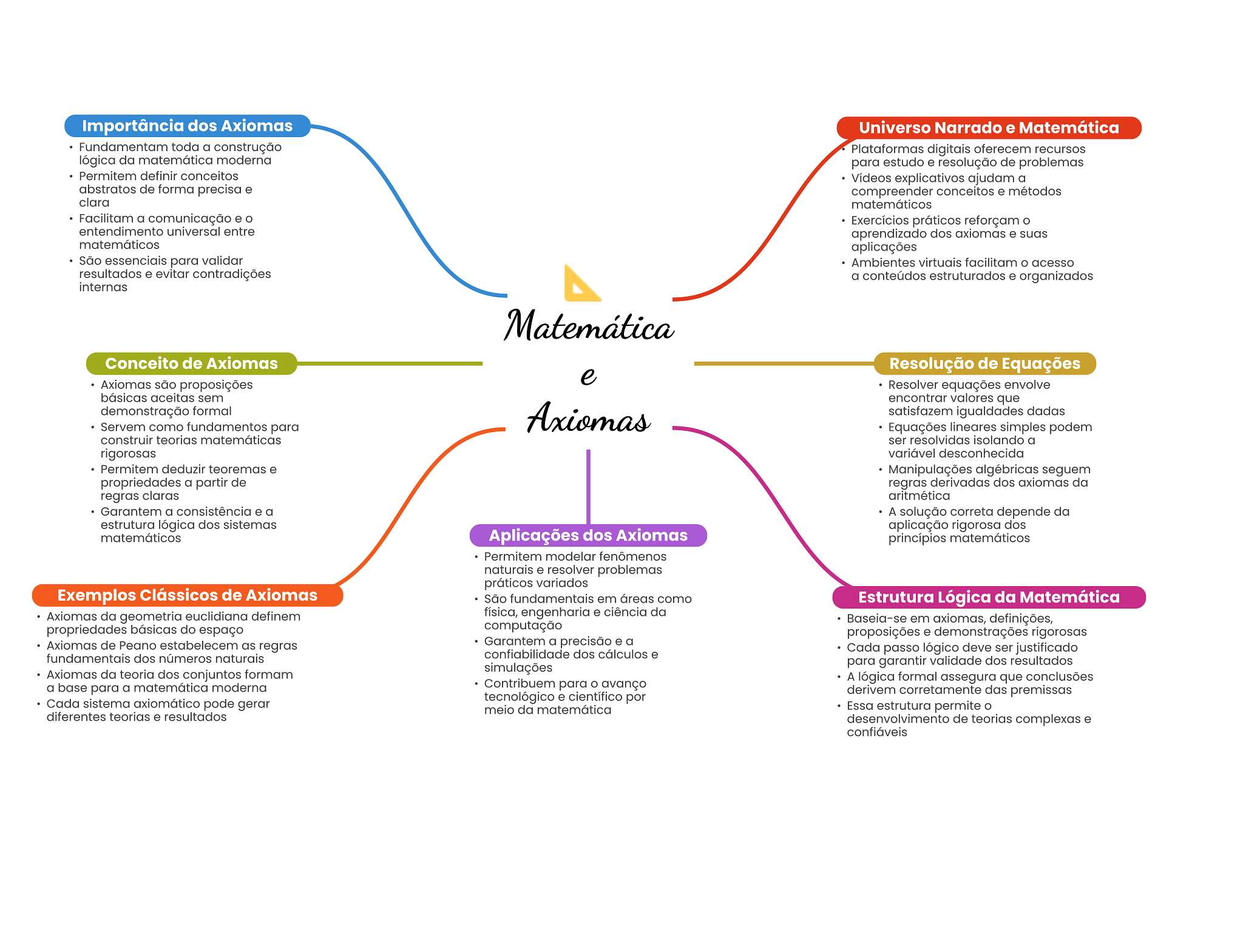 Importância dos Axiomas Universo Narrado e Matemática Fundamentam toda a construção Plataformas digitais oferecem recursos lógica da matemática moderna para estudo e resolução de problemas Permitem definir conceitos Vídeos explicativos ajudam a abstratos de forma precisa e compreender conceitos e métodos clara matemáticos Facilitam a comunicação e Exercícios práticos reforçam entendimento universal entre aprendizado dos axiomas e suas matemáticos aplicações São essenciais para validar Ambientes virtuais facilitam acesso resultados e evitar contradições a conteúdos estruturados e organizados internas Matemática Conceito de Axiomas Resolução de Equações e Axiomas são proposições Resolver equações envolve básicas aceitas sem encontrar valores que demonstração formal Axiomas satisfazem igualdades dadas Servem como fundamentos para Equações lineares simples podem construir teorias matemáticas ser resolvidas isolando a rigorosas variável desconhecida Permitem deduzir teoremas e Manipulações algébricas seguem propriedades a partir de regras derivadas dos axiomas da regras claras aritmética Garantem a consistência e a A solução correta depende da estrutura lógica dos sistemas aplicação rigorosa dos matemáticos Aplicações dos Axiomas princípios matemáticos Permitem modelar fenômenos naturais e resolver problemas práticos variados Exemplos Clássicos de Axiomas São fundamentais em áreas como Estrutura Lógica da Matemática Axiomas da geometria euclidiana definem física, engenharia e ciência da Baseia-se em axiomas, definições, propriedades básicas do espaço computação proposições e demonstrações rigorosas Axiomas de Peano estabelecem as regras Garantem a precisão e a confiabilidade dos cálculos e Cada passo lógico deve ser justificado fundamentais dos números naturais simulações para garantir validade dos resultados Axiomas da teoria dos conjuntos formam a base para a matemática moderna Contribuem para avanço A lógica formal assegura que conclusões Cada sistema axiomático pode gerar tecnológico e científico por derivem corretamente das premissas meio da matemática Essa estrutura permite diferentes teorias e resultados desenvolvimento de teorias complexas e confiáveis