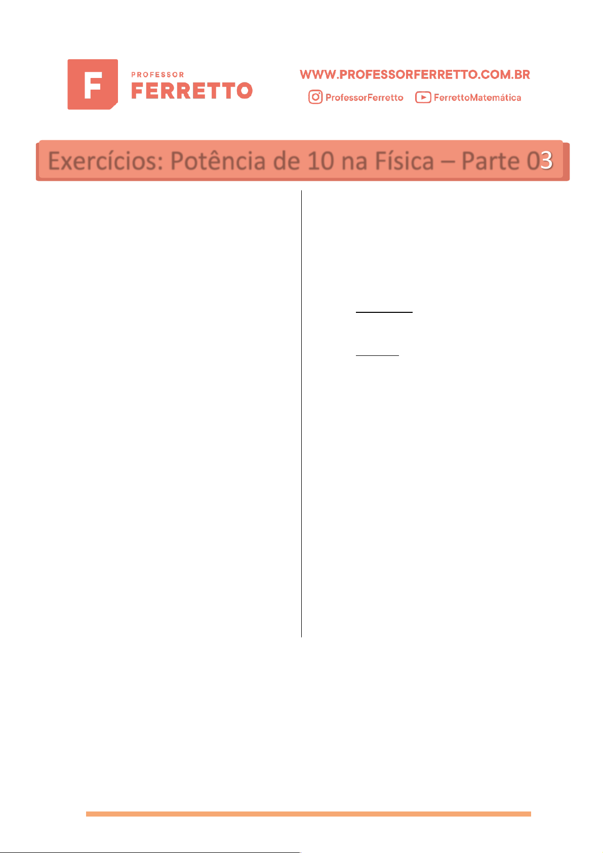 1 1. Represente todos os valores abaixo através de notação científica: a) 0,012 𝑘𝑔 b) 567.000 𝑚 c) 934,7 𝑁/𝑚! d) 80.000.000 ∙ 10"#$ 𝑊 e) 200 ∙ 10"% 𝐴 f) 0,007 ∙ 10"& 𝐵 g) 250.000 ∙ 10!' 𝐽 2. Resolva as seguintes operações envolvendo potências de 10 e expresse os resultados em notação científica: a) 2,5 ∙ 10"% ∙ 8,0 ∙ 10% b) ! ∙ $%! ∙ & ∙ $%" '& ∙ $%#$ c) () ∙ $%%#* & (& ∙ $%%!)# GABARITO: 1.a) 1,2 ∙ 10!" 𝑘𝑔 1.b) 5,67 ∙ 10# 𝑚 1.c) 9,347 ∙ 10" 𝑁/𝑚" 1.d) 8,0 ∙ 10!$ 𝑊 1.e) 2,0 ∙ 10!" 𝐴 1.f) 7,0 ∙ 10!% 𝐵 1.g) 2,5 ∙ 10"& 𝐽 2.a) 2,0 ∙ 10' 2.b) 5,0 ∙ 10!'( 2.c) 1,35 ∙ 10# Exercícios: Potência de 10 na Física – Parte 03
