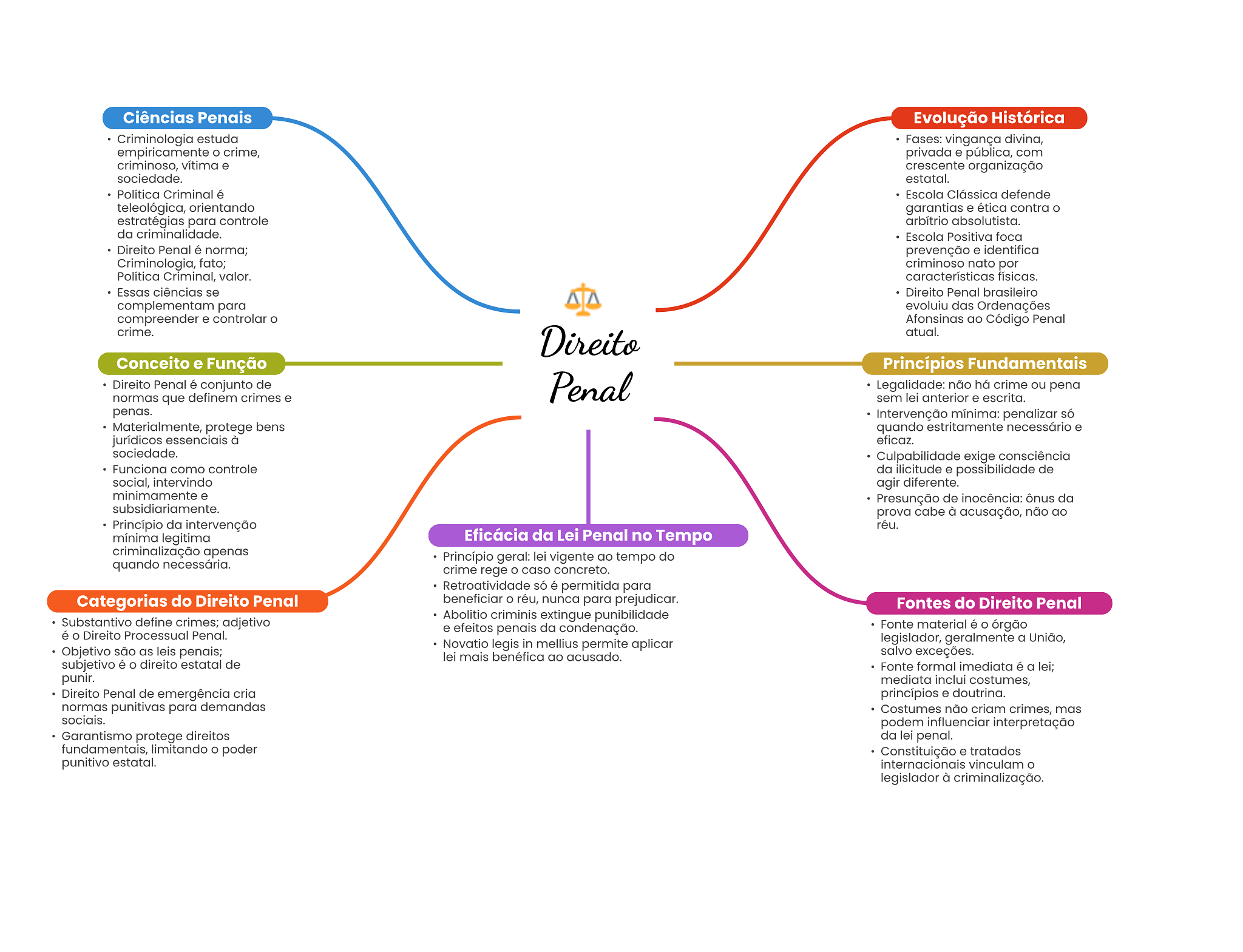 Ciências Penais Evolução Histórica Criminologia estuda Fases: vingança divina, empiricamente crime, privada e pública, com criminoso, vítima e crescente organização sociedade. estatal. Política Criminal é Escola Clássica defende teleológica, orientando garantias e ética contra estratégias para controle arbítrio absolutista. da criminalidade. Escola Positiva foca Direito Penal é norma; prevenção e identifica Criminologia, fato; criminoso nato por Política Criminal, valor. características físicas. Essas ciências se Direito Penal brasileiro complementam para evoluiu das Ordenações compreender e controlar Afonsinas ao Código Penal crime. Direito atual. Conceito e Função Princípios Fundamentais Direito Penal é conjunto de Penal Legalidade: não há crime ou pena normas que definem crimes e sem lei anterior e escrita. penas. Intervenção mínima: penalizar só Materialmente, protege bens quando estritamente necessário e jurídicos essenciais à eficaz. sociedade. Culpabilidade exige consciência Funciona como controle da ilicitude e possibilidade de social, intervindo agir diferente. minimamente e Presunção de inocência: ônus da subsidiariamente. prova cabe à acusação, não ao Princípio da intervenção réu. mínima legitima Eficácia da Lei Penal no Tempo criminalização apenas Princípio geral: lei vigente ao tempo do quando necessária. crime rege caso concreto. Retroatividade só é permitida para Categorias do Direito Penal beneficiar réu, nunca para prejudicar. Fontes do Direito Penal Abolitio criminis extingue punibilidade Substantivo define crimes; adjetivo e efeitos penais da condenação. Fonte material é O órgão é Direito Processual Penal. Novatio legis in mellius permite aplicar legislador, geralmente a União, Objetivo são as leis penais; lei mais benéfica ao acusado. salvo exceções. subjetivo é direito estatal de Fonte formal imediata é a lei; punir. mediata inclui costumes, Direito Penal de emergência cria princípios e doutrina. normas punitivas para demandas Costumes não criam crimes, mas sociais. podem influenciar interpretação Garantismo protege direitos da lei penal. fundamentais, limitando poder Constituição e tratados punitivo estatal. internacionais vinculam legislador à criminalização.