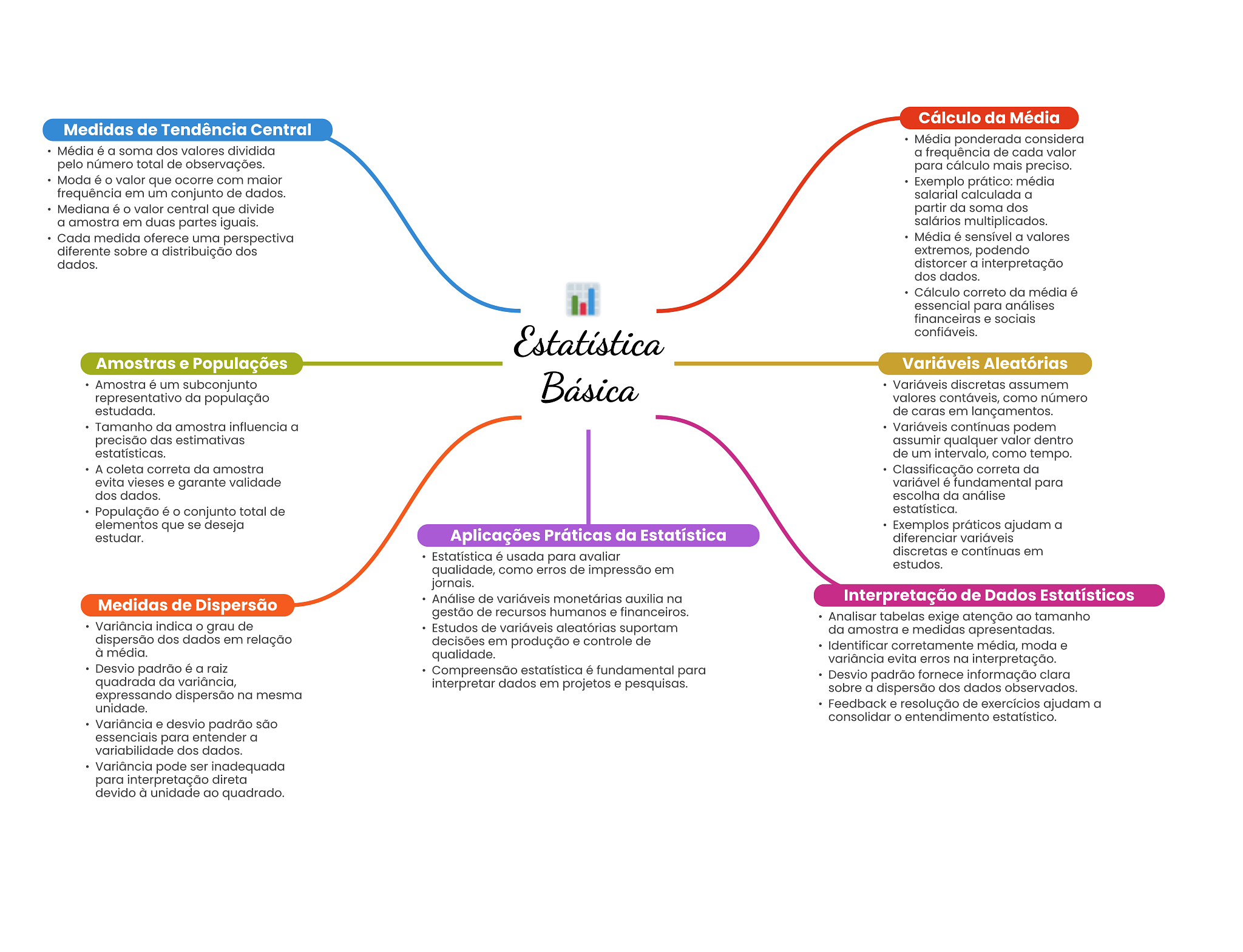 Cálculo da Média Medidas de Tendência Central Média ponderada considera Média é a soma dos valores dividida a frequência de cada valor pelo número total de observações. para cálculo mais preciso. Moda é valor que ocorre com maior Exemplo prático: média frequência em um conjunto de dados. salarial calculada a Mediana é valor central que divide partir da soma dos a amostra em duas partes iguais. salários multiplicados. Cada medida oferece uma perspectiva Média é sensível a valores diferente sobre a distribuição dos extremos, podendo dados. distorcer a interpretação dos dados. Cálculo correto da média é essencial para análises financeiras e sociais Estatística confiáveis. Amostras e Populações Variáveis Aleatórias Amostra é um subconjunto Básica Variáveis discretas assumem representativo da população valores contáveis, como número estudada. de caras em lançamentos. Tamanho da amostra influencia a Variáveis contínuas podem precisão das estimativas assumir qualquer valor dentro estatísticas. de um intervalo, como tempo. A coleta correta da amostra Classificação correta da evita vieses e garante validade variável é fundamental para dos dados. escolha da análise População é conjunto total de estatística. elementos que se deseja Exemplos práticos ajudam a estudar. Aplicações Práticas da Estatística diferenciar variáveis Estatística é usada para avaliar discretas e contínuas em qualidade, como erros de impressão em estudos. jornais. Análise de variáveis monetárias auxilia na Interpretação de Dados Estatísticos Medidas de Dispersão gestão de recursos humanos e financeiros. Analisar tabelas exige atenção ao tamanho Variância indica grau de Estudos de variáveis aleatórias suportam da amostra e medidas apresentadas. dispersão dos dados em relação decisões em produção e controle de Identificar corretamente média, moda e à média. qualidade. variância evita erros na interpretação. Desvio padrão é a raiz Compreensão estatística é fundamental para quadrada da variância, Desvio padrão fornece informação clara interpretar dados em projetos e pesquisas. expressando dispersão na mesma sobre a dispersão dos dados observados. unidade. Feedback e resolução de exercícios ajudam a consolidar entendimento estatístico. Variância e desvio padrão são essenciais para entender a variabilidade dos dados. Variância pode ser inadequada para interpretação direta devido à unidade ao quadrado.