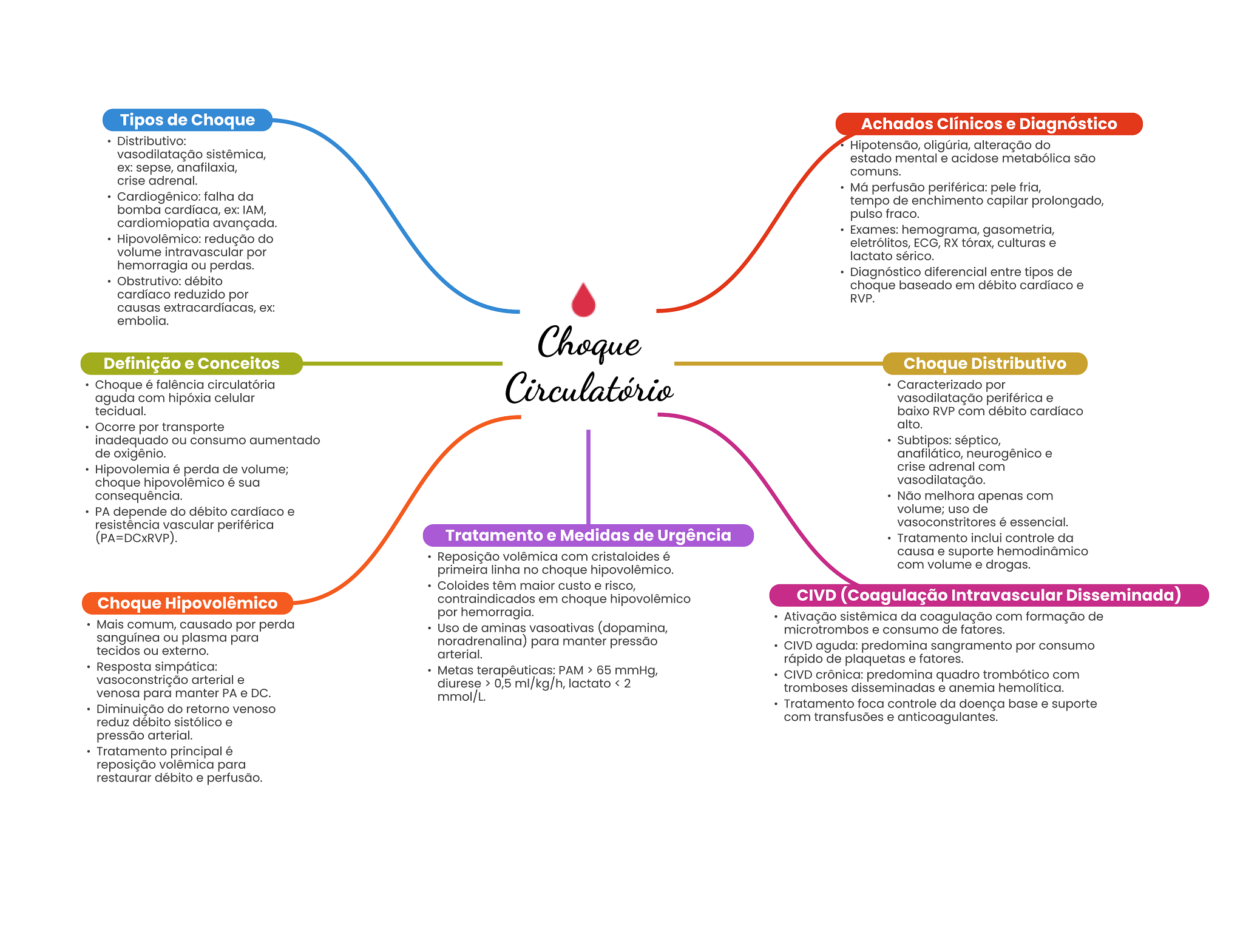Tipos de Choque Achados Clínicos e Diagnóstico Distributivo: Hipotensão, oligúria, alteração do vasodilatação sistêmica, estado mental e acidose metabólica são ex: sepse, anafilaxia, comuns. crise adrenal. Má perfusão periférica: pele fria, Cardiogênico: falha da tempo de enchimento capilar prolongado, bomba cardíaca, ex: IAM, pulso fraco. cardiomiopatia avançada. Exames: hemograma, gasometria, Hipovolêmico: redução do eletrólitos, ECG, RX tórax, culturas e volume intravascular por lactato sérico. hemorragia ou perdas. Diagnóstico diferencial entre tipos de Obstrutivo: débito choque baseado em débito cardíaco e cardíaco reduzido por RVP. causas extracardíacas, ex: embolia. Choque Definição e Conceitos Choque Distributivo Choque é falência circulatória Circulatório Caracterizado por aguda com hipóxia celular vasodilatação periférica e tecidual. baixo RVP com débito cardíaco Ocorre por transporte alto. inadequado ou consumo aumentado Subtipos: séptico, de oxigênio. anafilático, neurogênico e Hipovolemia é perda de volume; crise adrenal com choque hipovolêmico é sua vasodilatação. consequência. Não melhora apenas com PA depende do débito cardíaco e volume; uso de resistência vascular periférica vasoconstritores é essencial. (PA=DCxRVP). Tratamento e Medidas de Urgência Tratamento inclui controle da Reposição volêmica com cristaloides é causa e suporte hemodinâmico primeira linha no choque hipovolêmico. com volume e drogas. Coloides têm maior custo e risco, Choque Hipovolêmico contraindicados em choque hipovolêmico CIVD (Coagulação Intravascular Disseminada) por hemorragia. Ativação sistêmica da coagulação com formação de Mais comum, causado por perda Uso de aminas vasoativas (dopamina, microtrombos e consumo de fatores. sanguínea ou plasma para noradrenalina) para manter pressão tecidos ou externo. CIVD aguda: predomina sangramento por consumo arterial. rápido de plaquetas e fatores. Resposta simpática: Metas terapêuticas: PAM > 65 mmHg, vasoconstrição arterial e CIVD crônica: predomina quadro trombótico com diurese > 0,5 ml/kg/h, lactato 2 tromboses disseminadas e anemia hemolítica. venosa para manter PA e DC. Diminuição do retorno venoso Tratamento foca controle da doença base e suporte reduz débito sistólico e com transfusões e anticoagulantes. pressão arterial. Tratamento principal é reposição volêmica para restaurar débito e perfusão.