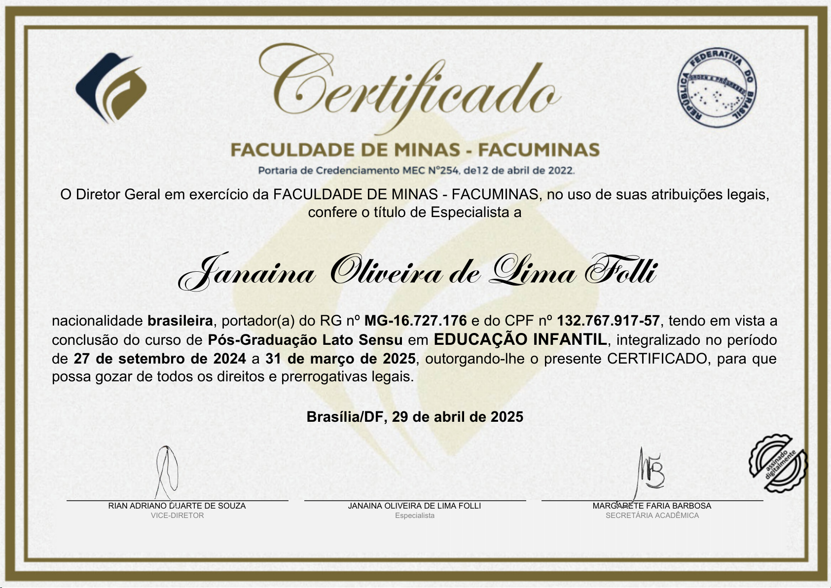 O Diretor Geral em exercício da FACULDADE DE MINAS - FACUMINAS, no uso de suas atribuições legais, confere o título de Especialista a Janaina Oliveira de Lima Folli nacionalidade brasileira, portador(a) do RG nº MG-16.727.176 e do CPF nº 132.767.917-57, tendo em vista a conclusão do curso de Pós-Graduação Lato Sensu em EDUCAÇÃO INFANTIL, integralizado no período de 27 de setembro de 2024 a 31 de março de 2025, outorgando-lhe o presente CERTIFICADO, para que possa gozar de todos os direitos e prerrogativas legais. Brasília/DF, 29 de abril de 2025 RIAN ADRIANO DUARTE DE SOUZA VICE-DIRETOR JANAINA OLIVEIRA DE LIMA FOLLI Especialista MARGARETE FARIA BARBOSA SECRETÁRIA ACADÊMICA HISTÓRICO ESCOLAR DE CURSO DE PÓS-GRADUAÇÃO LATO SENSU FACULDADE DE MINAS - FACUMINAS Portaria de credenciamento do MEC, 254 de 08 de Abril de 2022, publicado no DOU no dia 12 de abril de 2022 REGISTRO Registro nº 8708, folha nº 88, livro nº 1/FDM. BRASÍLIA/DF, 29 de abril de 2025 MARGARETE FARIA BARBOSA SECRETÁRIA ACADÊMICA AUTENTICIDADE EVCODE: 0c3d6d68-1efd-4136-931d-55844d392cb9 https://ead.eduno.com.br/validador ASSINADO DIGITALMENTE O=ICP-Brasil, CN=MARGARETE FARIA BARBOSA:05299951663, L=L/ST/BR, SN=7714409042330882119 https://validar.iti.gov.br/ Curso EDUCAÇÃO INFANTIL Área de conhecimento EDUCAÇÃO Carga horária total 720 H/A Período de realização 27-09-2024 a 31-03-2025 Aluno(a) JANAINA OLIVEIRA DE LIMA FOLLI CPF 132.767.917-57 DISCIPLINAS TEÓRICAS CH (H/A) FREQ NOTA PROFESSOR TITULAÇÃO ÉTICA GERAL E PROFISSIONAL 40 100% 100 MARCOS HENRIQUE REPA MESTRE METODOLOGIA CIENTÍFICA 40 100% 90 DANUBIA DA COSTA TEIXEIRA DOUTORA DIREITOS HUMANOS 40 100% 90 JOVELINA NOÊMIA JÔ DE CARVALHO DOUTORA LÍNGUA BRASILEIRA DE SINAIS - LIBRAS 60 100% 100 TÁRCIA TAMÁRIA DA COSTA SILVA MESTRE INOVAÇÕES TECNOLÓGICAS 60 100% 100 CARPEGIERI TOREZANI MESTRE DOCÊNCIA DO ENSINO SUPERIOR 80 100% 70 HENRIQUE DIAS SOBRAL SILVA DOUTOR AVALIAÇÃO NEUROPSICOLÓGICA INFANTIL 80 100% 90 CLÉVIA FERNANDA SIES BARBOZA DOUTORA CONSTRUÇÃO DO CONHECIMENTO LÓGICO MATEMÁTICO 80 100% 80 FÁBIO CARDOSO DOS SANTOS DOUTOR DISTÚRBIOS NO APRENDIZADO NA EDUCAÇÃO INFANTIL 80 100% 70 ROSELENE CREPALDI DOUTORA O ENSINO COM JOGOS MATEMÁTICOS NA EDUCAÇÃO INFANTIL 80 100% 90 JULIANA RAMOS FIORAVANTE ZULIANI MESTRE PSICOLOGIA DO DESENVOLVIMENTO E DA APRENDIZAGEM DE 0 A 10 ANOS 80 100% 80 DENISE MATIAS SOARES SILVA MESTRE Observações: Média mínima para aprovação: 70.00; frequência mínima para aprovação: 75%. TRABALHO DE CONCLUSÃO DE CURSO ALUNO(A) DISPENSADO(A) DE ACORDO COM A RESOLUÇÃO Nº 1, DE 6 DE ABRIL DE 2018, EMITIDA PELO CONSELHO NACIONAL DE EDUCAÇÃO (CNE/CES). DECLARAÇÃO: A IES DECLARA QUE O CURSO DE ESPECIALIZAÇÃO CUMPRIU TODAS AS DISPOSIÇÕES DA RESOLUÇÃO CNE/CES Nº 1 DE 06/04/2018. Powered by TCPDF (www.tcpdf.org) http://www.tcpdf.org 2025-05-05T16:45:40-0300 L/ST/BR MARGARETE FARIA BARBOSA:05299951663
