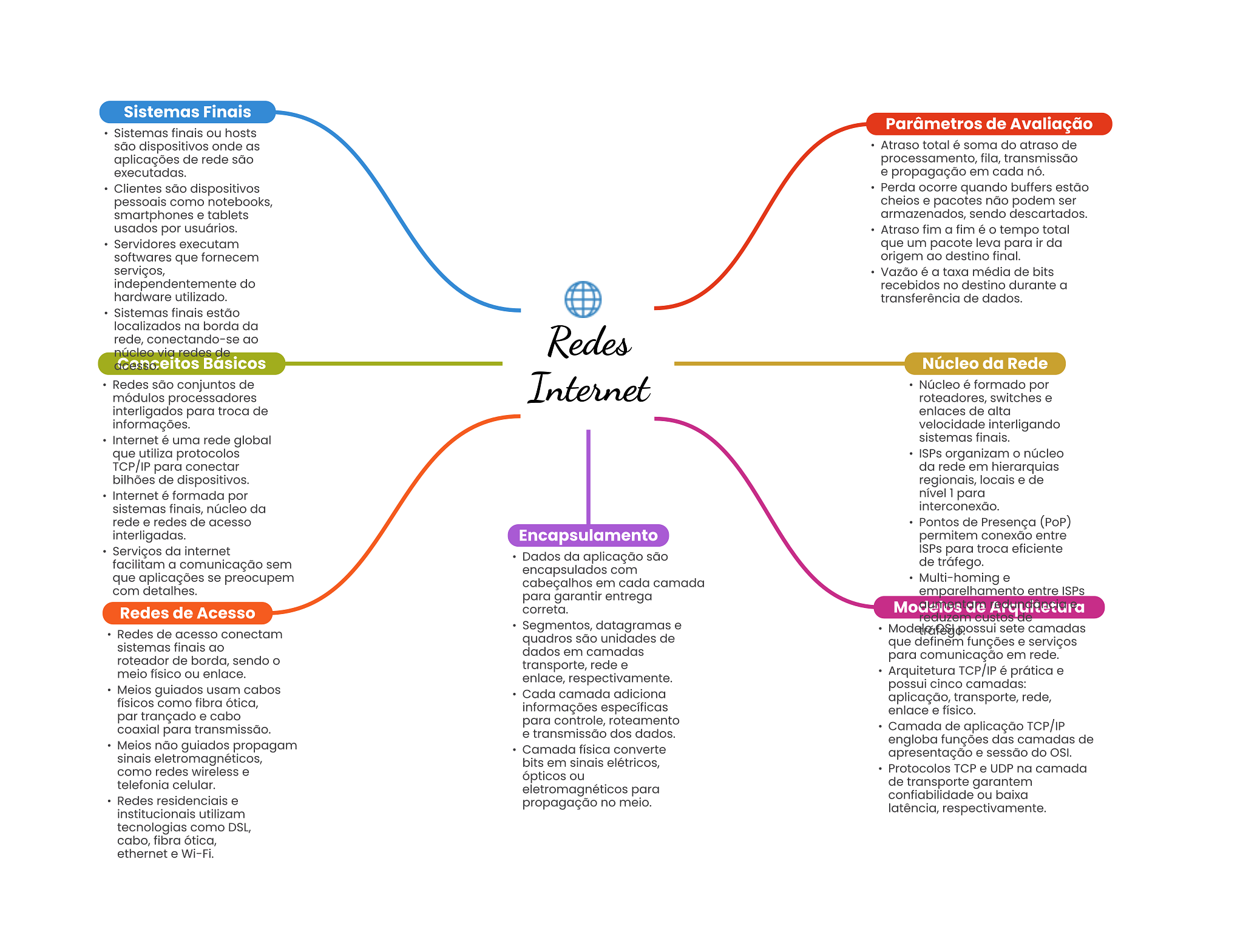 Sistemas Finais Parâmetros de Avaliação Sistemas finais ou hosts são dispositivos onde as Atraso total é soma do atraso de aplicações de rede são processamento, fila, transmissão executadas. e propagação em cada nó. Clientes são dispositivos Perda ocorre quando buffers estão pessoais como notebooks, cheios e pacotes não podem ser smartphones e tablets armazenados, sendo descartados. usados por usuários. Atraso fim a fim é tempo total Servidores executam que um pacote leva para ir da softwares que fornecem origem ao destino final. serviços, Vazão é a taxa média de bits independentemente do recebidos no destino durante a hardware utilizado. transferência de dados. Sistemas finais estão localizados na borda da rede, conectando-se ao núcleo via redes de Redes Básicos Núcleo da Rede Redes são conjuntos de módulos processadores Internet Núcleo é formado por roteadores, switches e interligados para troca de enlaces de alta informações. velocidade interligando Internet é uma rede global sistemas finais. que utiliza protocolos ISPs organizam núcleo TCP/IP para conectar da rede em hierarquias bilhões de dispositivos. regionais, locais e de Internet é formada por nível 1 para sistemas finais, núcleo da interconexão. rede e redes de acesso Pontos de Presença (POP) interligadas. Encapsulamento permitem conexão entre Serviços da internet ISPs para troca eficiente Dados da aplicação são facilitam a comunicação sem de tráfego. encapsulados com que aplicações se preocupem cabeçalhos em cada camada Multi-homing e com detalhes. para garantir entrega emparelhamento entre ISPs Redes de Acesso correta. Modeles de custos Segmentos, datagramas e Redes de acesso conectam sete camadas quadros são unidades de sistemas finais ao que definem funções e serviços dados em camadas roteador de borda, sendo para comunicação em rede. transporte, rede e meio físico ou enlace. Arquitetura TCP/IP é prática e enlace, respectivamente. Meios guiados usam cabos possui cinco camadas: Cada camada adiciona físicos como fibra ótica, aplicação, transporte, rede, informações específicas enlace e físico. par trançado e cabo para controle, roteamento coaxial para transmissão. Camada de aplicação TCP/IP e transmissão dos dados. Meios não guiados propagam engloba funções das camadas de Camada física converte sinais eletromagnéticos, apresentação e sessão do OSI. bits em sinais elétricos, como redes wireless e Protocolos TCP e UDP na camada ópticos ou telefonia celular. de transporte garantem eletromagnéticos para Redes residenciais e confiabilidade ou baixa propagação no meio. institucionais utilizam latência, respectivamente. tecnologias como DSL, cabo, fibra ótica, ethernet e Wi-Fi.