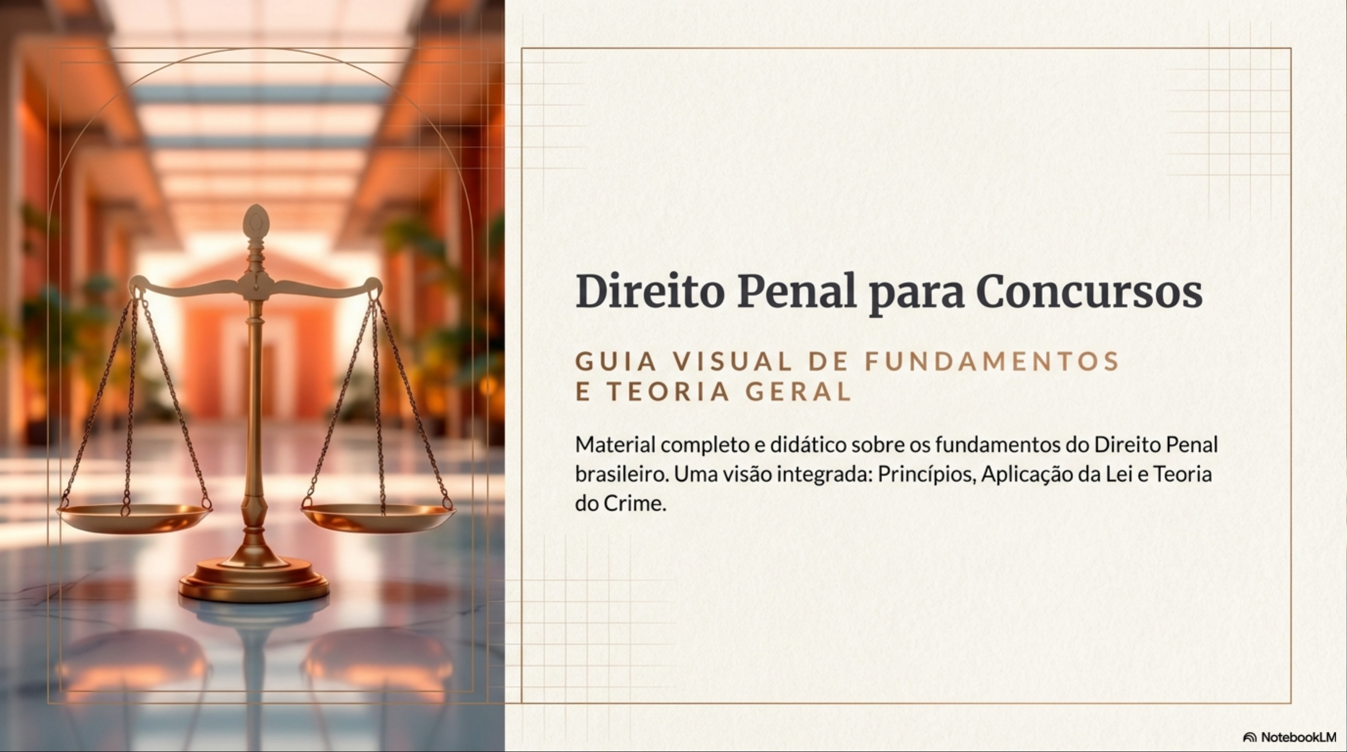Direito Penal para Concursos GUIA VISUAL DE FUNDAMENTOS E TEORIA GERAL Material completo e didático sobre os fundamentos do Direito Penal brasileiro. Uma visão integrada: Princípios, Aplicação da Lei e Teoria do Crime. NotebooFontes do Direito Penal Fonte Material Fontes Formais o Estado Imediata Mediatas Único legitimado a criar normas. A Lei (Sentido Estrito) Costumes e Princípios Cria crimes e penas Auxiliam na interpretação. (Princípio da Legalidade). IMPORTANTE: Medidas Provisórias NÃO podem criar crimes ou cominar ! penas (CF, art. 62, §1°, I, 'b'). NotebookLMPrincípios Basilares Legalidade Proporcionalidade Lesividade Não há crime sem lei A pena deve ser Não há crime sem efetiva anterior que defina, nem proporcional à gravidade lesão ou perigo de lesão a pena sem prévia cominação da infração. Evita excessos bem jurídico protegido. legal (CF, art. 5°, XXXIX). e insuficiências na resposta Pensamentos não são (Lato) penal. puníveis. NotebookLMMnemônico: Princípios Fundamentais L Legalidade (Nullum crimen, nulla poena sine lege) Intervenção Mínima (Direito Penal como ultima ratio) A Anterioridade (Lei deve ser anterior ao fato) H Humanidade (Vedação de penas cruéis) Ferramenta de memorização rápida para a prova. NotebookLMInterpretação e Analogia Métodos de Interpretação Analogia (Lacuna na Lei) Quanto ao sujeito: Autêntica, In Bonam Partem Doutrinária, Jurisprudencial. Favorável ao réu. PERMITIDA. Quanto ao resultado: Declarativa, Restritiva (reduz alcance), Extensiva (amplia alcance). In Malam Partem Prejudicial ao réu. PROIBIDA. (Viola a legalidade) NotebookLMLei Penal no Tempo: A Regra e a Exceção Lei Anterior Fato Criminoso Lei Nova Tempus regit actum Momento da conduta Publicação Scenario A Scenario Lei Mais Grave: Lei Mais Benéfica: IRRETROATIVIDADE. RETROATIVIDADE. NotebookLMSituações Especiais de Vigência Lei Temporária Lei Excepcional Abolitio Criminis Possui vigência fixada. Editada para emergências Lei nova descriminaliza a (guerra, calamidade). conduta. ULTRA-ATIVIDADE: Aplica-se aos fatos EFEITO: Extingue a praticados durante sua Segue regendo fatos punibilidade e todos os vigência, mesmo após ocorridos durante a efeitos penais da esta encerrar. durante a emergência. condenação. NotebookLMTempo VS. Lugar do Crime TEMPO (Quando?) LUGAR (Onde?) Teoria da Atividade (Art. 4°) Teoria da Ubiquidade (Art. 6°) Considera-se momento da Ação ou Considera-se lugar da Omissão. Ação/Omissão OU do Resultado. Irrelevante momento do resultado. Exemplo Prático: "A" atira em no Brasil, "B" morre na Argentina. crime ocorreu em ambos os países (Ubiquidade). NotebookLMLei Penal no Espaço A Regra: Territorialidade Aplica-se a lei brasileira aos crimes Mnemônico GAPE no território nacional (Art. 5°). (Incondicionada): Genocídio Administração Pública Presidente / Patrimônio da União A Exceção: Extraterritorialidade Estado (Serviço do) Aplicação da lei brasileira a crimes no estrangeiro (Art. 7°). NotebookLMConflito Aparente de Normas Processo de Filtro Especialidade Subsidiariedade Consunção A lei especial afasta a lei geral (Lex A lei subsidiária ("soldado de reserva") crime-fim absorve crime-meio. specialis derogat legi generali). só atua se não houver crime mais (Ex: furto da chave para roubar grave. carro). NotebookLMRegimes Especiais de Responsabilização Infrações de Menor Potencial (Lei 9.099/95) Crimes com pena máx. ≤ 2 anos + Contravenções. Medidas Despenalizadoras: Transação Penal, Suspensão Condicional, Composição Civil. Pessoa Jurídica Constitucionalmente prevista (CF, Art. 173 e 225). Crimes Ambientais e Econômicos. Requisitos: Previsão legal + Decisão de representante + Benefício da entidade.Crime Contravenção Penal Crime Contravenção Pena Privativa Reclusão ou Detenção Prisão Simples Tentativa Punível NÃO é punível Não se aplica lei Extraterritorialidade Possível (Art. 7° CP) brasileira fora do país NotebookLMTeoria Geral do Crime: Conceito Analítico 1 2 3 Fato Típico Ilícito Culpável Conduta + Resultado Antijuridicidade. Juízo de reprovação. + Nexo + Tipicidade. Contrariedade ao (O agente pode ser fato ocorreu?) ordenamento. punido?) (É permitido?) Para ser crime, 0 fato deve passar por estes três filtros cumulativos. NotebookLM1. Fato Típico: Conduta e Resultado Conduta Humana Dolo Culpa Direto (Quer o resultado) INI Eventual (Assume o risco). I Imprudência (Ação precipitada) N Negligência (Omissão de cuidado) I - Imperícia (Falta técnica) Nexo Causal Teoria da Equivalência (Causa é tudo sem qual resultado não ocorreria). NotebookLM2. Ilicitude Culpabilidade Excludentes de Ilicitude Elementos da Culpabilidade fato é permitido) agente é punível) Legítima Defesa Imputabilidade Estado de Necessidade (Maioridade/Sanidade) Estrito Cumprimento do Potencial Consciência da Dever Legal Ilicitude Exercício Regular de Direito Exigibilidade de Conduta Diversa Atenção: excesso é punível. NotebookLM