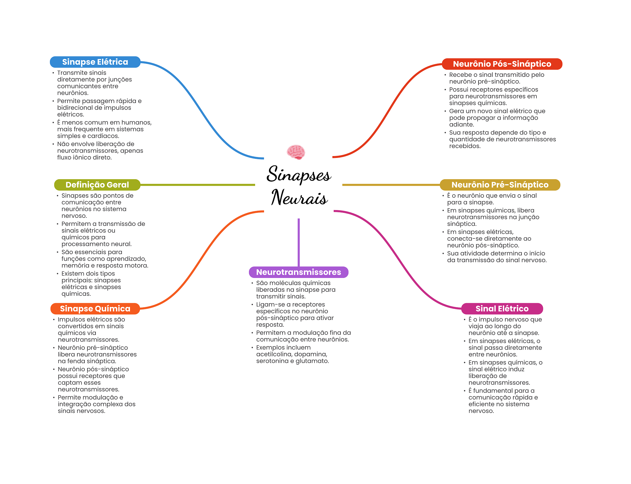 Sinapse Elétrica Neurônio Pós-Sináptico Transmite sinais Recebe sinal transmitido pelo diretamente por junções neurônio pré-sináptico. comunicantes entre neurônios. Possui receptores específicos para neurotransmissores em Permite passagem rápida e sinapses químicas. bidirecional de impulsos elétricos. Gera um novo sinal elétrico que pode propagar a informação É menos comum em humanos, adiante. mais frequente em sistemas simples e cardíacos. Sua resposta depende do tipo e quantidade de neurotransmissores Não envolve liberação de recebidos. neurotransmissores, apenas fluxo iônico direto. Sinapses Definição Geral Neurônio Pré-Sináptico Sinapses são pontos de Neurais É neurônio que envia sinal comunicação entre para a sinapse. neurônios no sistema Em sinapses químicas, libera nervoso. neurotransmissores na junção Permitem a transmissão de sináptica. sinais elétricos ou Em sinapses elétricas, químicos para conecta-se diretamente ao processamento neural. neurônio pós-sináptico. São essenciais para Sua atividade determina início funções como aprendizado, da transmissão do sinal nervoso. memória e resposta motora. Existem dois tipos Neurotransmissores principais: sinapses São moléculas químicas elétricas e sinapses liberadas na sinapse para químicas. transmitir sinais. Sinapse Química Ligam-se a receptores específicos no neurônio Sinal Elétrico Impulsos elétricos são pós-sináptico para ativar É impulso nervoso que convertidos em sinais resposta. viaja ao longo do químicos via Permitem a modulação fina da neurônio até a sinapse. neurotransmissores. comunicação entre neurônios. Em sinapses elétricas, Neurônio pré-sináptico Exemplos incluem sinal passa diretamente libera neurotransmissores acetilcolina, dopamina, entre neurônios. na fenda sináptica. serotonina e glutamato. Em sinapses químicas, Neurônio pós-sináptico sinal elétrico induz possui receptores que liberação de captam esses neurotransmissores. neurotransmissores. É fundamental para a Permite modulação e comunicação rápida e integração complexa dos eficiente no sistema sinais nervosos. nervoso.