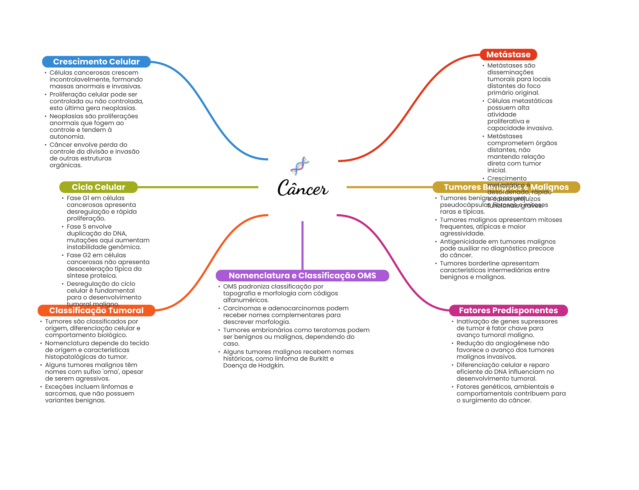 Metástase Crescimento Celular Metástases são Células cancerosas crescem disseminações incontrolavelmente, formando tumorais para locais massas anormais e invasivas. distantes do foco Proliferação celular pode ser primário original. controlada ou não controlada, Células metastáticas esta última gera neoplasias. possuem alta Neoplasias são proliferações atividade anormais que fogem ao proliferativa e controle e tendem à capacidade invasiva. autonomia. Metástases Câncer envolve perda do comprometem órgãos controle da divisão e invasão distantes, não de outras estruturas mantendo relação orgânicas. direta com tumor inicial. Crescimento Ciclo Celular Câncer Tumores Malignos desordenado, Fase em células Tumores cancerosas apresenta desregulação e rápida raras e típicas. proliferação. Tumores malignos apresentam mitoses Fase S envolve frequentes, atípicas e maior duplicação do DNA, agressividade. mutações aqui aumentam Antigenicidade em tumores malignos instabilidade genômica. pode auxiliar no diagnóstico precoce Fase G2 em células do câncer. cancerosas não apresenta Tumores borderline apresentam desaceleração típica da características intermediárias entre síntese proteica. Nomenclatura e Classificação OMS benignos e malignos. Desregulação do ciclo OMS padroniza classificação por celular é fundamental topografia e morfologia com códigos para O desenvolvimento alfanuméricos. tumoral maligno Classificação Tumoral Carcinomas e adenocarcinomas podem Fatores Predisponentes receber nomes complementares para Tumores são classificados por descrever morfologia. Inativação de genes supressores origem, diferenciação celular e Tumores embrionários como teratomas podem de tumor é fator chave para comportamento biológico. ser benignos ou malignos, dependendo do avanço tumoral maligno. Nomenclatura depende do tecido caso. Redução da angiogênese não de origem e características Alguns tumores malignos recebem nomes favorece avanço dos tumores histopatológicas do tumor. históricos, como linfoma de Burkitt e malignos invasivos. Alguns tumores malignos têm Doença de Hodgkin. Diferenciação celular e reparo nomes com sufixo 'oma', apesar eficiente do DNA influenciam no de serem agressivos. desenvolvimento tumoral. Exceções incluem linfomas e Fatores genéticos, ambientais e sarcomas, que não possuem comportamentais contribuem para variantes benignas. surgimento do câncer.