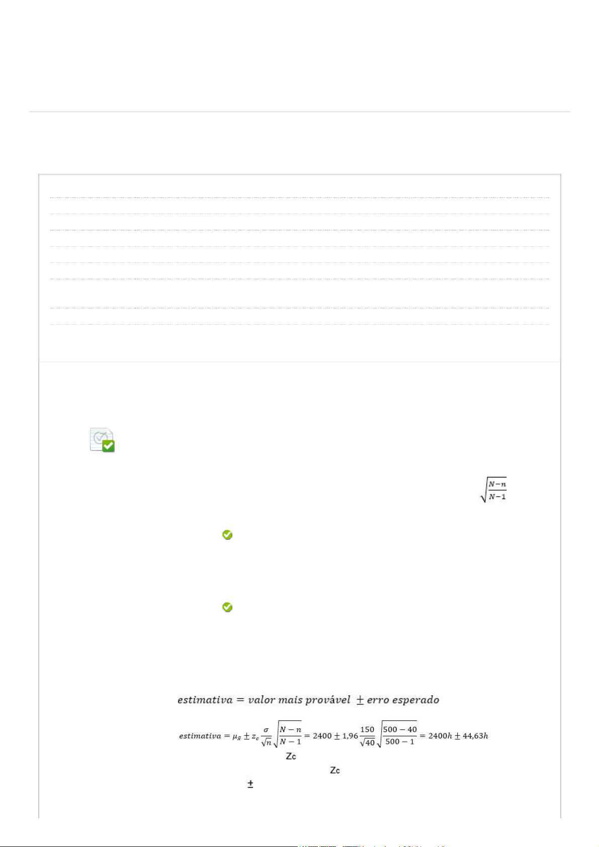 26/04/2022 15:39 Revisar envio do teste: QUESTIONÁRIO UNIDADE II – ... https://ava.ead.unip.br/webapps/assessment/review/review.jsp?attempt_id=_79496152_1&course_id=_216503_1&content_id=_2673957_1&retur… 1/8 Revisar envio do teste: QUESTIONÁRIO UNIDADE II ESTATÍSTICA APLICADA 5390-60_59101_D_20221 CONTEÚDO Usuário priscila.tito @aluno.unip.br Curso ESTATÍSTICA APLICADA Teste QUESTIONÁRIO UNIDADE II Iniciado 26/04/22 15:38 Enviado 26/04/22 15:39 Status Completada Resultado da tentativa 3 em 3 pontos Tempo decorrido 1 minuto Resultados exibidos Todas as respostas, Respostas enviadas, Respostas corretas, Comentários, Perguntas respondidas incorretamente Pergunta 1 Resposta Selecionada: c. Respostas: a. b. c. d. e. Comentário da resposta: Uma empresa possui em estoque 500 lâmpadas especiais. Uma amostra de 40 delas é ensaiada e revela uma duração média de 2400 horas, com desvio padrão de 150 horas. Estimar a duração média das 460 lâmpadas restantes com 95% de con�abilidade. Dica: não se esquecer de que é uma amostra sem reposição. Usar fator de correção 2400 horas ± 45 horas. 2400 horas ± 150 horas. 2400 horas ± 75 horas. 2400 horas ± 45 horas. 2400 horas ± 38 horas. 2400 horas ± 47 horas. Resposta: C Comentário: qualquer estimativa é dada pela expressão: No caso da média sem reposição, a expressão �caria: Observar que o valor do é dado pelo nível de con�abilidade desejado. Para uma con�abilidade de 95%, o é igual a 1,95. Assim, a estimativa seria de 2400 h 45 h com 95% de con�abilidade. UNIP EAD BIBLIOTECAS MURAL DO ALUNO TUTORIAISCONTEÚDOS ACADÊMICOS 0,3 em 0,3 pontos http://company.blackboard.com/ https://ava.ead.unip.br/webapps/blackboard/execute/courseMain?course_id=_216503_1 https://ava.ead.unip.br/webapps/blackboard/content/listContent.jsp?course_id=_216503_1&content_id=_2672700_1&mode=reset https://ava.ead.unip.br/webapps/portal/execute/tabs/tabAction?tab_tab_group_id=_10_1 https://ava.ead.unip.br/webapps/portal/execute/tabs/tabAction?tab_tab_group_id=_27_1 https://ava.ead.unip.br/webapps/portal/execute/tabs/tabAction?tab_tab_group_id=_47_1 https://ava.ead.unip.br/webapps/portal/execute/tabs/tabAction?tab_tab_group_id=_29_1 https://ava.ead.unip.br/webapps/portal/execute/tabs/tabAction?tab_tab_group_id=_25_1 https://ava.ead.unip.br/webapps/login/?action=logout 26/04/2022 15:39 Revisar envio do teste: QUESTIONÁRIO UNIDADE II – ... https://ava.ead.unip.br/webapps/assessment/review/review.jsp?attempt_id=_79496152_1&course_id=_216503_1&content_id=_2673957_1&retur… 2/8 Pergunta 2 Resposta Selecionada: c. Respostas: a. b. c. d. e. Comentário da resposta: Uma pesquisa eleitoral com 3000 eleitores revelou uma intenção de voto no candidato João Honesto de 46%. Caso a eleição fosse hoje, qual seria a estimativa que poderíamos fazer com 95% de con�abilidade? 46% 1,8%. 46% 1,4%. 46% 1,6%. 46% 1,8%. 46% 2,0%. 46% 2,2%. Resposta: C Comentário: qualquer estimativa é dada pela expressão: No caso da proporção, a expressão �caria: Observar que o valor do é dado pelo nível de con�abilidade desejado. Para uma con�abilidade de 95%, o é igual a 1,95. Assim, a estimativa seria de 46% 1,8% com 95% de con�abilidade. Pergunta 3 Resposta Selecionada: b. Respostas: a. b. c. d. e. Duas empresas de telemarketing semelhantes atenderam recentemente 50 e 100 clientes, respectivamente. A primeira empresa apresentou um tempo médio de atendimento de 0,782 horas com desvio padrão de 0,024 horas. Já na segunda empresa, o tempo médio de atendimento foi de 0,675 horas com desvio padrão de 0,030 horas. Estimar com 98% de con�ança a diferença do tempo médio de atendimento entre as duas empresas. 0,107h 0,011h. 0,107h 0,110h. 0,107h 0,011h. 0,107h 0,013h. 0,107h 0,120h. 0,107h 0,018h. 0,3 em 0,3 pontos 0,3 em 0,3 pontos 26/04/2022 15:39 Revisar envio do teste: QUESTIONÁRIO UNIDADE II – ... https://ava.ead.unip.br/webapps/assessment/review/review.jsp?attempt_id=_79496152_1&course_id=_216503_1&content_id=_2673957_1&retur… 3/8 Comentário da resposta: Resposta: B Comentário: qualquer estimativa é dada pela expressão: No caso da diferença de médias, a expressão �caria: Observar que o valor do é dado pelo nível de con�abilidade desejado. Para uma con�abilidade de 98%, o é igual a 2,33. Assim, a estimativa seria de 0,107h 0,011h com 98% de con�abilidade. Pergunta 4 Resposta Selecionada: d. Respostas: a. b. c. d. e. Comentário da resposta: O departamento de Recursos Humanos de uma empresa precisa estimar a quantidade média de horas de treinamento necessárias para determinado cargo hierárquico. Por norma está estabelecido que o erro máximo que essa estimativa pode ter é de 3 horas com 90% se con�abilidade. O desvio padrão das horas de treinamento é conhecido, de estudos anteriores e vale 20 horas. Qual o tamanho mínimo de funcionários que a empresa deve coletar para essa amostragem? 120 funcionários. 100 funcionários. 110 funcionários. 115 funcionários. 120 funcionários. 135 funcionários. Resposta: D Comentário: o erro esperado é dado por: Substituindo na expressão os valores conhecidos, teríamos: Observar que o valor do é dado pelo nível de con�abilidade desejado. Para uma con�abilidade de 90%, o é igual a 1,64. Assim, o tamanho da amostra deveria ser de 120 funcionários. Pergunta 5 Uma empresa de pesquisas está iniciando um estudo sobre o consumo de um determinado produto alimentício. Seu cliente deseja que a estimativa tenha uma probabilidade de 92% de não se desviar mais de 4% do valor verdadeiro. Qual deve ser o tamanho da amostra? 0,3 em 0,3 pontos 0,3 em 0,3 pontos 26/04/2022 15:39 Revisar envio do teste: QUESTIONÁRIO UNIDADE II – ... https://ava.ead.unip.br/webapps/assessment/review/review.jsp?attempt_id=_79496152_1&course_id=_216503_1&content_id=_2673957_1&retur… 4/8 Resposta Selecionada: a. Respostas: a. b. c. d. e. Comentário da resposta: 479. 479. 450. 620. 500. 250