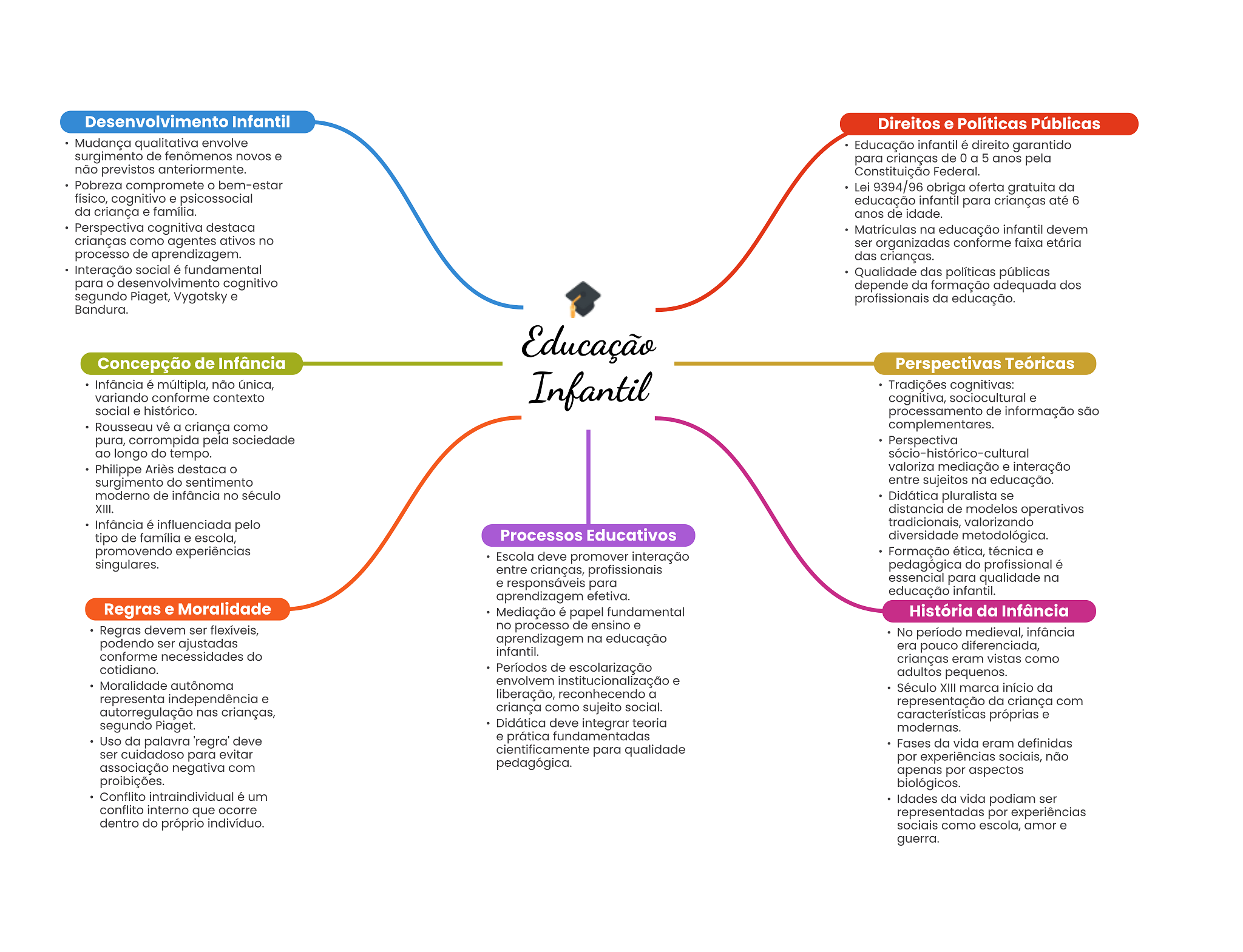 Desenvolvimento Infantil Direitos e Políticas Públicas Mudança qualitativa envolve Educação infantil é direito garantido surgimento de fenômenos novos e para crianças de 0 a 5 anos pela não previstos anteriormente. Constituição Federal. Pobreza compromete bem-estar Lei 9394/96 obriga oferta gratuita da físico, cognitivo e psicossocial educação infantil para crianças até 6 da criança e família. anos de idade. Perspectiva cognitiva destaca Matrículas na educação infantil devem crianças como agentes ativos no ser organizadas conforme faixa etária processo de aprendizagem. das crianças. Interação social é fundamental Qualidade das políticas públicas para desenvolvimento cognitivo depende da formação adequada dos segundo Piaget, Vygotsky e profissionais da educação. Bandura. Educação Concepção de Infância Perspectivas Teóricas Infância é múltipla, não única, Infantil Tradições cognitivas: variando conforme contexto cognitiva, sociocultural e social e histórico. processamento de informação são Rousseau vê a criança como complementares. pura, corrompida pela sociedade Perspectiva ao longo do tempo. sócio-histórico-cultural Philippe Ariès destaca valoriza mediação e interação surgimento do sentimento entre sujeitos na educação. moderno de infância no século Didática pluralista se XIII. distancia de modelos operativos Infância é influenciada pelo tradicionais, valorizando tipo de família e escola, Processos Educativos diversidade metodológica. promovendo experiências Escola deve promover interação Formação ética, técnica e singulares. entre crianças, profissionais pedagógica do profissional é e responsáveis para essencial para qualidade na aprendizagem efetiva. educação infantil. Regras e Moralidade Mediação é papel fundamental História da Infância Regras devem ser flexíveis, no processo de ensino e podendo ser ajustadas aprendizagem na educação No período medieval, infância conforme necessidades do infantil. era pouco diferenciada, crianças eram vistas como cotidiano. Períodos de escolarização adultos pequenos. Moralidade autônoma envolvem institucionalização e Século XIII marca início da representa independência e liberação, reconhecendo a autorregulação nas crianças, criança como sujeito social. representação da criança com características próprias e segundo Piaget. Didática deve integrar teoria modernas. Uso da palavra 'regra' deve e prática fundamentadas Fases da vida eram definidas ser cuidadoso para evitar cientificamente para qualidade associação negativa com pedagógica. por experiências sociais, não apenas por aspectos proibições. biológicos. Conflito intraindividual é um Idades da vida podiam ser conflito interno que ocorre representadas por experiências dentro do próprio indivíduo. sociais como escola, amor e guerra.