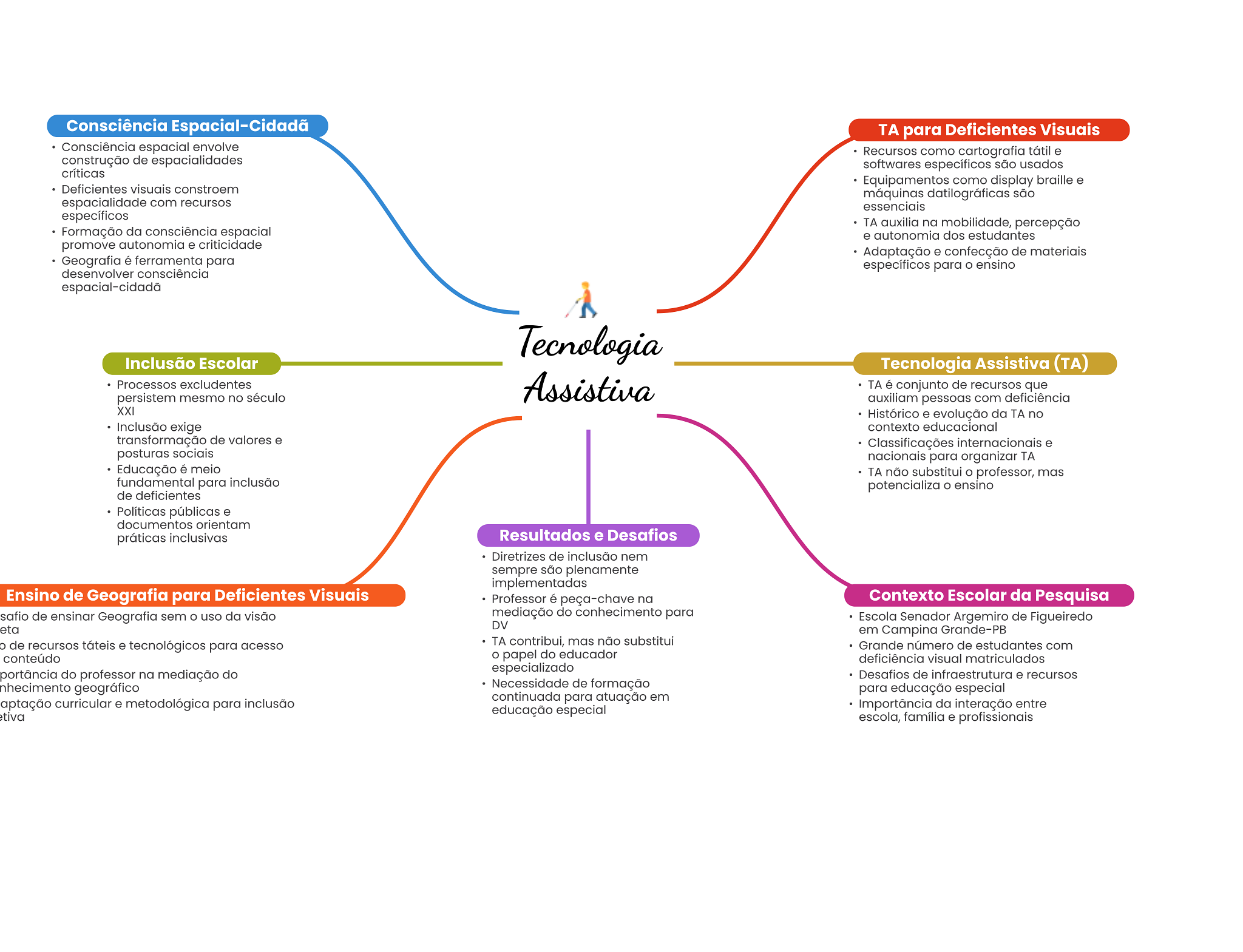 Consciência Espacial-Cidadã TA para Deficientes Visuais Consciência espacial envolve Recursos como cartografia tátil e construção de espacialidades softwares específicos são usados críticas Equipamentos como display braille e Deficientes visuais constroem máquinas datilográficas são espacialidade com recursos essenciais específicos TA auxilia na mobilidade, percepção Formação da consciência espacial e autonomia dos estudantes promove autonomia e criticidade Adaptação e confecção de materiais Geografia é ferramenta para específicos para ensino desenvolver consciência espacial-cidadã Tecnologia Inclusão Escolar Tecnologia Assistiva (TA) Processos excludentes persistem mesmo no século Assistiva TA é conjunto de recursos que auxiliam pessoas com deficiência XXI Histórico e evolução da TA no Inclusão exige contexto educacional transformação de valores e Classificações internacionais e posturas sociais nacionais para organizar TA Educação é meio TA não substitui O professor, mas fundamental para inclusão potencializa o ensino de deficientes Políticas públicas e documentos orientam práticas inclusivas Resultados e Desafios Diretrizes de inclusão nem sempre são plenamente implementadas Ensino de Geografia para Deficientes Visuais Professor é peça-chave na Contexto Escolar da Pesquisa safio de ensinar Geografia sem uso da visão mediação do conhecimento para Escola Senador Argemiro de Figueiredo DV em Campina Grande-PB de recursos táteis e tecnológicos para acesso TA contribui, mas não substitui Grande número de estudantes com conteúdo papel do educador deficiência visual matriculados portância do professor na mediação do especializado Desafios de infraestrutura e recursos nhecimento geográfico Necessidade de formação para educação especial aptação curricular e metodológica para inclusão continuada para atuação em educação especial Importância da interação entre escola, família e profissionais