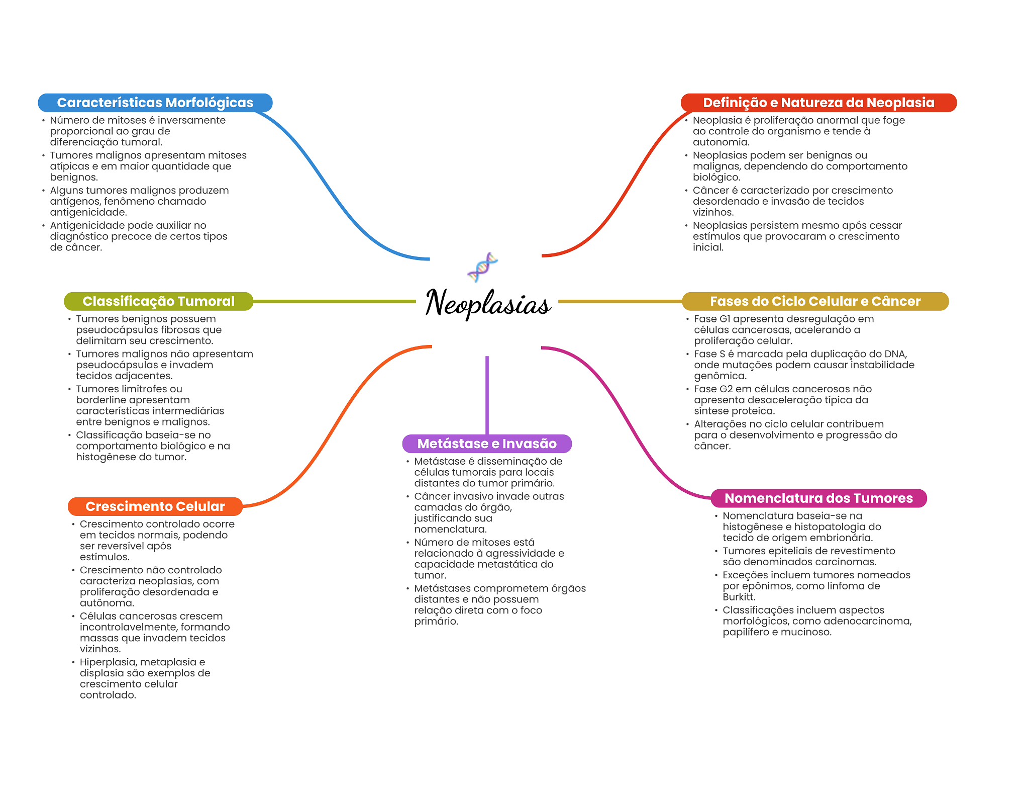 Características Morfológicas Definição e Natureza da Neoplasia Número de mitoses é inversamente Neoplasia é proliferação anormal que foge proporcional ao grau de ao controle do organismo e tende à diferenciação tumoral. autonomia. Tumores malignos apresentam mitoses Neoplasias podem ser benignas ou atípicas e em maior quantidade que malignas, dependendo do comportamento benignos. biológico. Alguns tumores malignos produzem Câncer é caracterizado por crescimento antígenos, fenômeno chamado desordenado e invasão de tecidos antigenicidade. vizinhos. Antigenicidade pode auxiliar no Neoplasias persistem mesmo após cessar diagnóstico precoce de certos tipos estímulos que provocaram crescimento de câncer. inicial. Classificação Tumoral Neoplasias Fases do Ciclo Celular e Câncer Tumores benignos possuem Fase G1 apresenta desregulação em pseudocápsulas fibrosas que células cancerosas, acelerando a delimitam seu crescimento. proliferação celular. Tumores malignos não apresentam Fase S é marcada pela duplicação do DNA, pseudocápsulas e invadem onde mutações podem causar instabilidade tecidos adjacentes. genômica. Tumores limítrofes ou Fase G2 em células cancerosas não borderline apresentam apresenta desaceleração típica da características intermediárias síntese proteica. entre benignos e malignos. Alterações no ciclo celular contribuem Classificação baseia-se no para e progressão do comportamento biológico e na Metástase e Invasão câncer. histogênese do tumor. Metástase é disseminação de células tumorais para locais distantes do tumor primário. Câncer invasivo invade outras Nomenclatura dos Tumores Crescimento Celular camadas do órgão, justificando sua Nomenclatura baseia-se na Crescimento controlado ocorre nomenclatura. histogênese e histopatologia do em tecidos normais, podendo ser reversível após Número de mitoses está tecido de origem embrionária. estímulos. relacionado à agressividade e Tumores epiteliais de revestimento capacidade metastática do são denominados carcinomas. Crescimento não controlado tumor. Exceções incluem tumores nomeados caracteriza neoplasias, com proliferação desordenada e Metástases comprometem órgãos por epônimos, como linfoma de autônoma. distantes e não possuem Burkitt. Células cancerosas crescem relação direta com O foco Classificações incluem aspectos incontrolavelmente, formando primário. morfológicos, como adenocarcinoma, e mucinoso. massas que invadem tecidos vizinhos. Hiperplasia, metaplasia e displasia são exemplos de crescimento celular controlado.