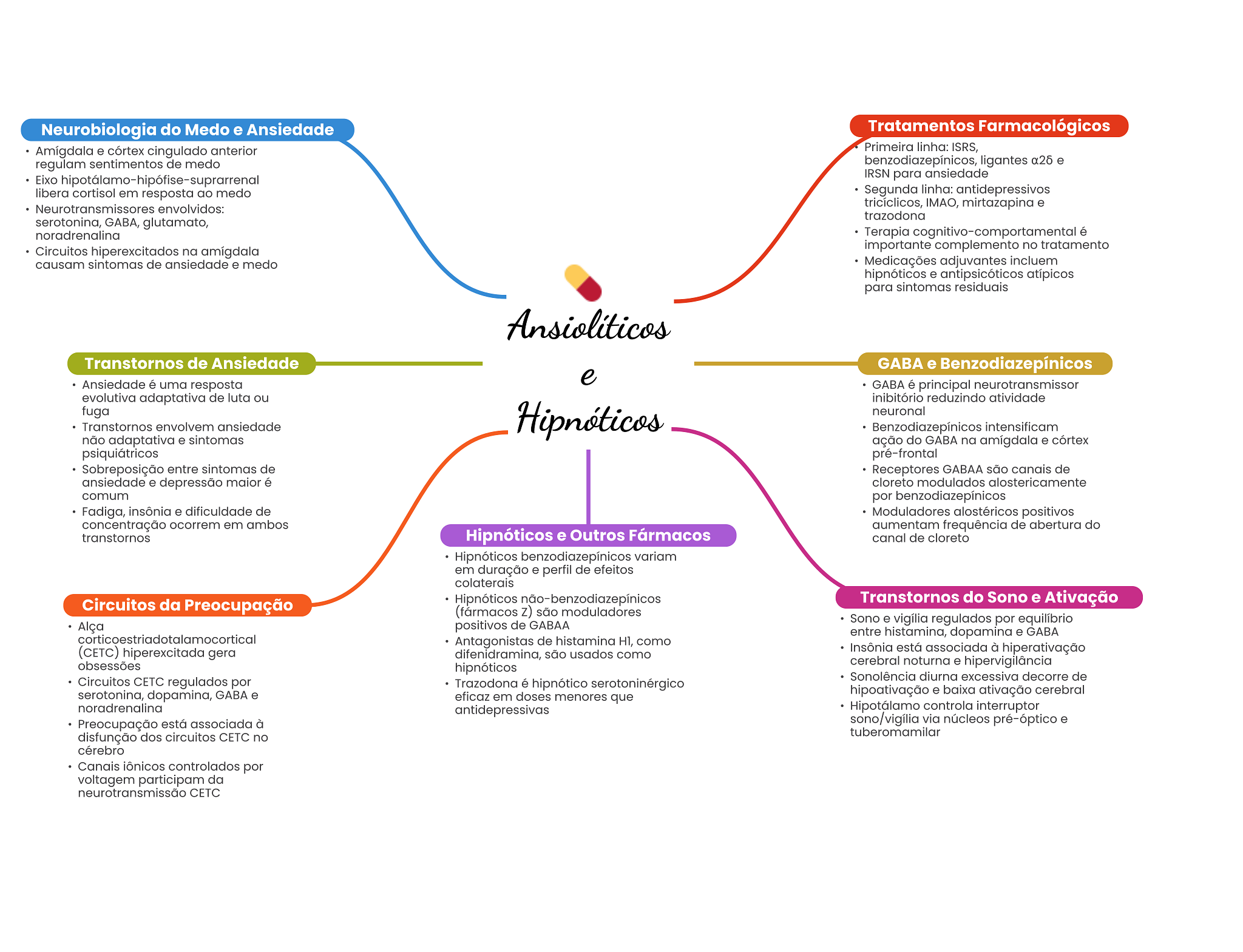 Neurobiologia do Medo e Ansiedade Tratamentos Farmacológicos Amígdala e córtex cingulado anterior Primeira linha: ISRS, regulam sentimentos de medo benzodiazepínicos, ligantes e Eixo hipotálamo-hipófise-suprarrenal IRSN para ansiedade libera cortisol em resposta ao medo Segunda linha: antidepressivos Neurotransmissores envolvidos: tricíclicos, IMAO, mirtazapina e trazodona serotonina, GABA, glutamato, noradrenalina Terapia cognitivo-comportamental é Circuitos hiperexcitados na amígdala importante complemento no tratamento causam sintomas de ansiedade e medo Medicações adjuvantes incluem hipnóticos e antipsicóticos atípicos para sintomas residuais Transtornos de Ansiedade GABA e Benzodiazepínicos Ansiedade é uma resposta e GABA é principal neurotransmissor evolutiva adaptativa de luta ou inibitório reduzindo atividade fuga Hipnóticos neuronal Transtornos envolvem ansiedade Benzodiazepínicos intensificam não adaptativa e sintomas ação do GABA na amígdala e córtex psiquiátricos pré-frontal Sobreposição entre sintomas de Receptores GABAA são canais de ansiedade e depressão maior é cloreto modulados alostericamente comum por benzodiazepínicos Fadiga, insônia e dificuldade de Moduladores alostéricos positivos concentração ocorrem em ambos aumentam frequência de abertura do transtornos Hipnóticos e Outros Fármacos canal de cloreto Hipnóticos benzodiazepínicos variam em duração e perfil de efeitos colaterais Circuitos da Preocupação Hipnóticos Transtornos do Sono e Ativação (fármacos z) são moduladores Alça positivos de GABAA Sono e vigília regulados por equilíbrio entre histamina, dopamina e GABA corticoestriadotalamocortical Antagonistas de histamina H1, como (CETC) hiperexcitada gera difenidramina, são usados como Insônia está associada à hiperativação obsessões hipnóticos cerebral noturna e hipervigilância Sonolência diurna excessiva decorre de Circuitos CETC regulados por Trazodona é hipnótico serotoninérgico serotonina, dopamina, GABA e eficaz em doses menores que hipoativação e baixa ativação cerebral noradrenalina antidepressivas Hipotálamo controla interruptor Preocupação está associada à sono/vigília via núcleos pré-óptico e disfunção dos circuitos CETC no tuberomamilar cérebro Canais iônicos controlados por voltagem participam da neurotransmissão CETC