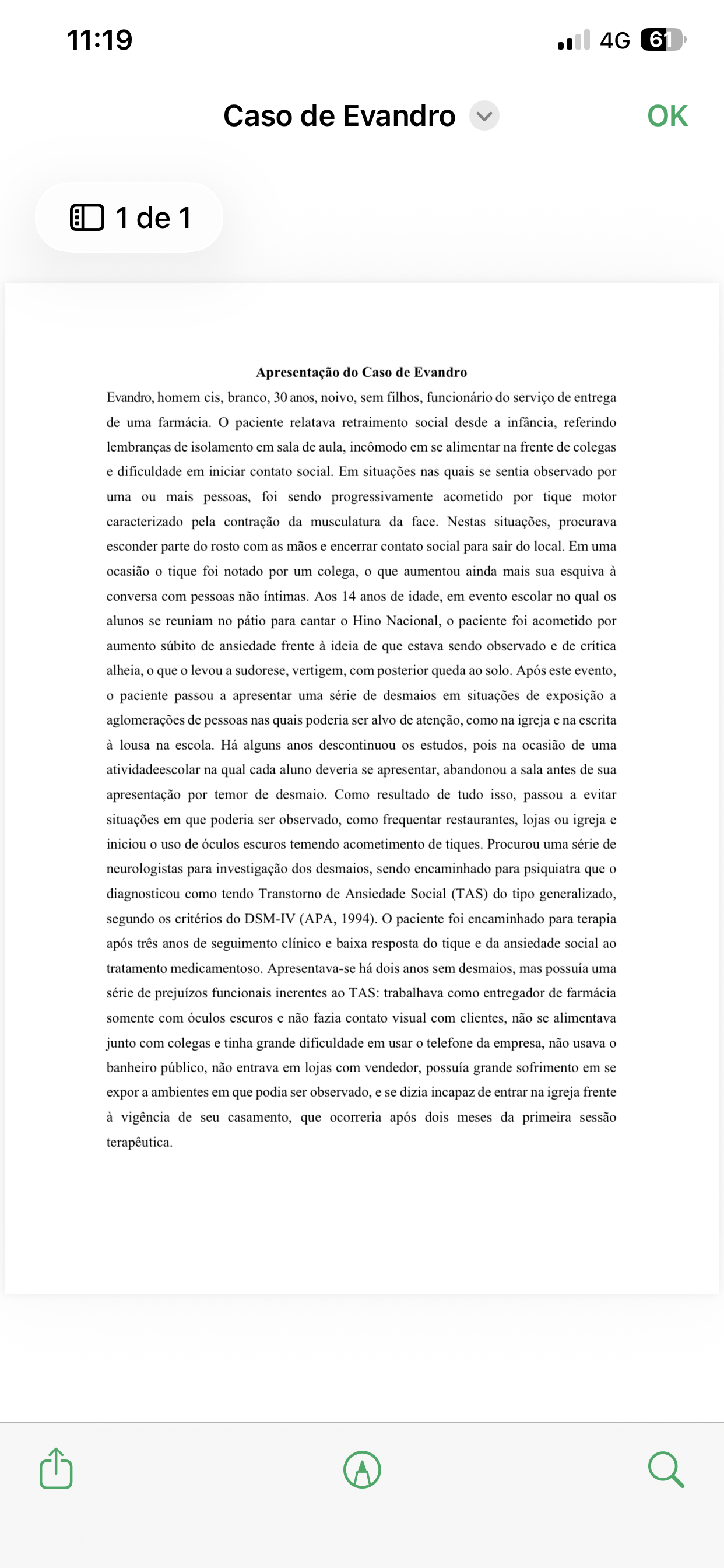 11:19 4G 6 Caso de Evandro OK 1 de 1 Apresentação do Caso de Evandro Evandro, homem cis, branco, 30 anos, noivo, sem filhos, funcionário do serviço de entrega de uma farmácia. paciente relatava retraimento social desde a infância, referindo lembranças de isolamento em sala de aula, incômodo em se alimentar na frente de colegas e dificuldade em iniciar contato social. Em situações nas quais se sentia observado por uma ou mais pessoas, foi sendo progressivamente acometido por tique motor caracterizado pela contração da musculatura da face. Nestas situações, procurava esconder parte do rosto com as mãos e encerrar contato social para sair do local. Em uma ocasião o tique foi notado por um colega, o que aumentou ainda mais sua esquiva à conversa com pessoas não íntimas. Aos 14 anos de idade, em evento escolar no qual os alunos se reuniam no pátio para cantar o Hino Nacional, o paciente foi acometido por aumento súbito de ansiedade frente à ideia de que estava sendo observado e de crítica alheia, o que o levou a sudorese, vertigem, com posterior queda ao solo. Após este evento, o paciente passou a apresentar uma série de desmaios em situações de exposição a aglomerações de pessoas nas quais poderia ser alvo de atenção, como na igreja e na escrita à lousa na escola. Há alguns anos descontinuou os estudos, pois na ocasião de uma atividadeescolar na qual cada aluno deveria se apresentar, abandonou a sala antes de sua apresentação por temor de desmaio. Como resultado de tudo isso, passou a evitar situações em que poderia ser observado, como frequentar restaurantes, lojas ou igreja e iniciou o uso de óculos escuros temendo acometimento de tiques. Procurou uma série de neurologistas para investigação dos desmaios, sendo encaminhado para psiquiatra que o diagnosticou como tendo Transtorno de Ansiedade Social (TAS) do tipo generalizado, segundo os critérios do DSM-IV (APA, 1994). o paciente foi encaminhado para terapia após três anos de seguimento clínico e baixa resposta do tique e da ansiedade social ao tratamento medicamentoso. Apresentava-se há dois anos sem desmaios, mas possuía uma série de prejuízos funcionais inerentes ao TAS: trabalhava como entregador de farmácia somente com óculos escuros e não fazia contato visual com clientes, não se alimentava junto com colegas e tinha grande dificuldade em usar o telefone da empresa, não usava o banheiro público, não entrava em lojas com vendedor, possuía grande sofrimento em se expor a ambientes em que podia ser observado, e se dizia incapaz de entrar na igreja frente à vigência de seu casamento, que ocorreria após dois meses da primeira sessão terapêutica. A