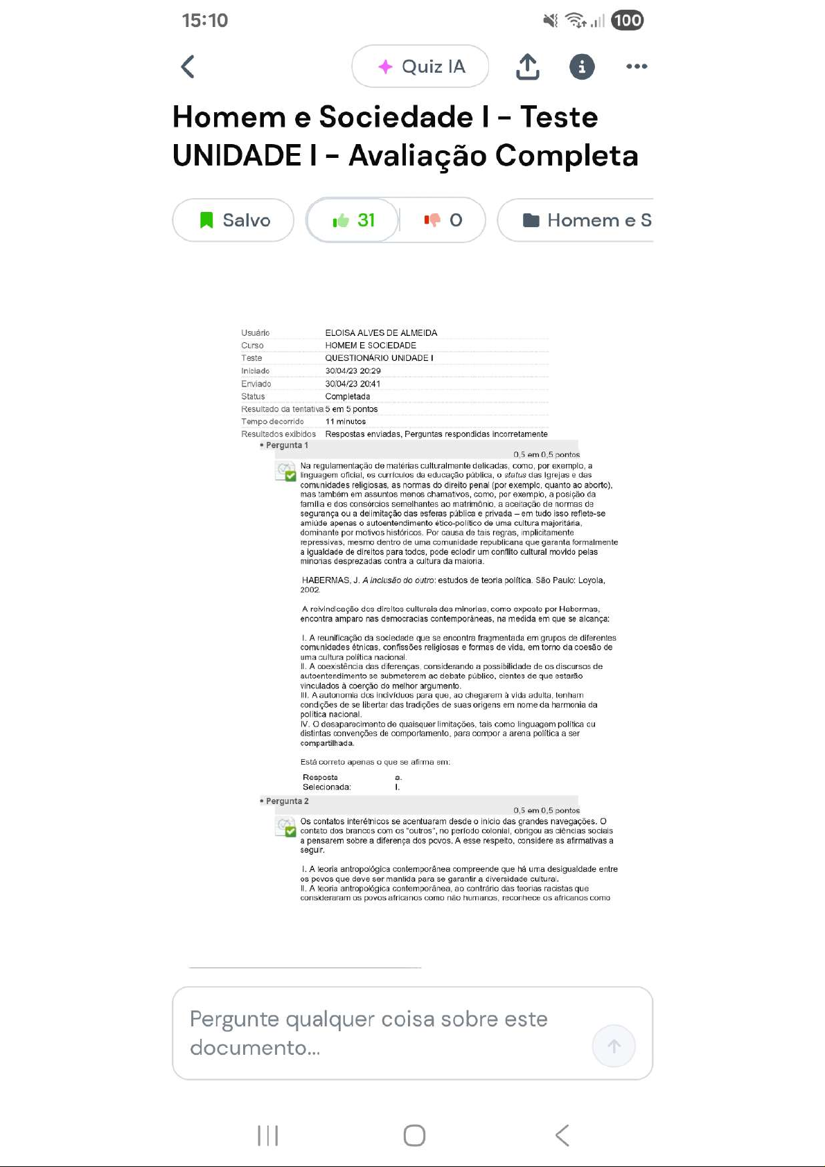 15:10 100 Quiz IA i Homem e Sociedade I - Teste UNIDADE I Avaliação Completa Salvo 31 Homem e S Usuário ELOISA ALVES DE ALMEIDA Curso HOMEM E SOCIEDADE Teste QUESTIONÁRIO UNIDADE I Iniciado 30/04/23 20:29 Enviado 30/04/23 20:41 Status Completada Resultado da tentativa 5 em 5 pontos Tempo decorrido 11 minutos Resultados exibidos Respostas enviadas, Perguntas respondidas incorretamente Pergunta 1 0,5 em pontos Na regulamentação de matérias culturalmente delicadas, como, por exemplo, a linguagem oficial, currículos da educação pública, status das Igrejas e das comunidades religiosas, as normas do direito penal (por exemplo, quanto ao mas também em assuntos menos chamativos, como, por exemplo, a posição da e dos consórcios semelhantes ao a aceitação de normas de segurança ou a delimitação das esferas pública e privada em tudo isso reflete-se amiúde apenas autoentendimento de uma cultura majoritária, dominante por motivos históricos. Por causa de tais regras, implicitamente mesmo dentro de uma comunidade republicana que garanta formalmente a igualdade de direitos para todos, pode eclodir um conflito cultural movido pelas minorias desprezadas contra a cultura da maioria. J. A inclusão do outro: estudos de teoria política. São Paulo: Loyola, 2002. A reivindicação dos direitos culturais das minorias, como exposto por Habermas, encontra amparo nas democracias na medida em que se alcança: A reunificação da sociedade que se encontra fragmentada em grupos de diferentes comunidades étnicas, confissões religiosas e formas de vida, em torno da coesão de uma cultura política nacional. A coexistência das diferenças, considerando a possibilidade de os discursos de autoentendimento se submeterem ao debate cientes de que estarão vinculados à coerção do melhor argumento. III. A autonomia dos indivíduos para ao chegarem à vida adulta, tenham condições de se libertar das tradições de suas origens em nome da harmonia da politica nacional. IV. desaparecimento de quaisquer limitações, tais como linguagem política ou distintas convenções de para compor a arena política a ser compartilhada. Está correto apenas que se afirma em: Resposta a. Selecionada: I. Pergunta 2 0,5 em 0,5 pontos Os contatos interétnicos se acentuaram desde início das grandes navegações. contato dos brancos com OS "outros", no período colonial, obrigou as ciências sociais a pensarem sobre a diferença dos povos. A esse considere as afirmativas a seguir. A teoria antropológica contemporânea compreende que há uma desigualdade entre povos que deve ser mantida para se garantir a diversidade cultural. A teoria antropológica ao contrário das teorias racistas que consideraram povos africanos como não humanos, reconhece africanos como Pergunte qualquer coisa sobre este documento...15:10 100 Quiz IA i povos como nao reconnece OS africanos como embora considere suas instituições como atrasadas. III. A teoria antropológica contemporânea não trabalha mais com a noção de evolução cultural, apesar de continuar reconhecendo que existem sociedades mais desenvolvidas que outras. IV. A teoria antropológica contemporânea compreende que há uma diversidade entre povos que não é passível de escalonamento evolutivo. Está correto apenas que se afirma em: Resposta Selecionada: e. IV. Pergunta 3 0,5 em 0,5 pontos Sabendo que, atualmente, no Brasil, mais de 200 povos vivem espalhados por todo território nacional, considere as afirmativas a seguir: I. Embora povos no Brasil possuam uma ampla diversidade étnica, todos são tecnologicamente atrasados. II. Os povos possuem histórias e culturas diversas, de modo que a hierarquização de etnias foi III. Os indios no Brasil devem ser assimilados pelo avanço da civilização ocidental. Está correto apenas que se afirma em: Resposta Selecionada: C. II. Pergunta 4 0,5 em pontos trecho abaixo foi extraído de um artigo de Marques e Domingues (2014) e faz um levantamento sobre as teses e dissertações que discutem a questão nacional no Brasil. "O futebol no Brasil foi instrumento de formação da nacionalidade e constituiu-se como um grande auxílio para a união das "raças" e das "classes Este esporte, que inicialmente era da elite brasileira, passou a ser um esporte popular a partir do período populista, e "[...] pode ser manipulado hoje como símbolo de unidade nacional e coesão racial e social." (OLIVEIRA, 50). futebol é considerado um elemento cultural e símbolo nacional justamente pelo fato de não se restringir apenas a uma parcela da diversidade que constitui Brasil. É através da representação social que nacionais surgem e se como carnaval e (MARQUES; DOMINGUES, 2014). Sobre texto acima, considere as afirmativas a seguir. futebol é considerado um nacional por apagar as diferenças culturais existentes no Brasil. futebol discurso da democracia racial no Brasil e, por isso, contribuiu para a construção da nacionalidade. III. futebol, assim como O carnaval e samba se constituem como símbolos nacionais porque expressam a diversidade que constitui Brasil. IV. futebol é importante na construção da nacionalidade brasileira porque atenua Pergunte qualquer coisa sobre este documento...15:10 100 Quiz IA i desigualdades sociais. Está incorreto apenas que se afirma em: Resposta a. Selecionada: IV. Pergunta 5 em 0.5 pontos Todo ser humano depende de seu aparelho biológico e cultural para sobreviver, neste sentido pode-se afirmar: ser humano é igual a todo e qualquer animal, no que diz respeito às suas habilidades de aprendizagem. Depende quase que exclusivamente de suas habilidades biológicas. II. ser humano se adapta ao meio Independentemente de sua convivência social com seus semelhantes. Sua aparelhagem biológica permite sua adaptação e sobrevivência. III. ser humano nasce com instintos que possibilitam sua adaptação ao meio e às adversidades ambientais. Está correto apenas que se afirma em: Resposta C. Selecionada: