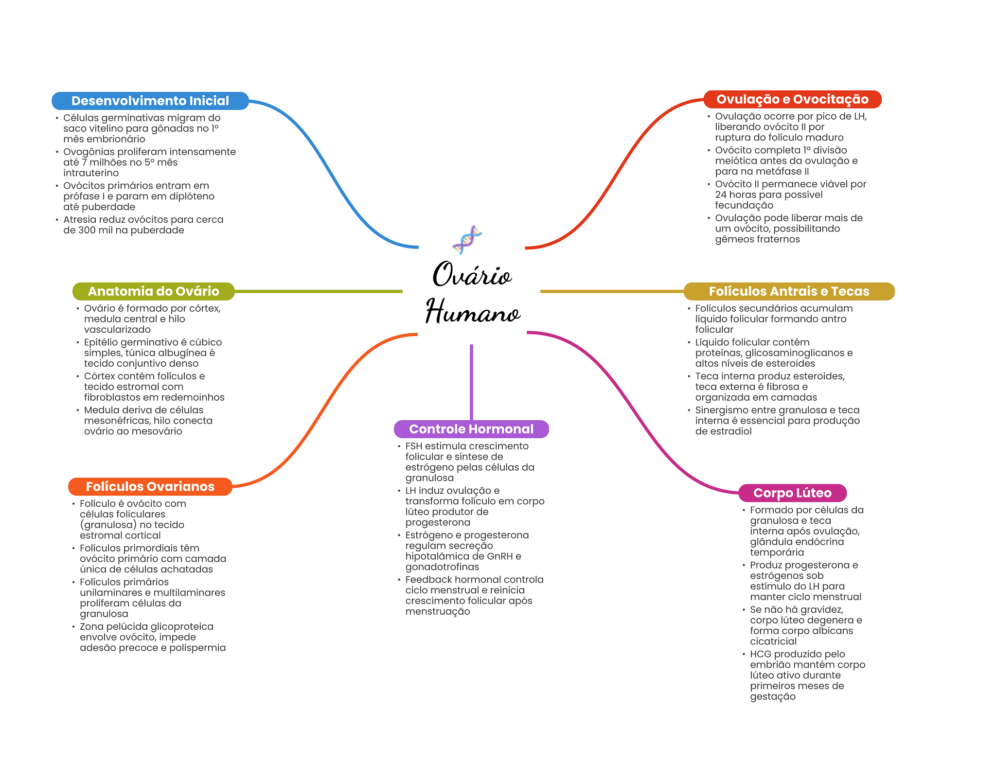 Desenvolvimento Inicial Ovulação e Ovocitação Células germinativas migram do Ovulação ocorre por pico de LH, saco vitelino para gônadas no liberando ovócito por mês embrionário ruptura do folículo maduro Ovogônias proliferam intensamente Ovócito completa divisão até 7 milhões no 5° mês meiótica antes da ovulação e intrauterino para na metáfase Ovócitos primários entram em Ovócito II permanece viável por prófase e param em diplóteno 24 horas para possível até puberdade fecundação Atresia reduz ovócitos para cerca Ovulação pode liberar mais de de 300 mil na puberdade um ovócito, possibilitando gêmeos fraternos Ovário Anatomia do Ovário Folículos Antrais e Tecas Ovário é formado por córtex, Humano Folículos secundários acumulam medula central e hilo líquido folicular formando antro vascularizado folicular Epitélio germinativo é cúbico Líquido folicular contém simples, túnica albugínea é proteínas, e tecido conjuntivo denso altos níveis de esteroides Córtex contém folículos e Teca interna produz esteroides, tecido estromal com teca externa é fibrosa e fibroblastos em redemoinhos organizada em camadas Medula deriva de células Sinergismo entre granulosa e teca mesonéfricas, hilo conecta interna é essencial para produção ovário ao mesovário Controle Hormonal de estradiol FSH estimula crescimento folicular e síntese de estrógeno pelas células da granulosa Folículos Ovarianos LH induz ovulação e Corpo Lúteo Folículo é ovócito com transforma folículo em corpo células foliculares lúteo produtor de Formado por células da (granulosa) no tecido progesterona granulosa e teca estromal cortical Estrógeno e progesterona interna após ovulação, Folículos primordiais têm regulam secreção glândula endócrina hipotalâmica de GnRH e temporária ovócito primário com camada única de células achatadas gonadotrofinas Produz progesterona e Folículos primários Feedback hormonal controla estrógenos sob unilaminares e multilaminares ciclo menstrual e reinicia estímulo do LH para proliferam células da crescimento folicular após manter ciclo menstrual granulosa menstruação Se não há gravidez, corpo lúteo degenera e Zona pelúcida glicoproteica forma corpo albicans envolve ovócito, impede cicatricial adesão precoce e polispermia HCG produzido pelo embrião mantém corpo lúteo ativo durante primeiros meses de gestação